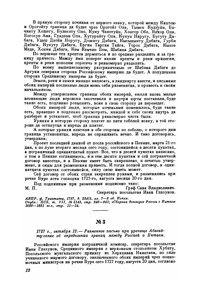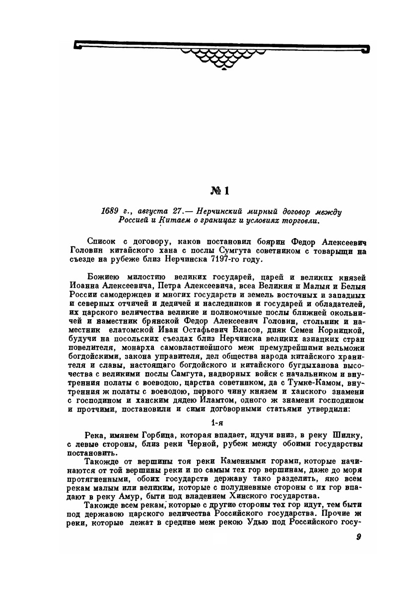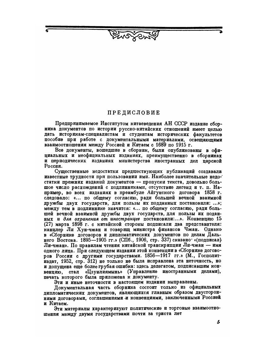 Предпринимаемое Институтом китаеведения АН СССР издание сборника документов по истории русско-китайских отношений имеет целью дать историкам-специалистам и студентам исторических факультетов пособие при работе с документальными материалами, освещающими взаимоотношения между Россией и Китаем с 1689 по 1915 г.Все документы, вошедшие в сборник, были опубликованы в официальных и неофициальных изданиях, преимущественно в сборниках и периодических изданиях министерства иностранных дел царской России.Среди документов XVII—XVIII вв. в сборнике представлены: Нерчинский договор 1689 г. (первый договор Китая не только с Россией, но и вообще с иностранным государством, в известной степени определивший характер русско-китайских отношений вплоть до середины XIX в.), Буринский и Кяхтинский трактаты и связанные с ними разменные письма, а также Международный акт 1792 г. Этими документами решались вопросы о границе, порядке дипломатических сношений и торговле.Особенно полно представлены в сборнике материалы второй половины XIX и начала XX в.— периода наибольшей активности царской России на Дальнем Востоке. Из известных документов, относящихся к этому времени, в сборник не включен лишь Ливадийский договор 1879 г., так как он не был ратифицирован и статьи его не получили практического применения.Соглашения России с другими державами, касающиеся Китая, вошли в приложение к сборнику.Этим сборником Институт китаеведения АН СССР кладет начало изданию документальных материалов, относящихся к истории русско-китайских отношений.