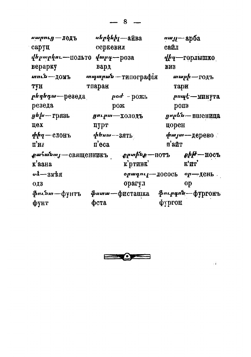 Печатная книга «Самоучитель живого армянского языка, или Руководство для изучения без помощи учителя читать, писать и говорить по-армянски» в мягкой обложке, язык - армянский. В книге 78 страниц, она напечатана на белой офсетной бумаге плотностью 80 г/м². Формат издания — 148x210 мм. Все книги аккуратно упаковываем в прочный трёхслойный непрозрачный картонный конверт.
