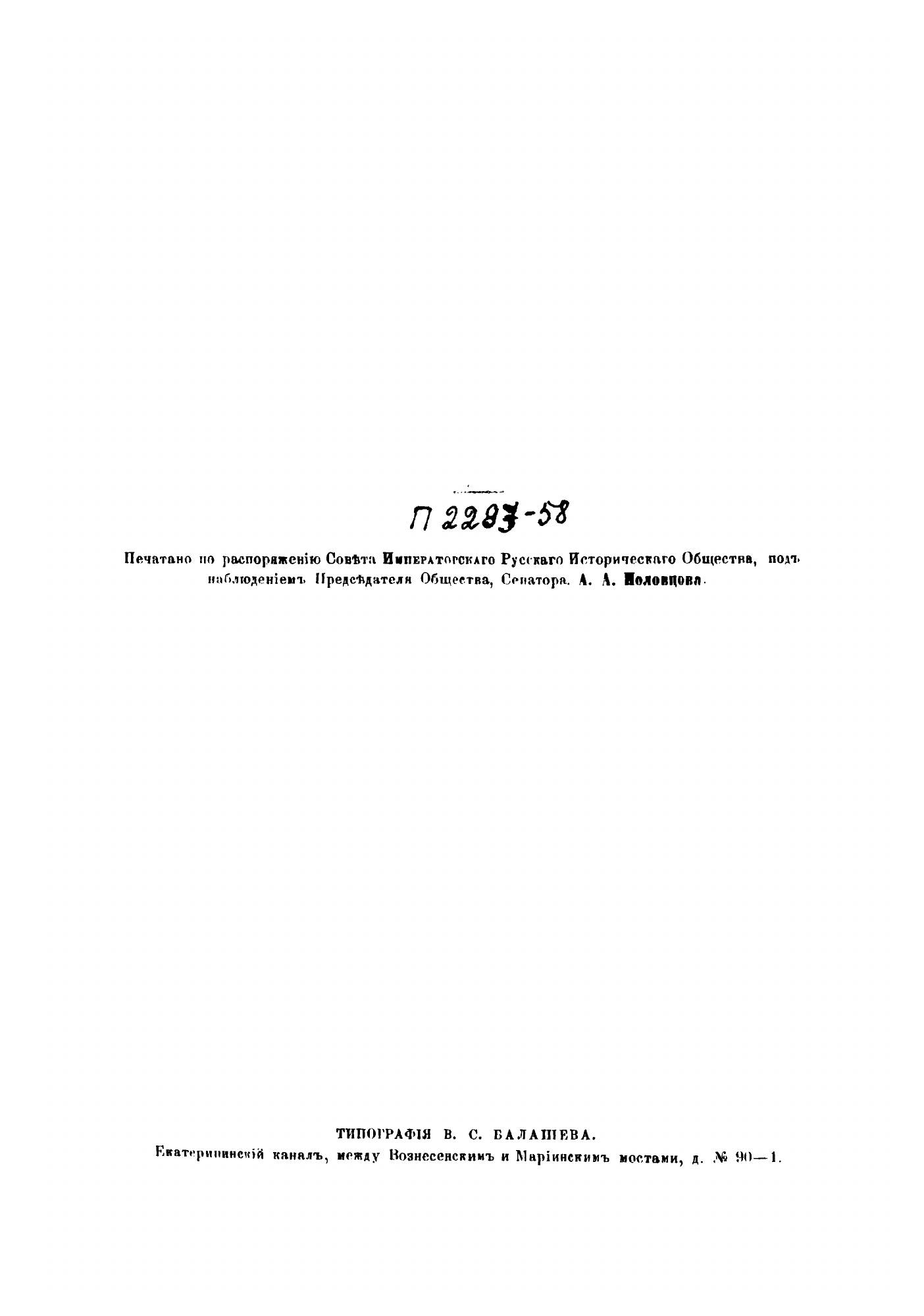 Императорское Русское историческое общество — общественная организация Российской империи в 1866—1917 годах, собиравшая, обрабатывавшая и публиковавшая материалы и документы, связанные с историей государства. Отобранные материалы публиковались в «Сборниках Русского Исторического Общества»: за 50 лет жизни общества было издано 148 томов. Обычно публиковались редкие или ранее неизвестные документы, свидетельствующие о неких исторических фактах.Канцлер князь Александр Андреевич Безбородко в связи с событиями его времени (годы с 1788 по 1799).Труд Н.И.Григоровича. С 2-мя гравюрами и планом. Том 2-й.
