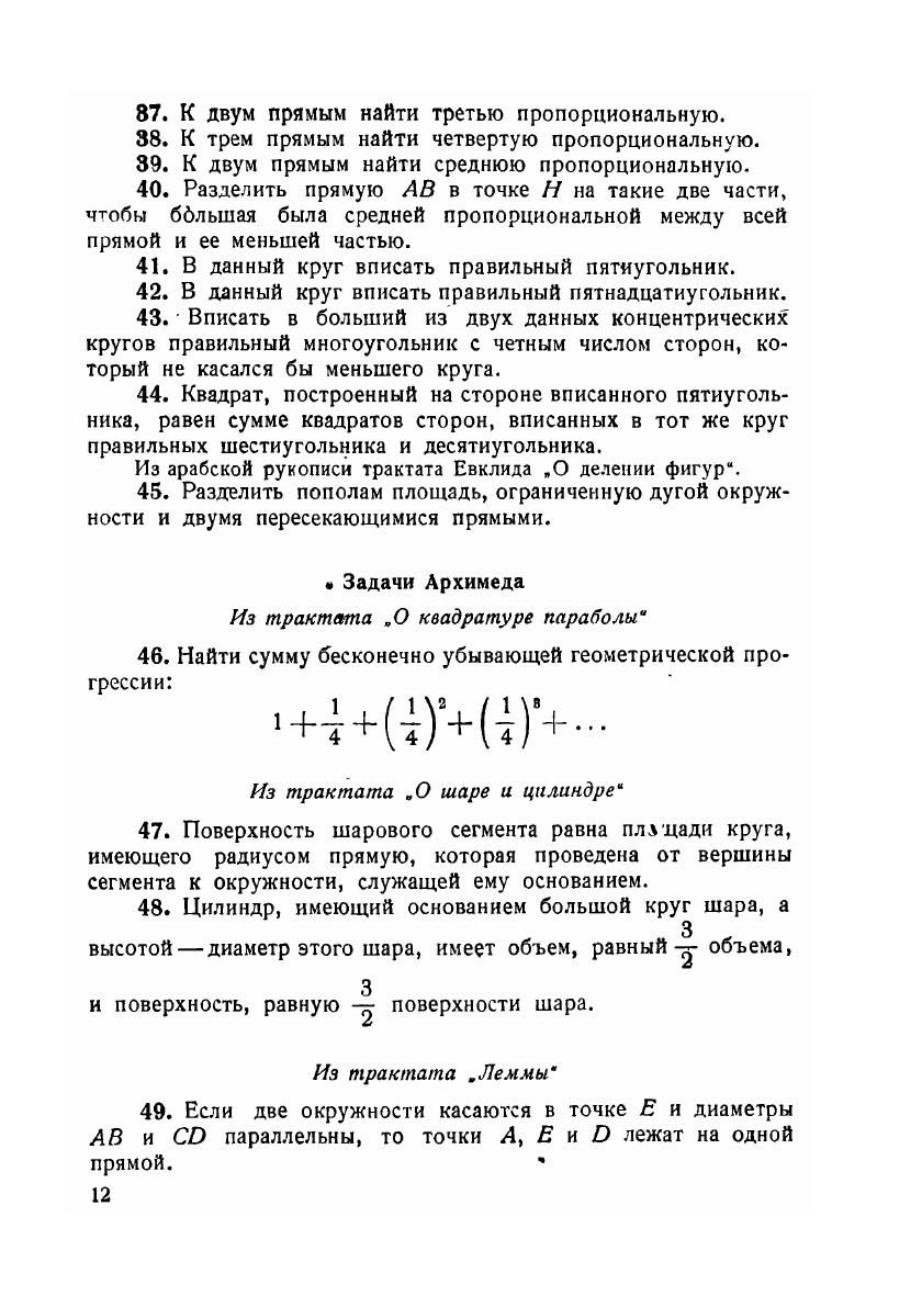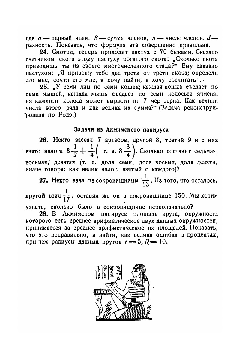 В этой книге читатель найдет интересные исторические задачи по арифметике, алгебре и геометрии, созданные народным творчеством древних египтян, вавилонян, греков, римлян, китайцев, индусов, евреев, арабов, а также великими европейскими учеными старого и нового времени. Разбирая эти задачи и решая их с помощью составителя книги, читатель усвоит важнейшие вехи в историческом развитии математики с древнейших времен до наших дней. Живой и наглядный характер задач, отражающих культурный уровень, экономический быт и идеологию создавших их народов, пробудит в юном читателе интерес к более глубокому изучению истории математики. Разъяснения, фактические справки, указания и библиография, подобранные составителем книги, дают для этого надежную руководящую нить. Школьные преподаватели и специалисты по математике также найдут в этой книге много ценного и свежего материала.