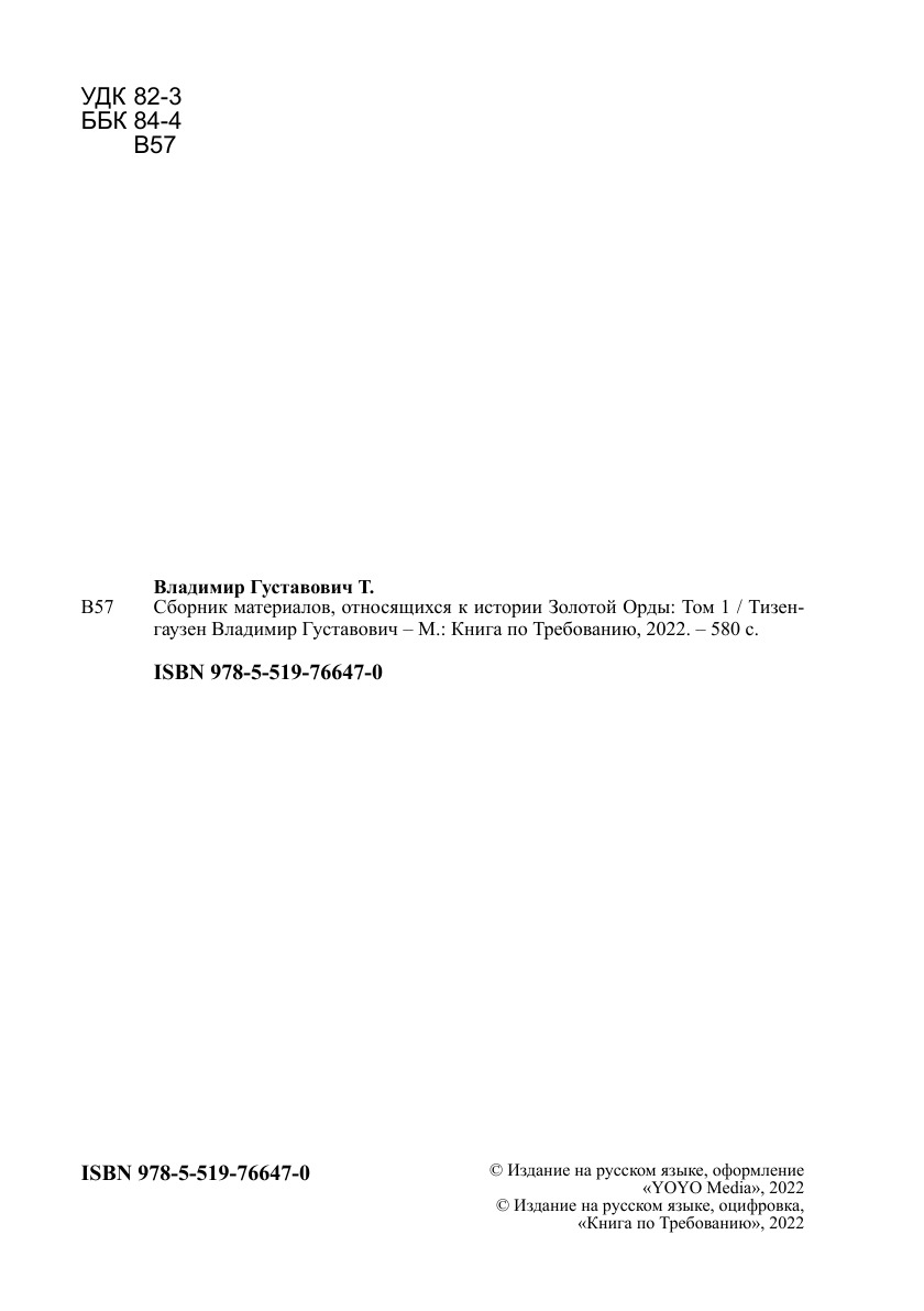 Печатная книга «Сборник материалов, относящихся к истории Золотой Орды, Том 1» в мягкой обложке, язык - русский. В книге 580 страниц, она напечатана на белой офсетной бумаге плотностью 80 г/м². Формат издания — 148x210 мм. Все книги аккуратно упаковываем в прочный трёхслойный непрозрачный картонный конверт.