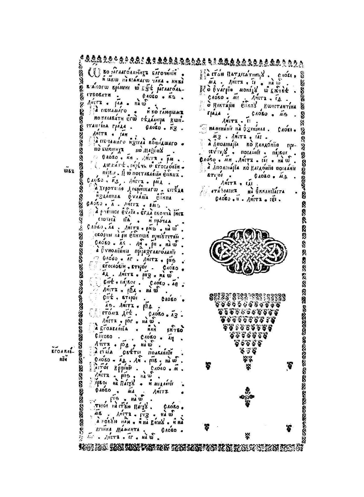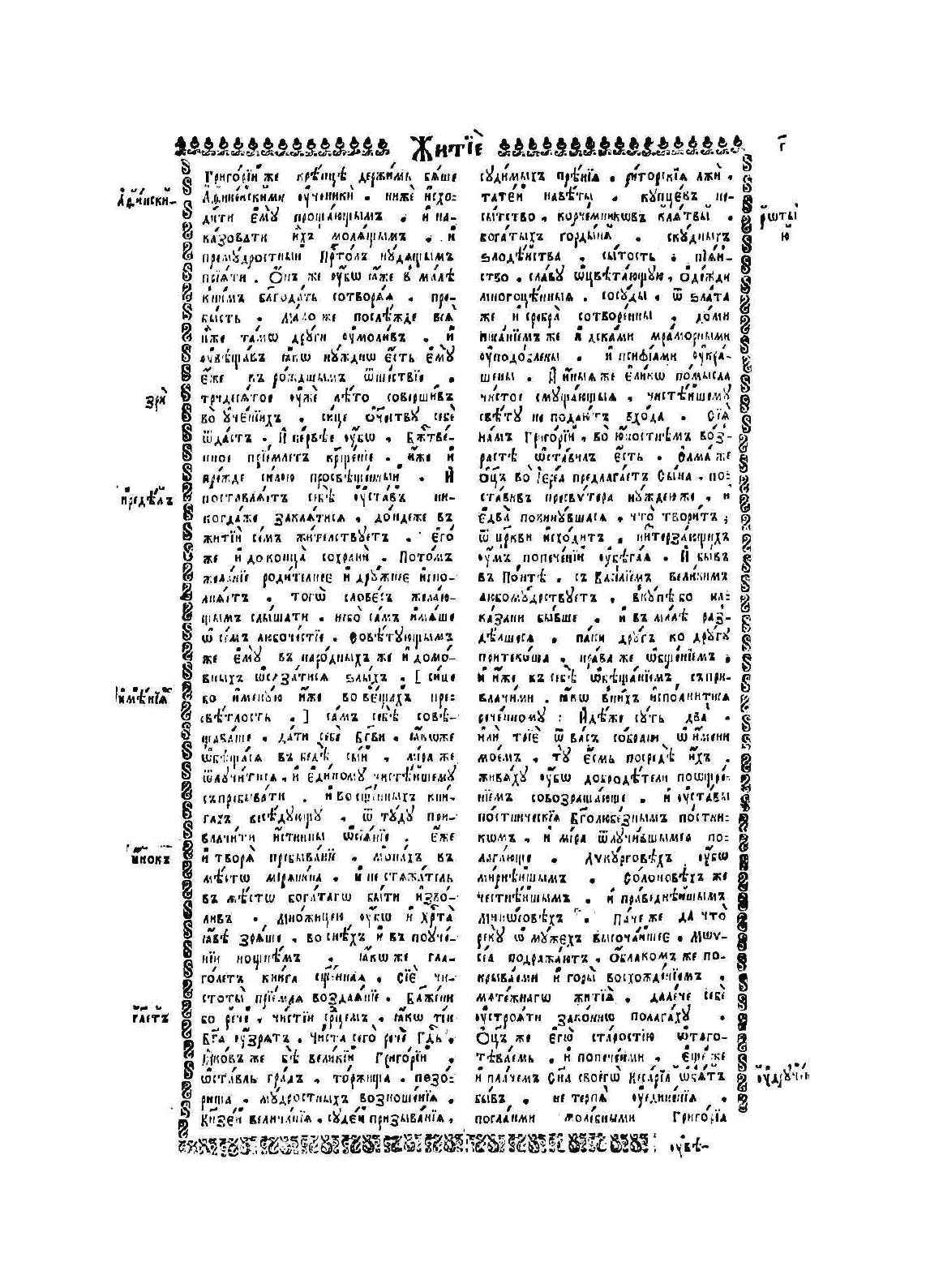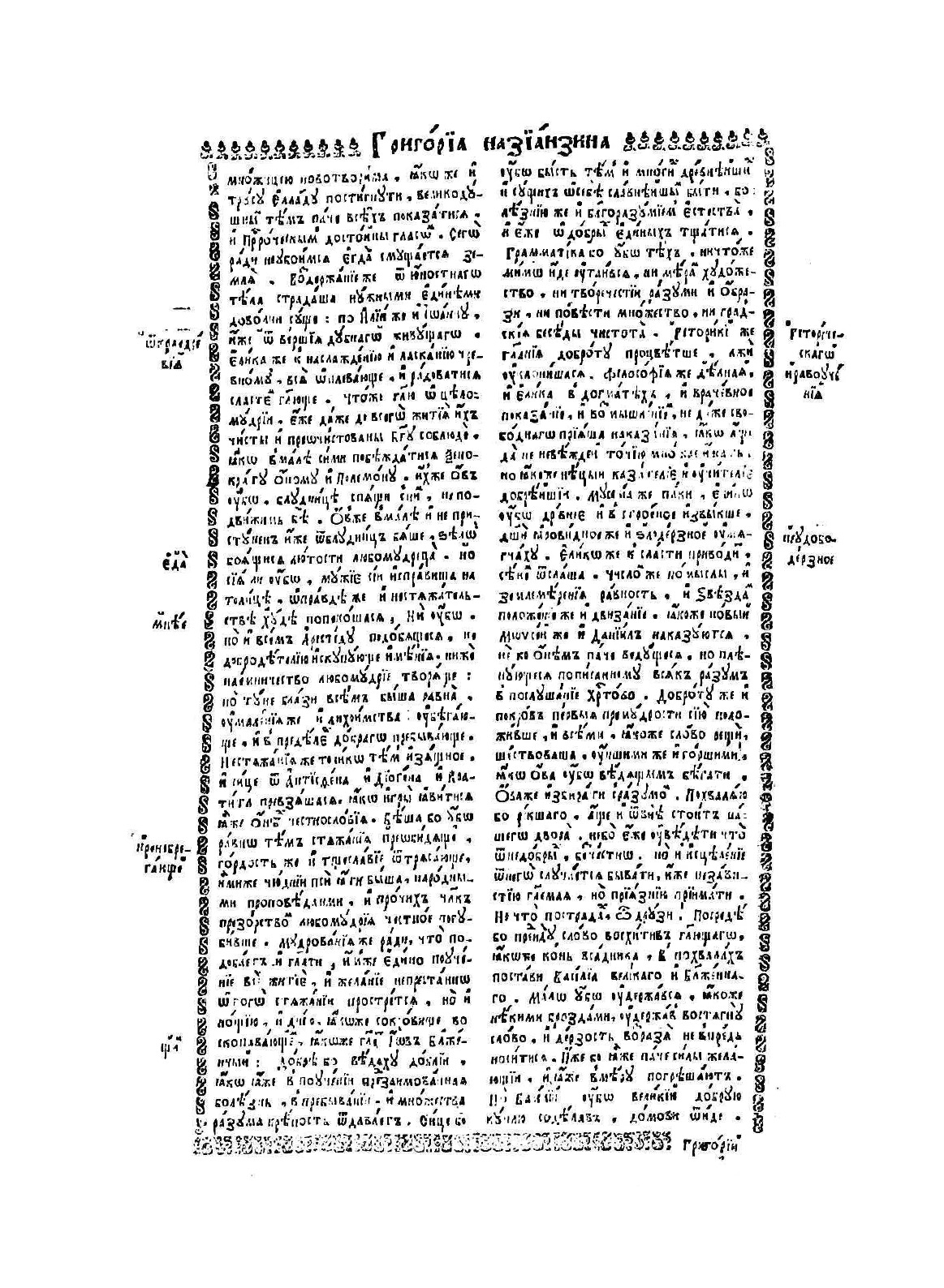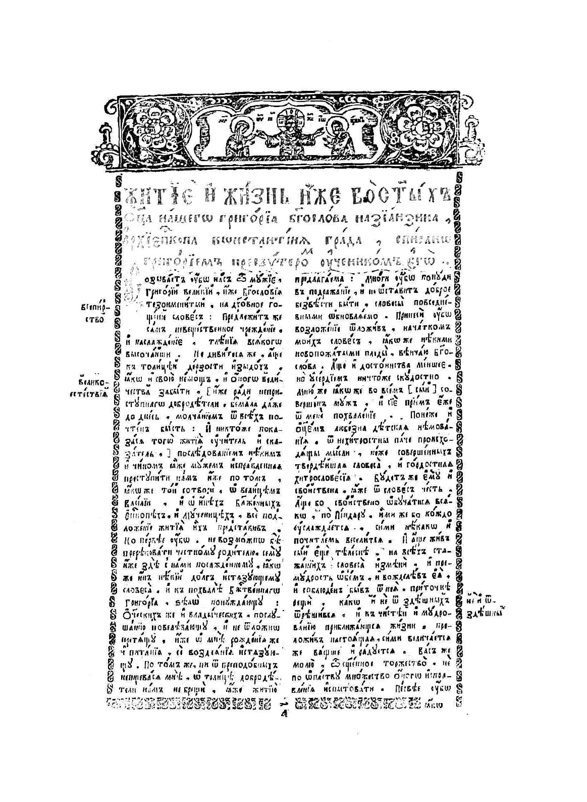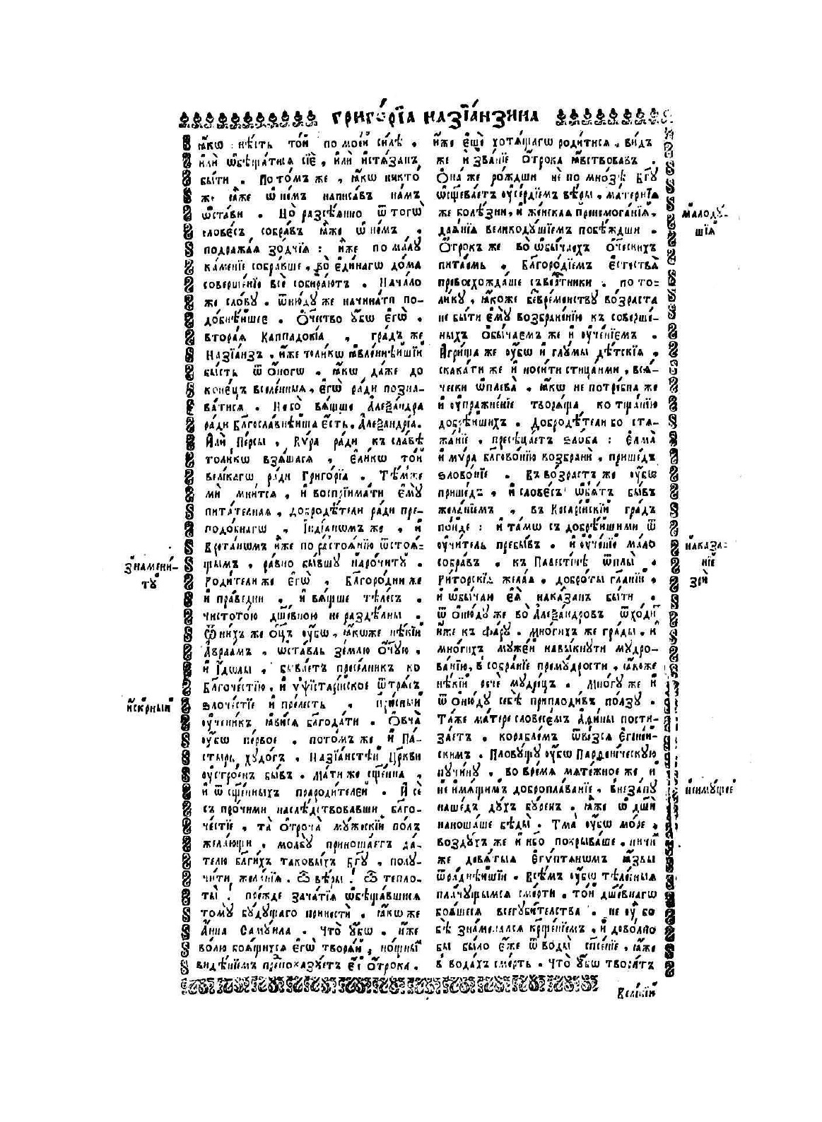 Во славу человеколюбца единого трехипостасного Бога, Отца, и Сына, и Святаго Духа: Эти боговдохновенные книги Великих пастырей Церковных, и учителей всей вселенной. Иже во иты Отца нашего Григория Богослова, архиепископа Константинопольского. И иже во святых Отца нашего Василия Великого, архиепископа Косадии Каппадокийской, беседы на шестодневник.