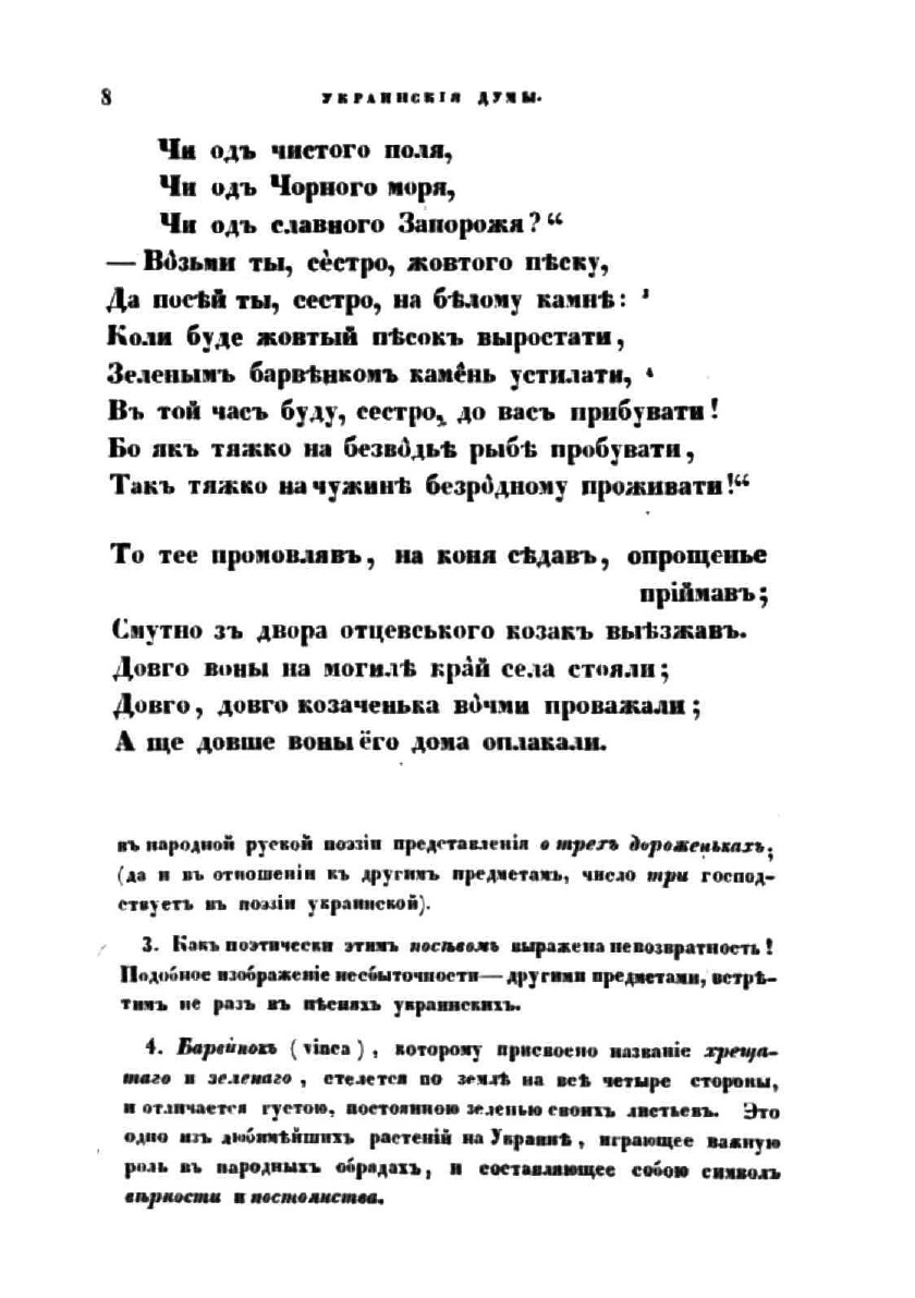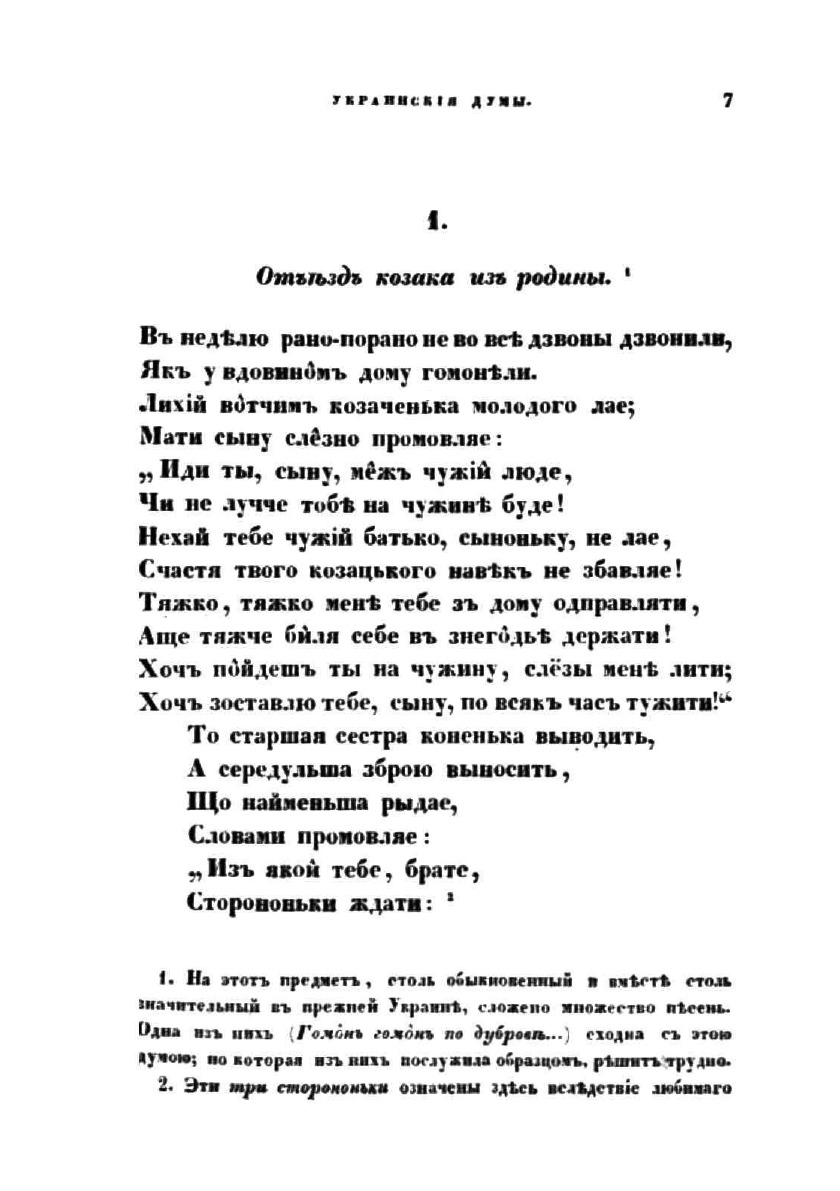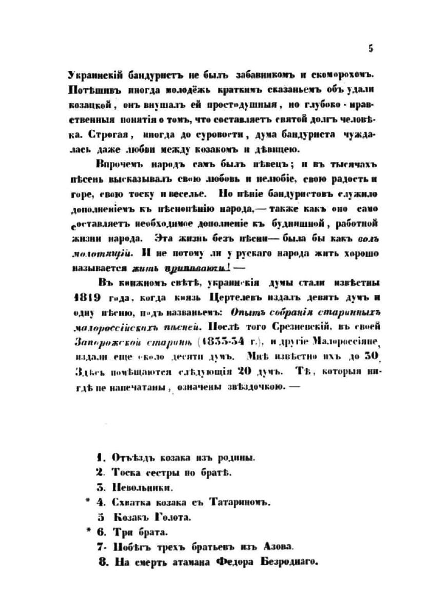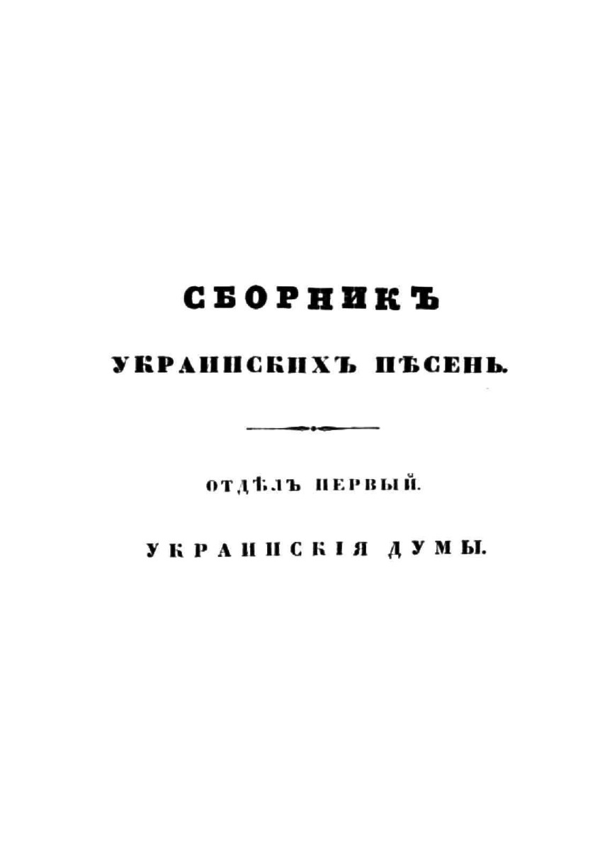 Часть первая сборника Украинских песен содержит: 1. Отъезд казака из родины; 2. Тоска сестры по брату; 3. Невольники; 4. Схватка казака с Татарином; 5. Казак Голота; 6. Три брата; 7. Побег трех братьев из Азова; 8. На смерть атамана Федора Безродного; 9. На Черноморский поход гетмана Серпяги (1577 г.); 10. На возвращение из плена Самойла Кушки (1588 г.); 11. Черноморская буря; 12. На победу Чигиринскую (1596 г.); 13. Поход на Поляков (1637 г.); 14. О Хмельницком и Барабаше (1647 г.); 15. На победу Кореунскую (1648 г.); 16. На поход Хмельницкого в Молдавию (1649 г.); 17. Об Украинцах после Белоцерковского мира (1652 г.); 18. На смерть Хмельницкого (1657 г.); 19. Об Иване Коновченке (1684 г.); 20. О Палее и Мазепе (1709 г.); 21-22. Песни колыбельная и материнская.
