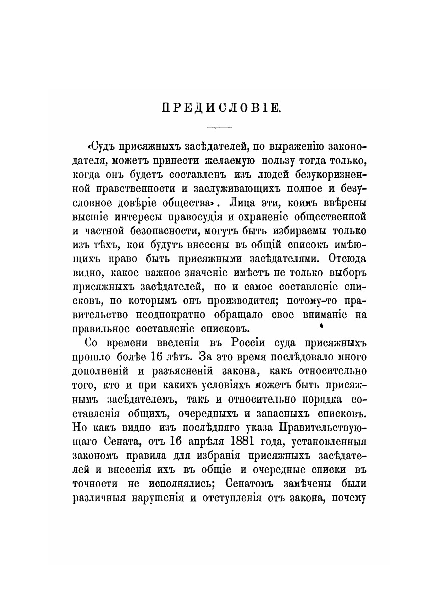 Суд присяжных заседателей, по выражению законодателя, может принести желаемую пользу тогда только, когда он будет составлен из людей безукоризненной нравственности и заслуживающих полное и безусловное доверие общества. Лица эти, кому вверены высшие интересы правосудия и охранение общественной и частной безопасности, могут быть избираемы только из тех, которые будут внесены в общий список имеющих право быть присяжными заседателями.