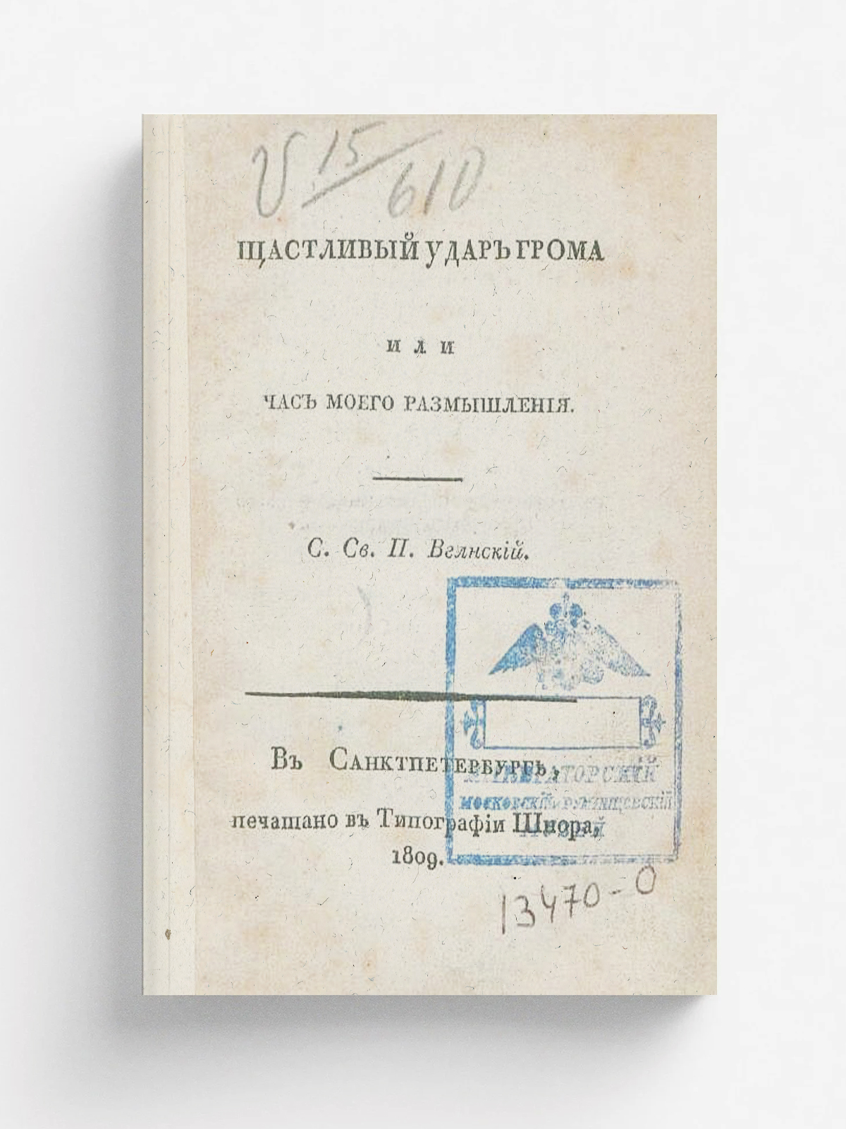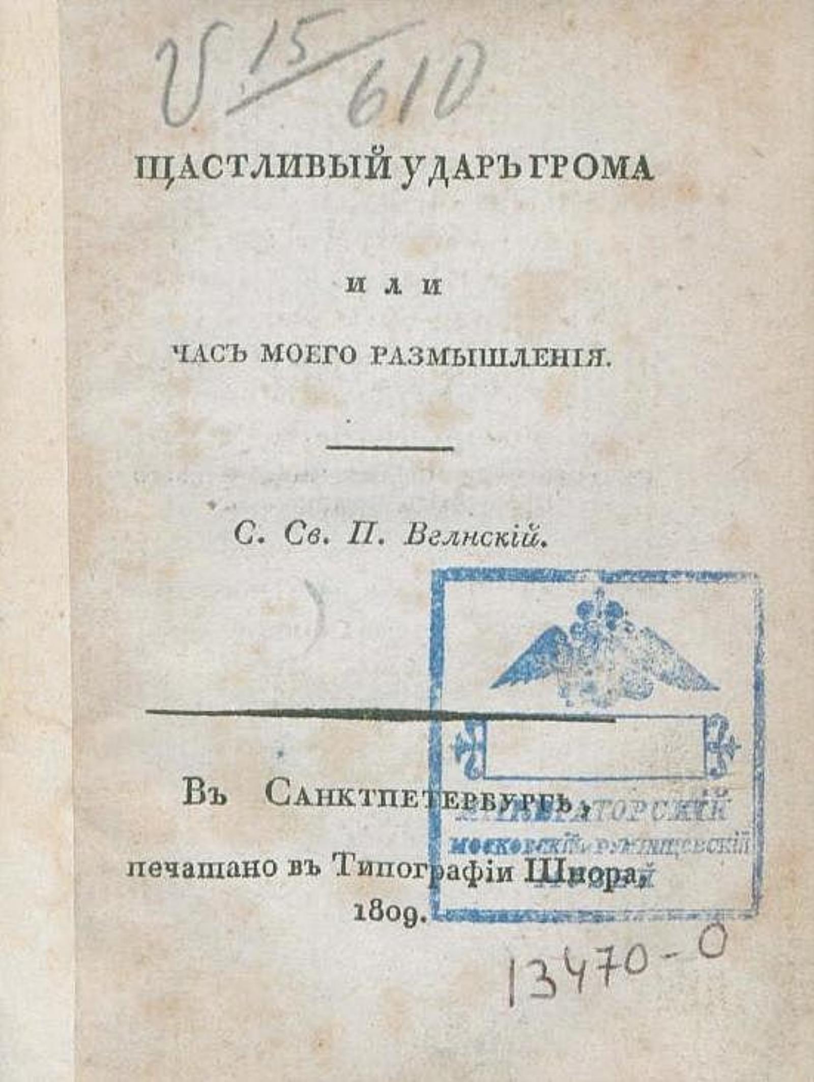 Вигилянский, Петр Борисович (1778–1845). Щастливый удар грома, или Час моего размышления / С[очинил] св[ященник] П. Вглнский. — В Санктпетербурге : Печатано в типографии Шнора, 1809. — [4], 44 с.; 16° (14 см).