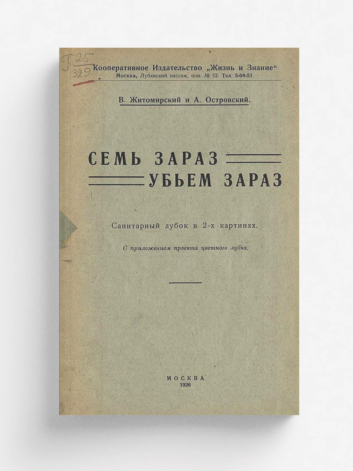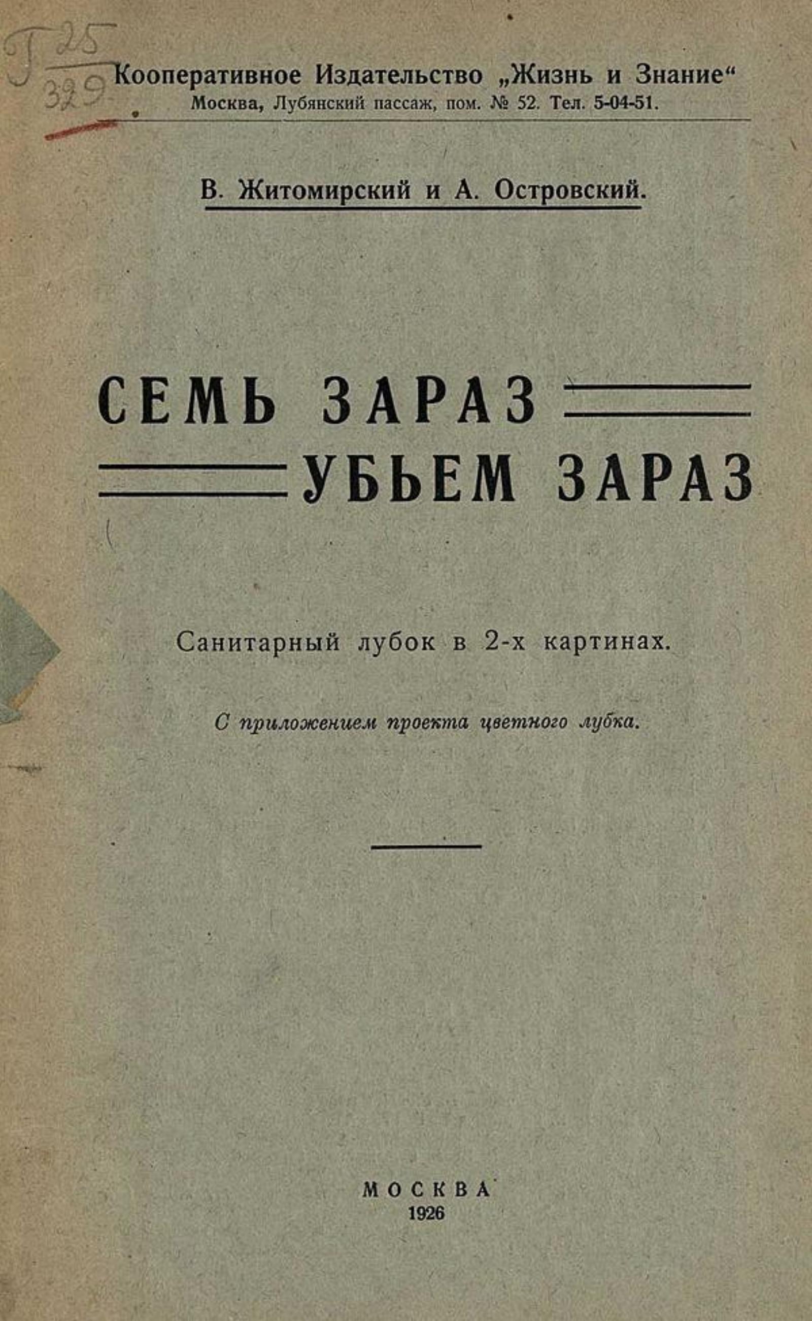 Житомирский, В. Семь зараз убьем зараз : санитарный лубок в 2-х картинах : с приложением проекта цветного лубка / В. Житомирский, А. Островский. — Москва : Жизнь и знание, 1926. — 23 с., 1 л. цв. ил.; 23 см. — (Библиотека «Народный театр»; Кн. 12).