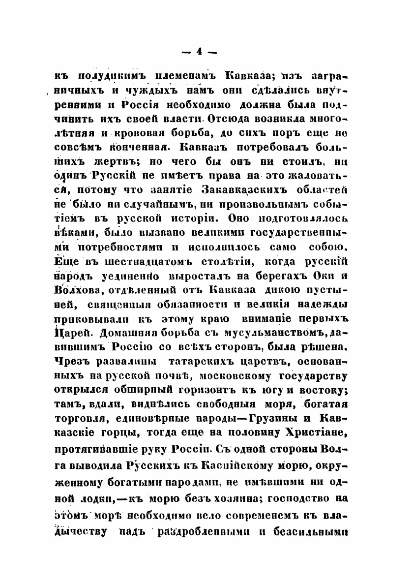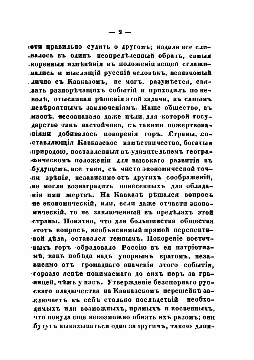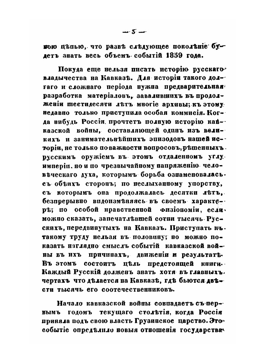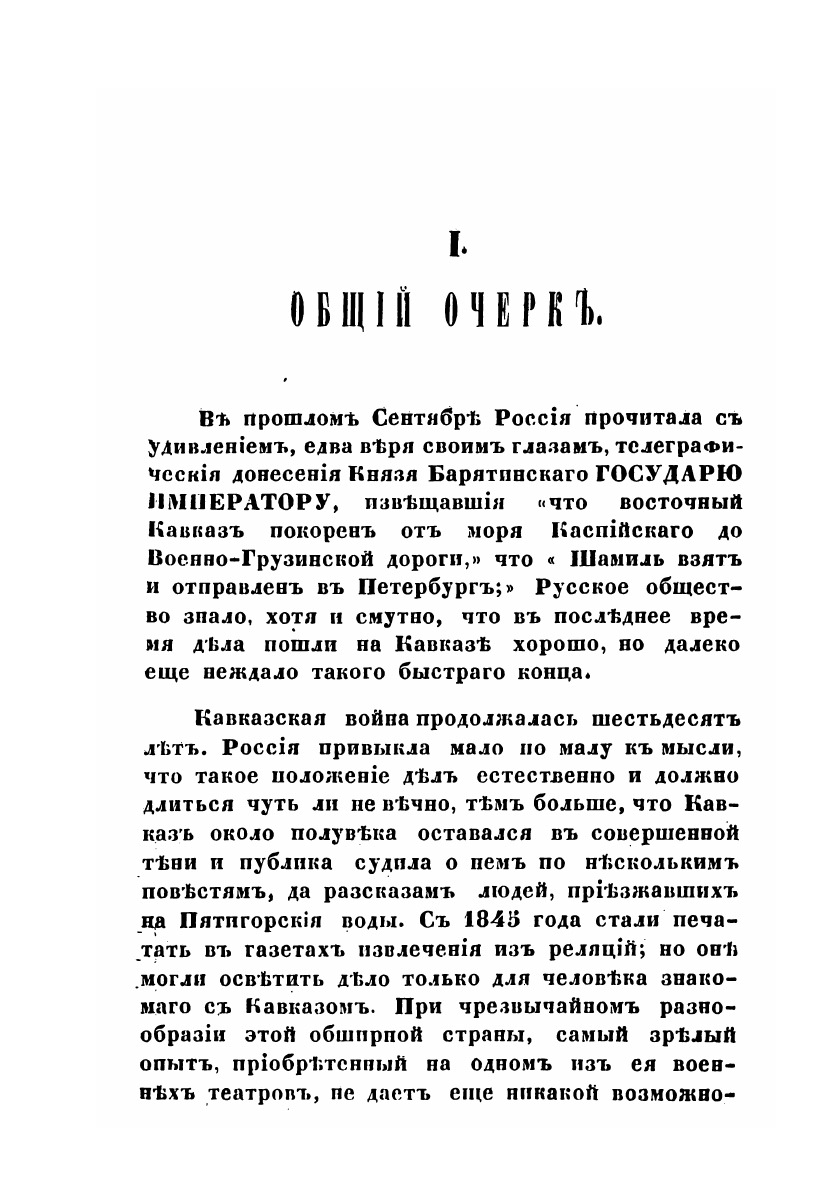В прошлом Сентябре Россия прочитала с удивлением, едва веря своим глазам, телеграфическия донесения Князя Барятинского Государю Императору, извещавшия "что восточный Кавказ покорен от моря Каспийского до Военно-Грузинской дороги," что "Шамиль взят и отправлен в Петербург;"