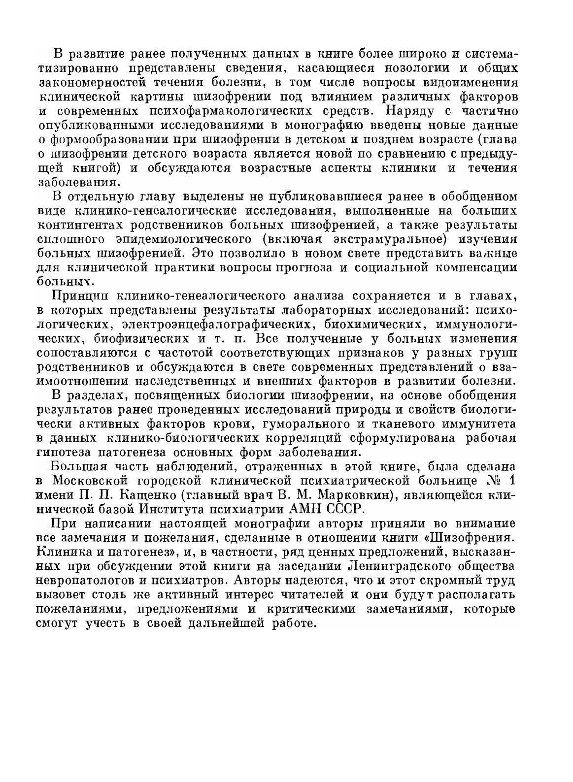 Изложение клинического материала дается в нескольких аспектах: возрастном; шизофрения детского зрелого и позднего возраста); генеалогические особенности личности и проявление психоза у родственников больных); течение болезни во внебольничных условиях (включая вопросы трудоспособности и социальной адаптации разных социальных групп).