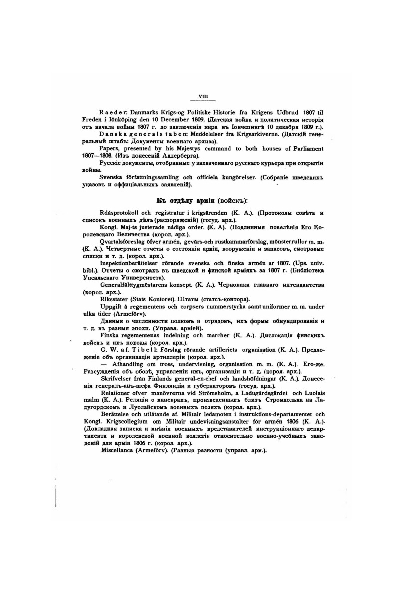 Перевод на русский язык исследования , подготовленного Историческим отделом Шведского генерального щтаба, сделан группой офицеров Российского Генштаба и Финляндского военного округа под руководством полковника А.М. Алексеева «Трудность шведского языка и малое его распространение вообще, а в России в частности, делало этот труд до сего времени недоступным для огромного большинства русских военных читателей и исследователей, между тем как война Швеции с Россией в 1808 1809 гг., приведшая к окончательному покорению и присоединению Финляндии к России, нашими историками мало исследована и разработана. Имея задачей быть возможно ближе к подлиннику, переводчики старались передать шведский труд со всем присущим ему тенденциозным освещением и представить его без каких либо комментариев с русской стороны» В издании, помимо воспроизводится множество редких документов из шведских собраний