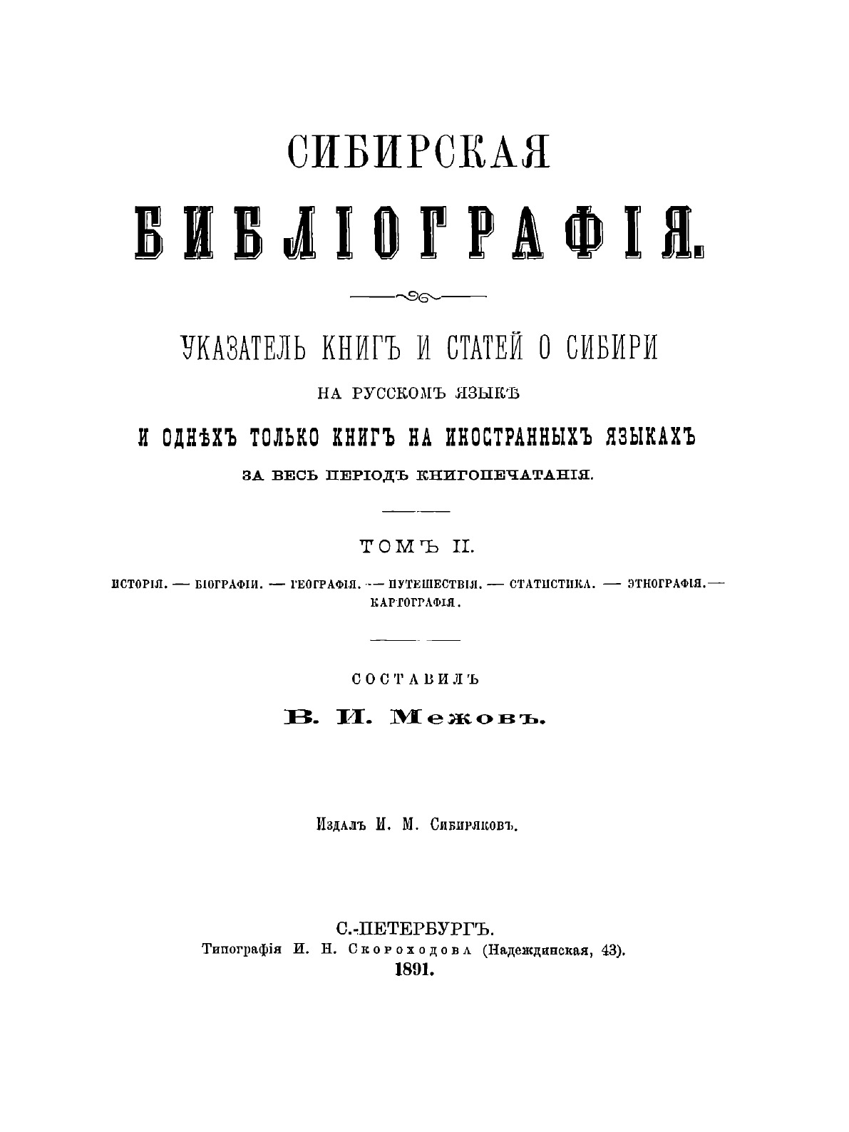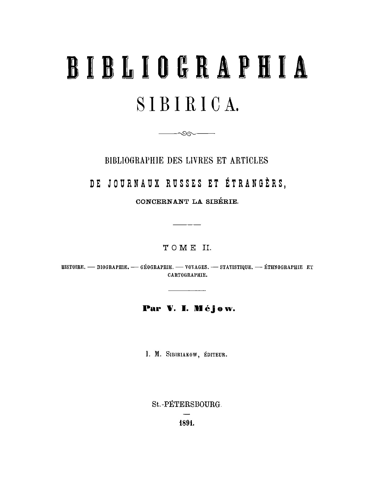 Выдающийся русский библиограф Владимир Измайлович Межов (1830–1894) — автор двухтомного указателя книг и статей о Сибири. В издание вошло все напечатанное за 300 лет на русском языке, начиная от первых исторических актов, где встречаются упоминания об этом крае. Также дается библиография литературы на иностранном языке. Третий том содержит материалы по правоведению, политическим и социальным наукам, педагогике, естественным и медицинским наукам. В этот раздел вошли, кроме статей, гравюры и литографии: виды сибирских городов, портреты деятелей, имевших отношение к Сибири.
