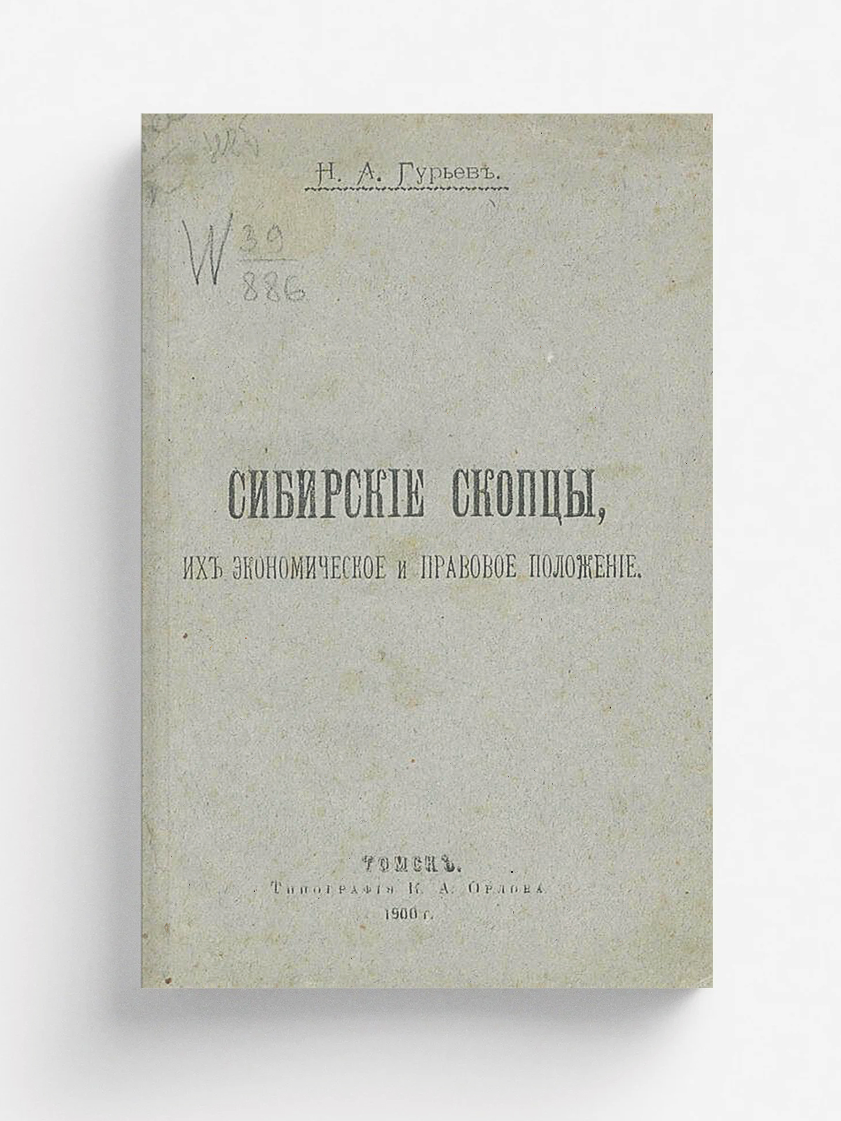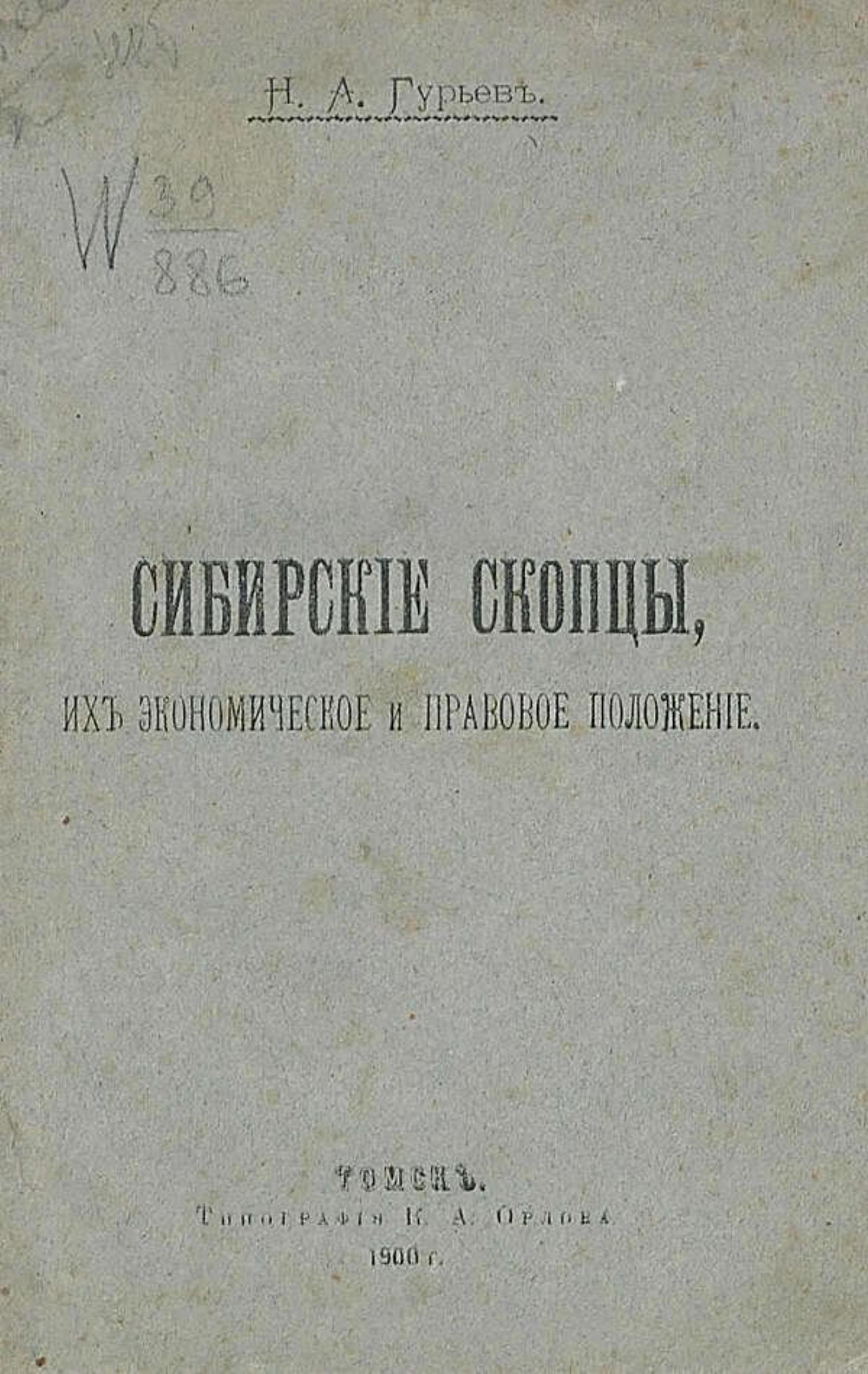 Гурьев, Николай Александрович. Сибирские скопцы, их экономическое и правовое положение / Н. А. Гурьев. — Томск : типография К. А. Орлова, 1900. — IV, 80 с. : ил.; 18 см.