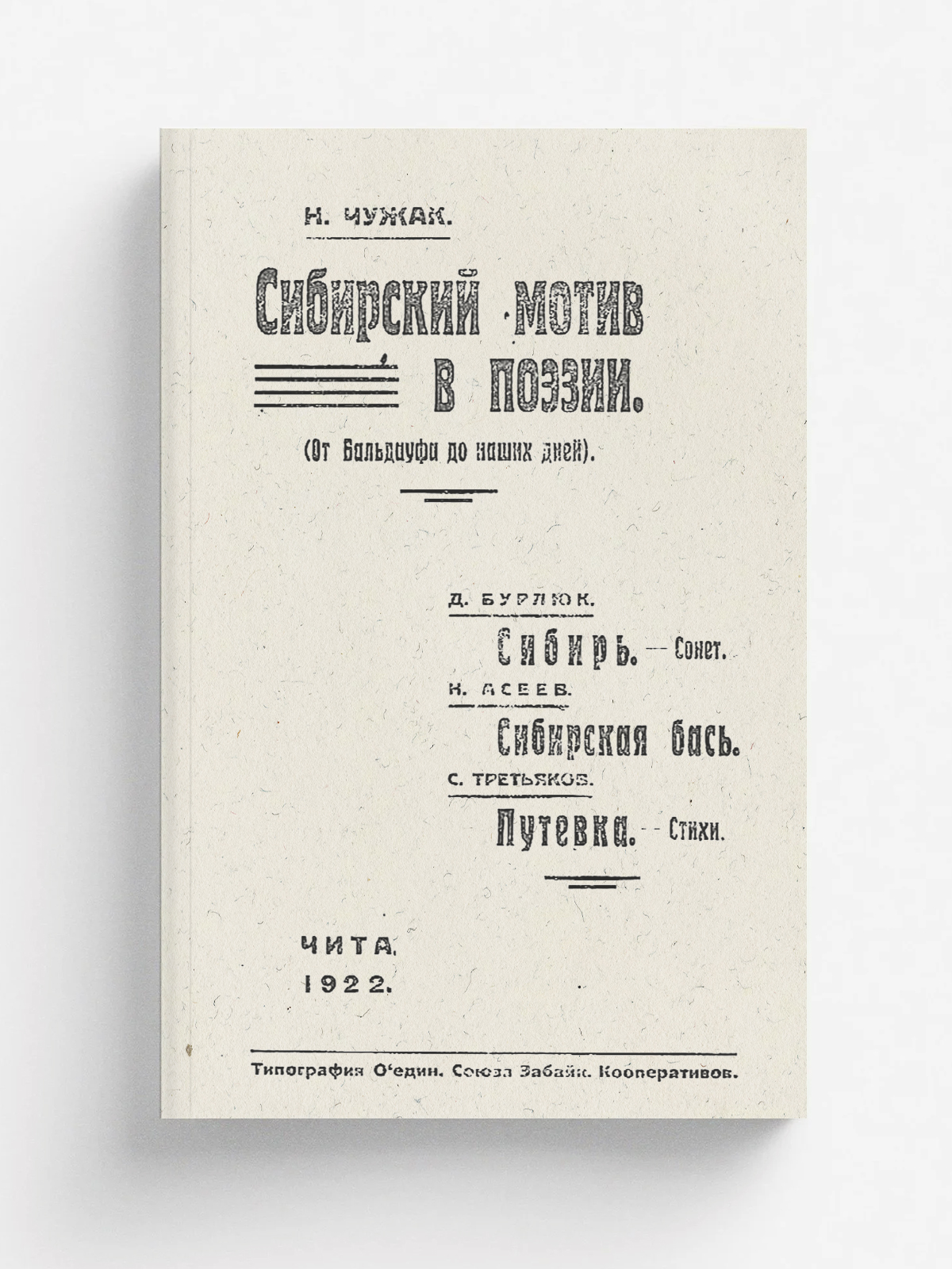 Чужак, Н. (1876-1937). Сибирский мотив в поэзии. (От Бальдауфа до наших дней) ; Сибирь ; Сибирская бась ; Путевка : Сонет : Стихи / Н. Чужак. — Чита : [б. и.], 1922. — Обл., 103 с.; 19 см.