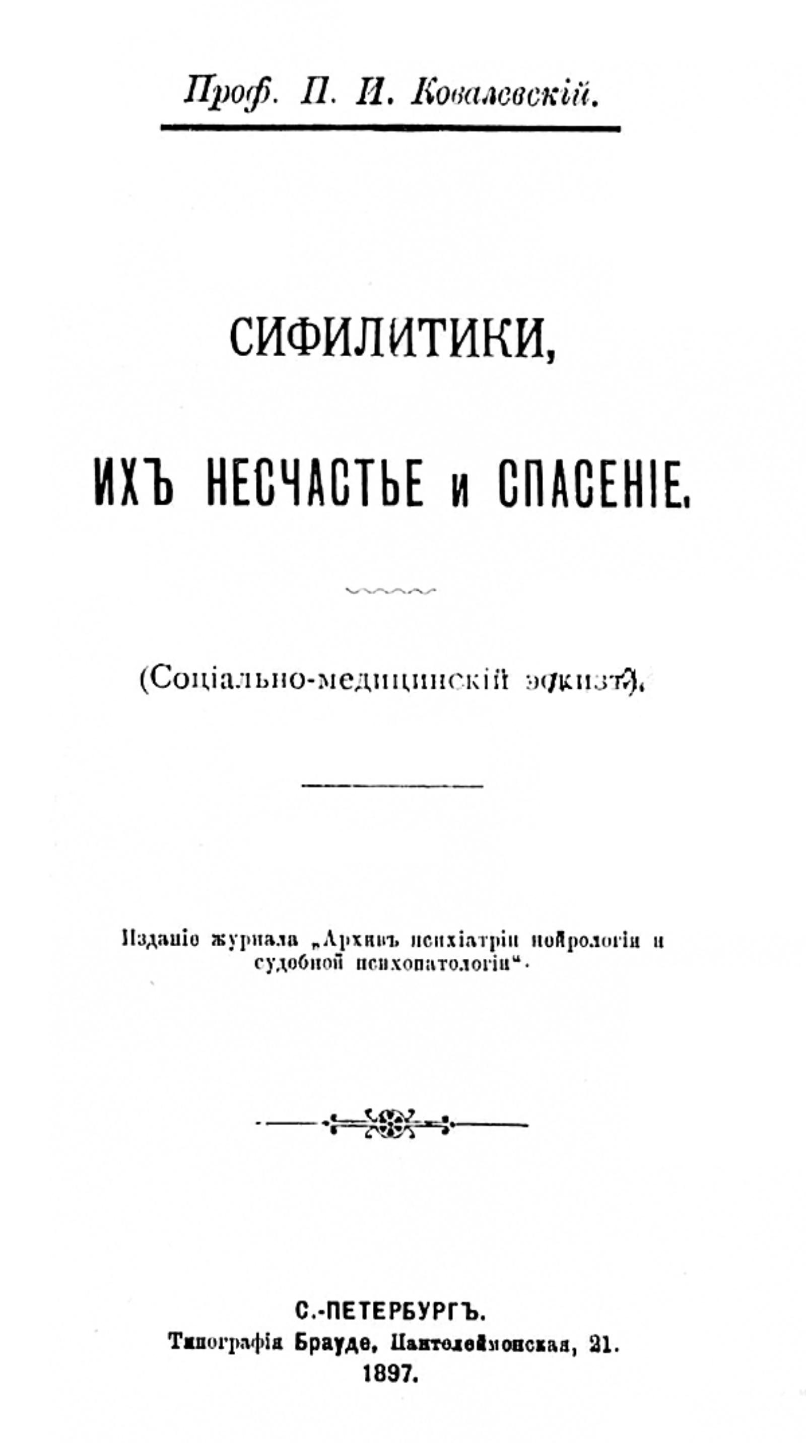 Ковалевский, Павел Иванович (1849–1931). Сифилитики, их несчастье и спасение (социально-медицинский эскиз) / проф. П. И. Ковалевский. — С.-Петербург : издание журнала «Арх. психиатрии, нейрологии и судебной психопатологии», 1897 (Тип. Брауде). — 69 с.; 18 см.