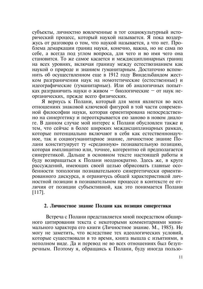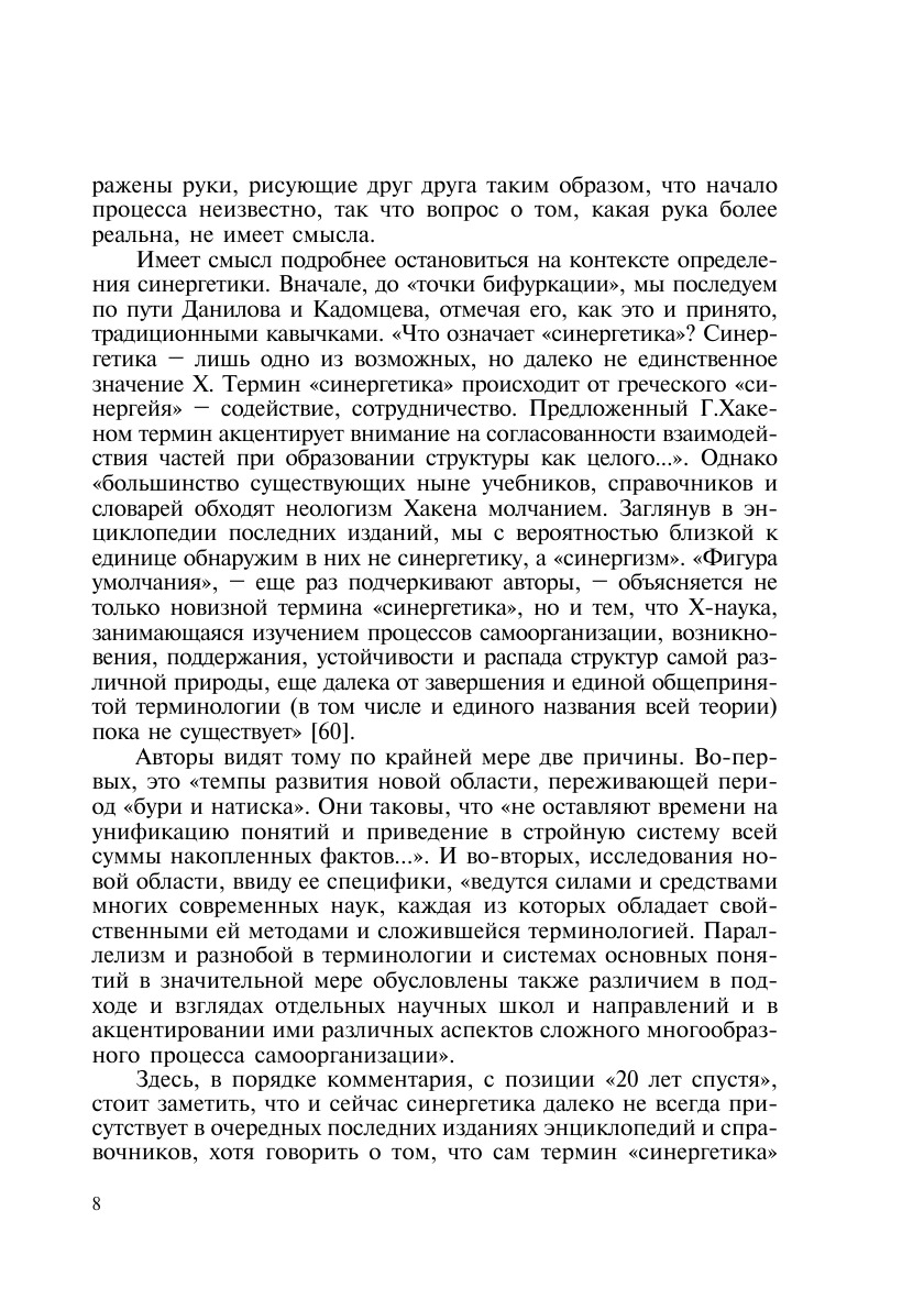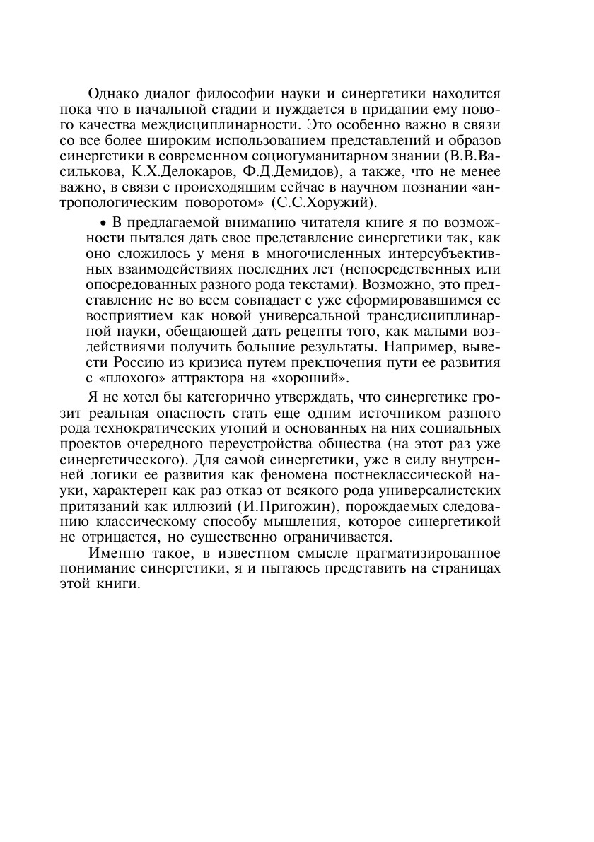 Характеризуя синергетику как междисциплинарное направление исследований, обычно отмечают, что это новое, «становящееся» направление научного поиска. В течение короткого времени своего существования – примерно 30 лет – синергетика уже не раз оказывалась «на развилке дорог» междисциплинарной и кросскультурной эволюции, пленяя своей новизной и переоткрытием традиции в науке и культуре не только физиков, биологов и математиков, но и историков, социологов, психологов, лингвистов, экологов и экономистов, теологов и искусствоведов. Именно в этом, динамически открытом, коммуникативном и трансдисциплинарном контексте синергетика предстает на страницах книги, переоткрывается в более широкой и многомерной исторической перспективе. Возрождая очарование природы и мира, над «расколдовыванием» которых долго и упорно трудился разум классической науки, пытавшийся познать «естественную» природу мира вещей «как она есть на самом деле», постнеклассическая синергетика (И.Р.Пригожин, И.Стенгерс) обретает новую историческую глубину.