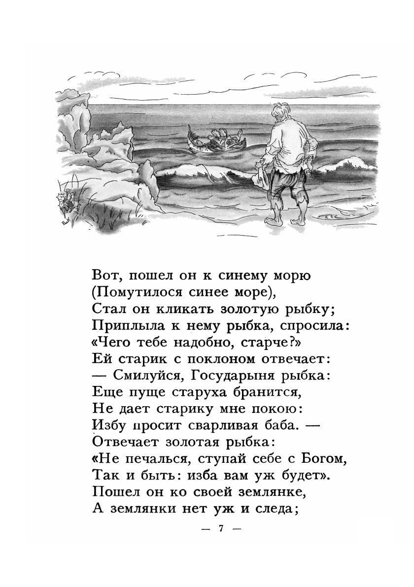 В 1830-е годы Пушкин начинает писать сказки для детей, как обычно принято называть «Сказку о рыбаке рыбке» (1833), «Сказку о золотом петушке» (1834), «Сказку о царе Салтане» (1831) и др. Александр Сергеевич вряд ли мыслил себя «детским» писателем. За сказочными образами, за волшебными сюжетами, за происходящими чудесами и преображениями героев прочитываются и более глубокие проблемы и темы. Сюжет «Сказки о рыбаке и рыбке» взят из сборника сказок братьев Гримм. Пушкин легко и свободно заменил западноевропейский колорит народным русским. «Сказка о рыбаке и рыбке» А. С. Пушкина иллюстрировалась многими художниками начиная с 1858 года. Но именно издание 1922 года с акварельными иллюстрациями В. М. Конашевича и послесловием известного пушкиниста Н. Лернера снискало известность. Изящный и легкий слог Пушкина требовал не менее изящных иллюстраций, и знаменитое издательство З. И. Гржебина не ошиблось, предложив эту работу Конашевичу. Это была первая работа художника с пушкинскими сказками. Цветная литография и акварель любимые техники художника-иллюстратора. В 1929 году Конашевич создает иллюстрации к этой же сказке, но уже в другой технике гравюре на дереве. Пушкиниана Конашевича особый и узнаваемый мир.Конашевич Владимир Михайлович (1888 1963) русский советский художник, график, доктор искусствоведения, один из известнейших мастеров советской книжной иллюстрации.Художественное образование Конашевич получил в Московском училище живописи, ваяния и зодчества, где его учителями были К. А. Коровин, С. В. Малютин и Л. О. Пастернак. В книжной графике известность ему принесли иллюстрации к стихотворениям А. А. Фета, произведениям И. С. Тургенева, А П. Чехова, М. М. Зощенко. Одним из высших его достижений стали иллюстрации к «Манон Леско» аббата Прево. В станковой графике он заявил о себе прекрасными литографскими сериями середины 1920-х гг. «Павловский парк», «Павловская шпана», «Улица». Создал он и ряд интересных гравюр на дереве. С 1930-х гг. Конашевич почти полностью посвятил себя иллюстрированию детских книг, лишь изредка делая исключение для пейзажей, натюрмортов и портретов, которые исполнял в полюбившейся ему специфической технике тушью или акварелью по китайской бумаге. В детской книге он дебютировал еще в 1918 году книжками «Азбука в рисунках» и «Розовая азбука» Е. Е. Соловьевой. Вплоть до самой смерти художник иллюстрировал народные сказки, русскую классику, детские произведения советских писателей. Его работы отличались склонностью к шутливой гротескности и затейливо-декоративной манере, восходящей к графике «Мира искусства».