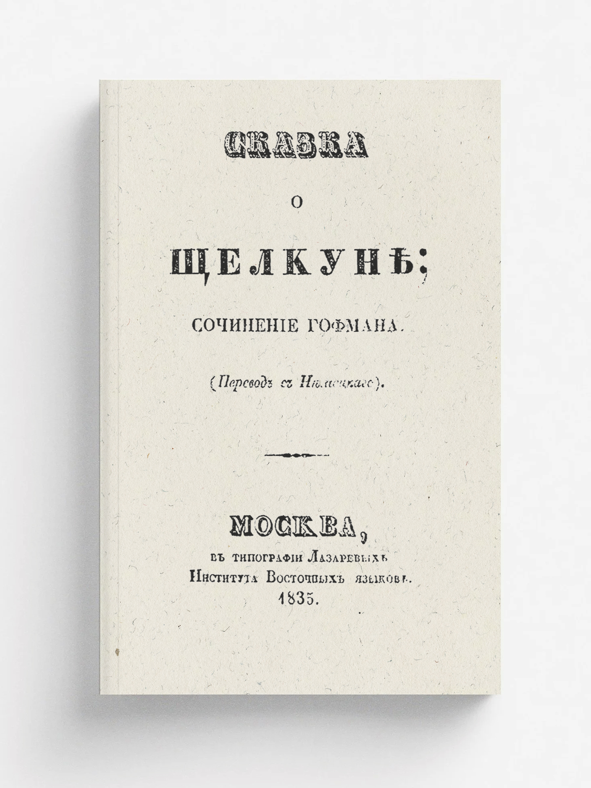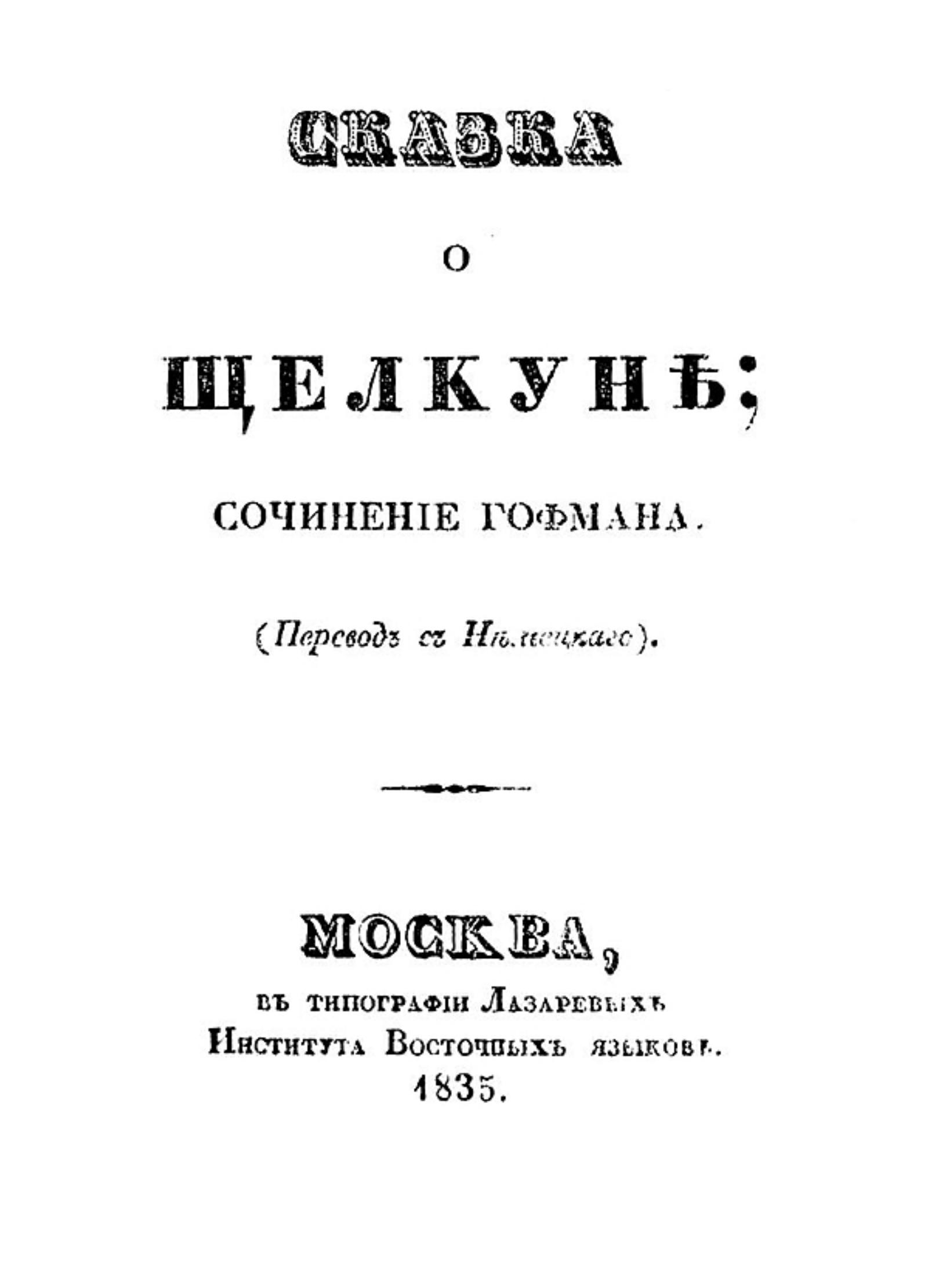 Гофман, Эрнст Теодор Амадей (1776–1822). Сказка о Щелкуне : (Пер. с нем.) / Соч. Гофмана. — Москва : тип. Лазаревых Ин-та вост. яз., 1835. — 173 с.; 14.