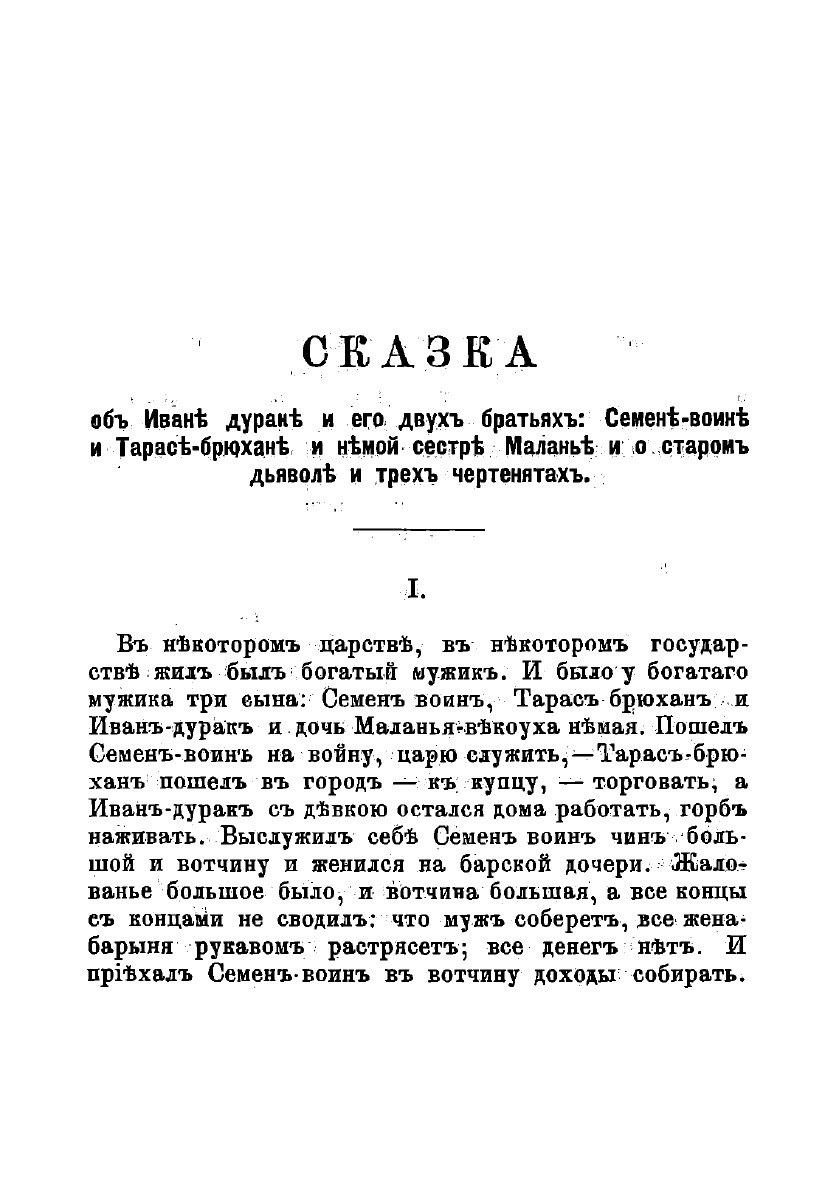 Печатная книга «Сказка об Иване-дураке и его двух братьях: Семене-воине и Тарасе-брюхане и немой сестре Маланье, и о старом дьяволе и трех чертенятах» в мягкой обложке, язык - русский. В книге 40 страниц, она напечатана на белой офсетной бумаге плотностью 80 г/м². Формат издания — 148x210 мм. Все книги аккуратно упаковываем в прочный трёхслойный непрозрачный картонный конверт.