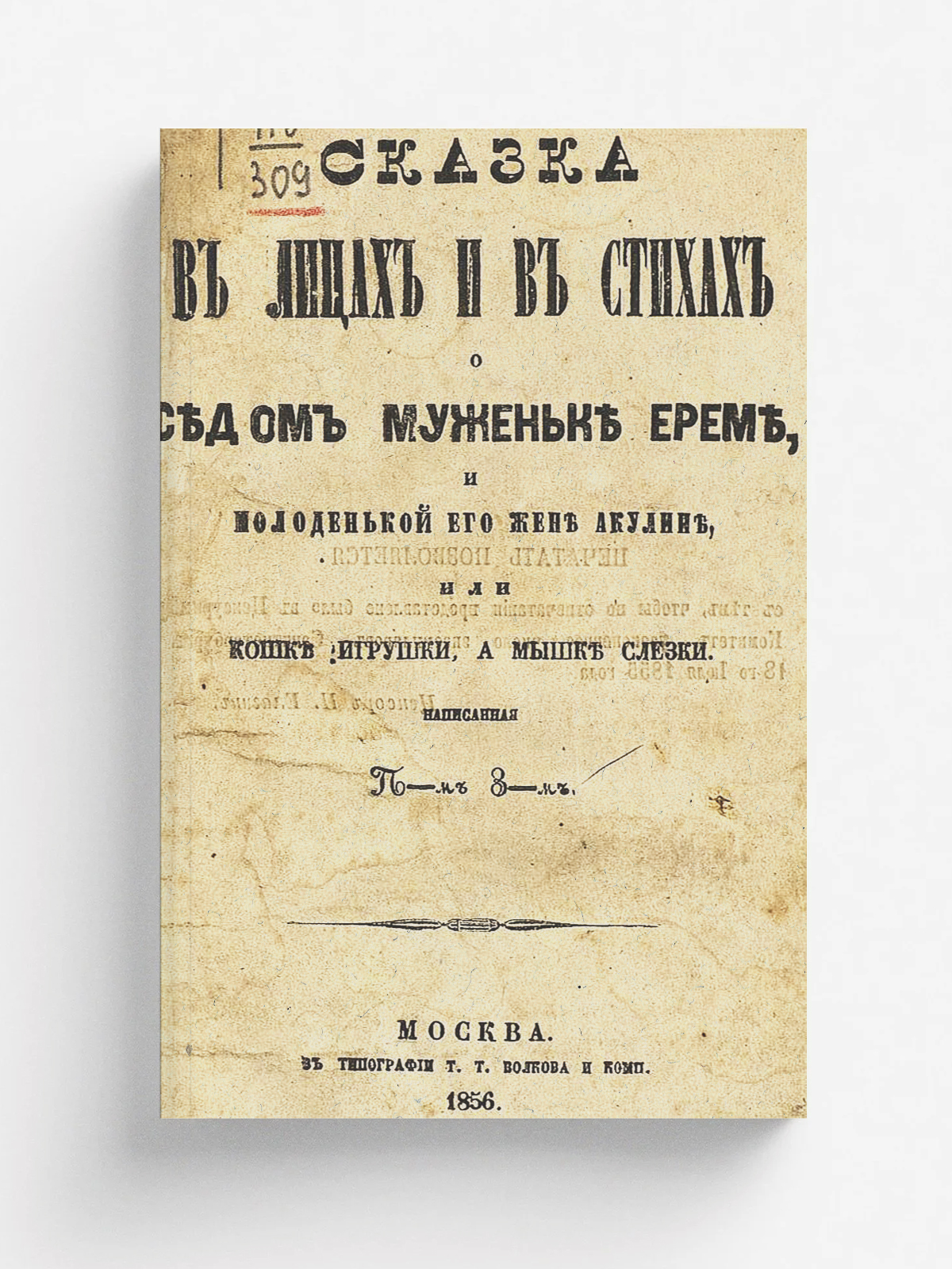 Сказка в лицах и в стихах о седом муженьке Ереме и молоденькой его жене Акулине, или Кошке игрушки, а мышке слезки, написанная П-м З-м. — Москва : тип. Т. Т. Волкова и К°, 1856. — 46 с.