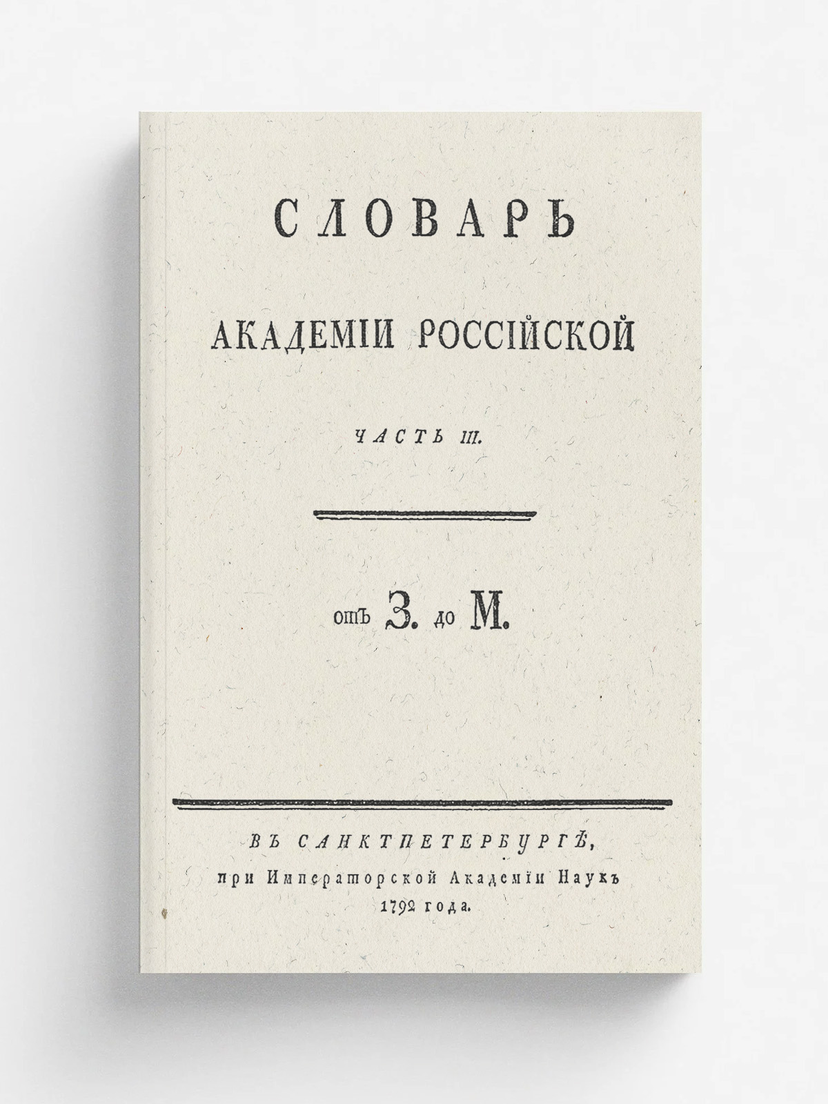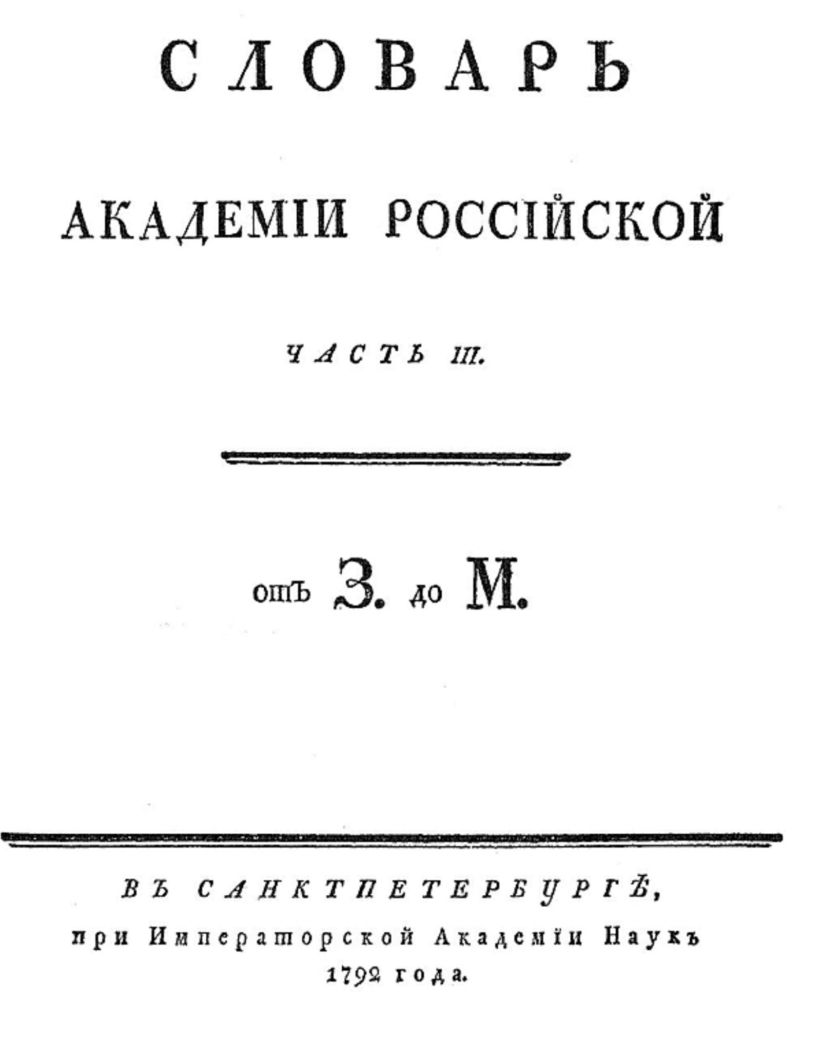Словарь Академии Российской. — Санктпетербург : При Имп. Акад. наук, 1789–1794. — 4°. Часть 3. От З до М. — 1792. — [5] с., 1388 стлб., [63] с.