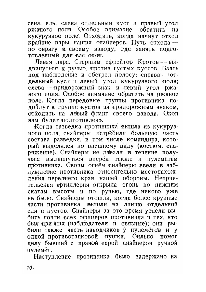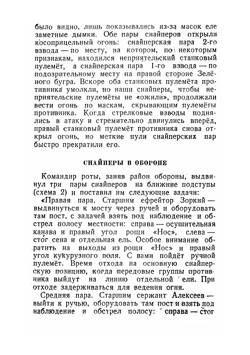 В книге приведены примеры организации и проведения занятий по наиболее важным отделам обучения снайперов, а также даются указания, как использовать снайперские пары в различных условиях боя.