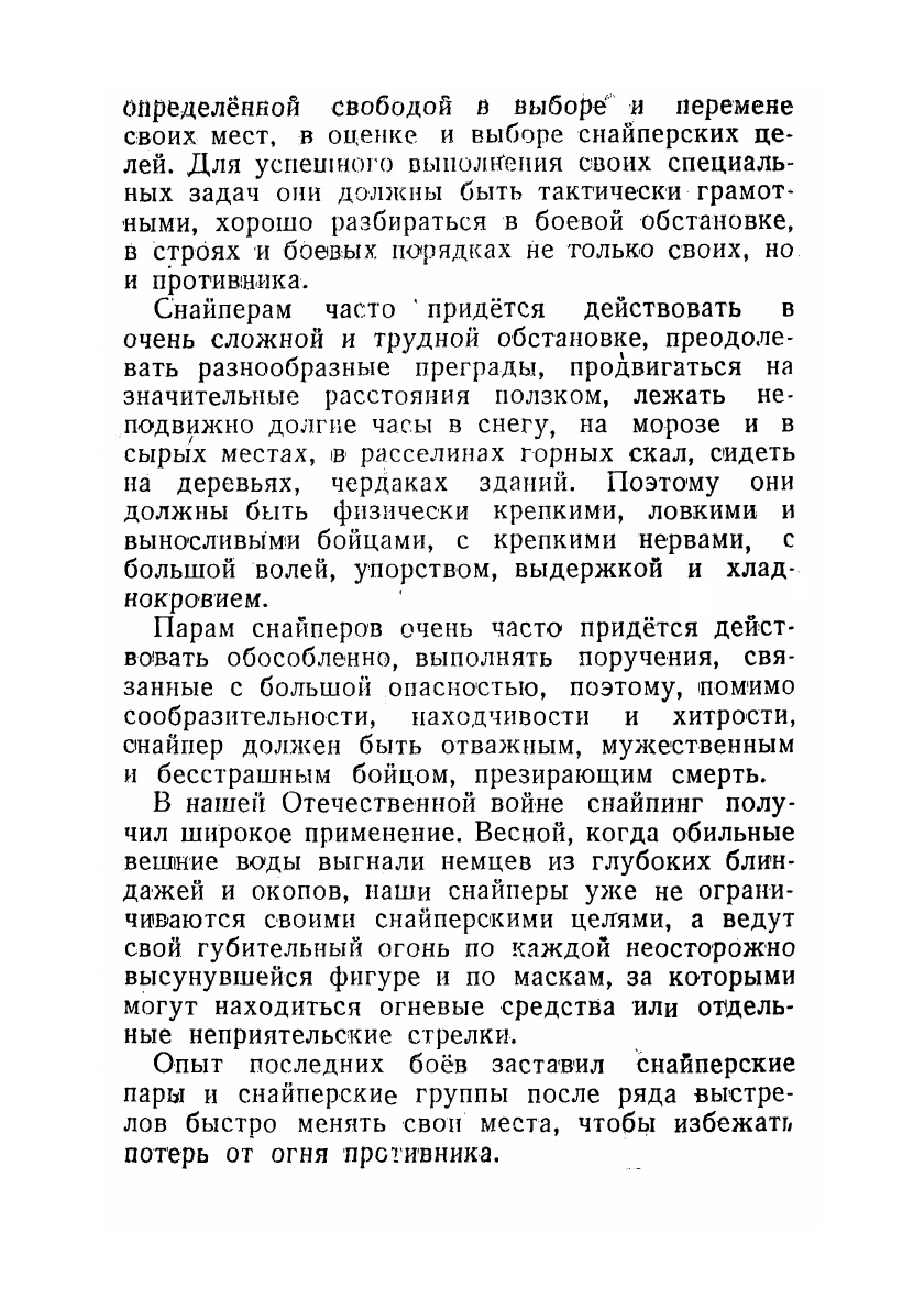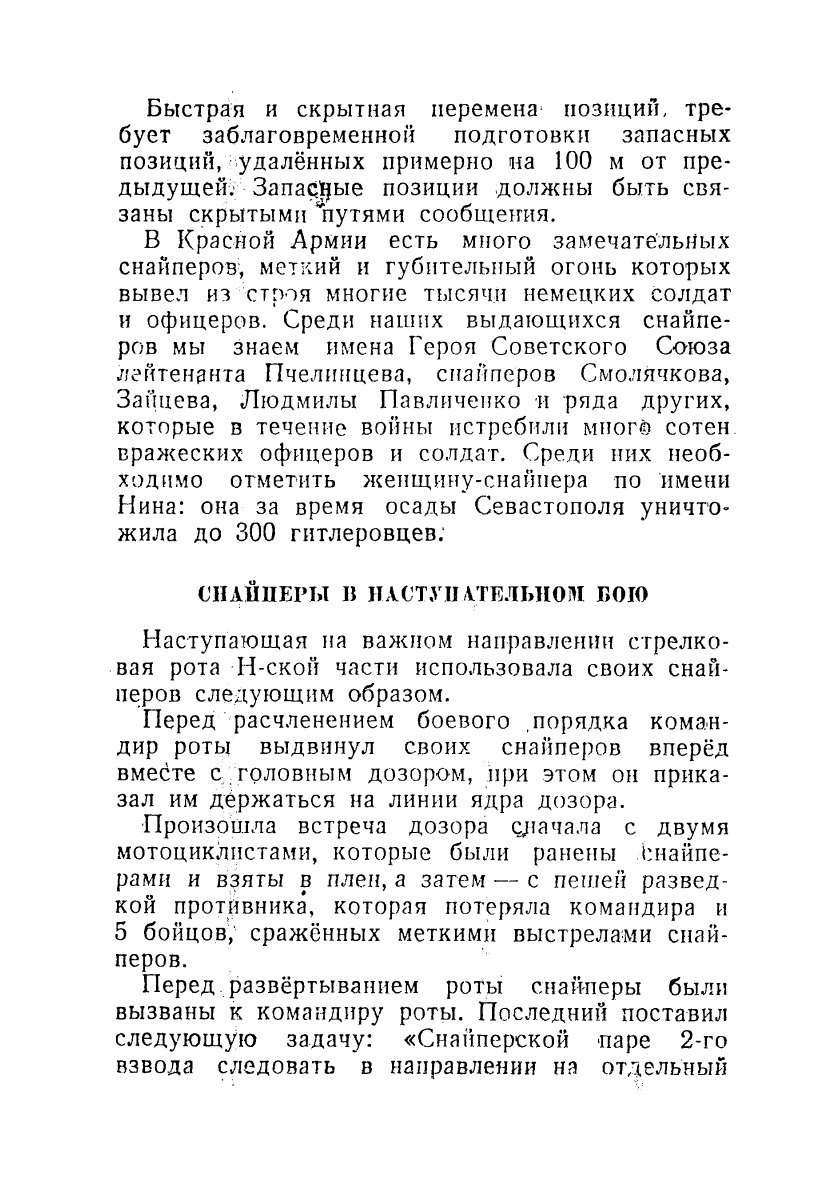 При составлении пособия использован долголетний опыт автора по подготовке снайперов на курсах «Выстрел» и на учебных сборах в различных военных округах Красной Армии, а также опыт боевых действий снайперов в Великой Отечественной войне.