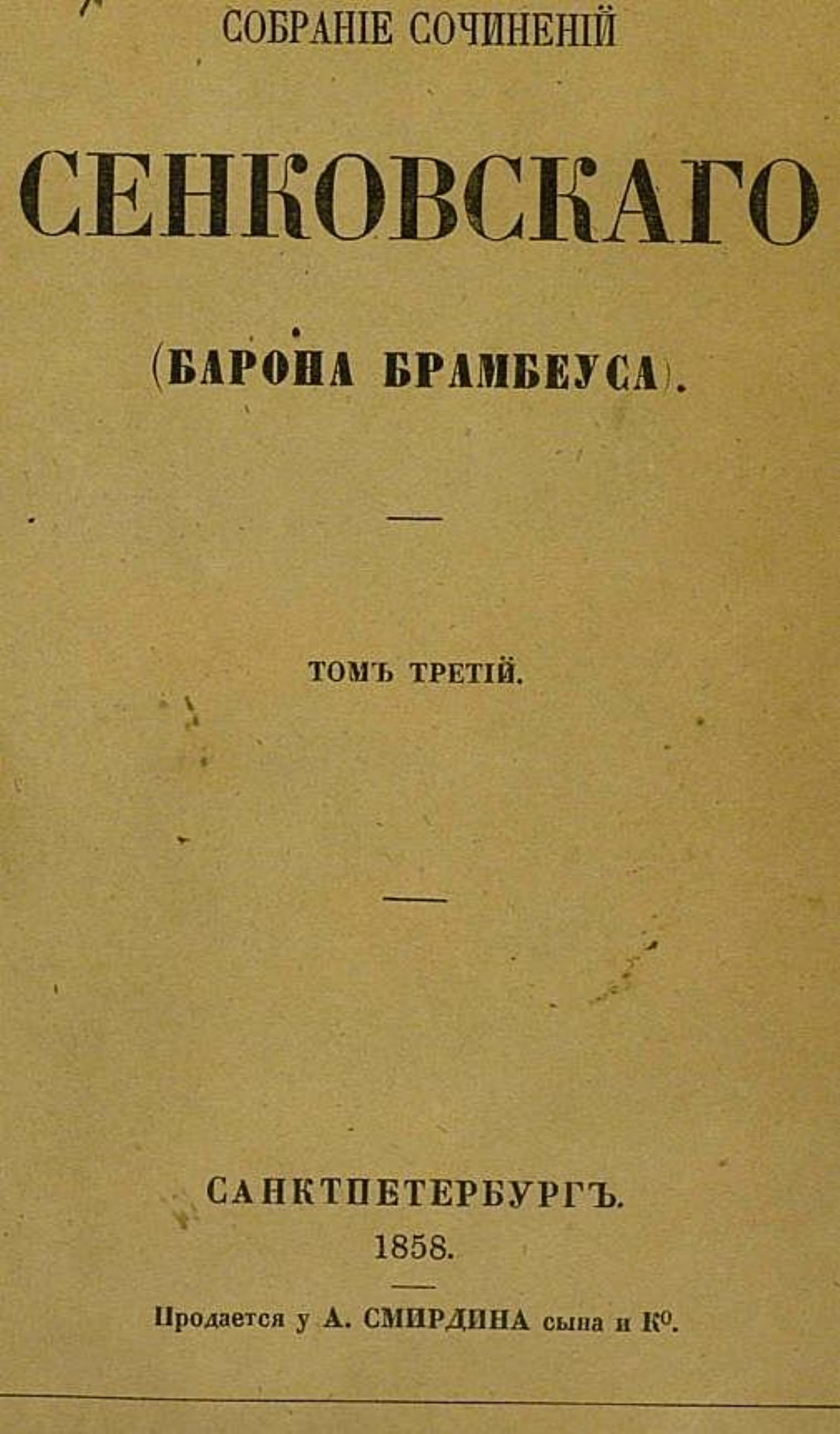 Сенковский, Осип Иванович (1800–1858). Собрание сочинений Сенковского (Барона Брамбеуса) : С портр. и жизнеописанием авт. Т. 1-9. — Санкт-Петербург : тип. Имп. Акад. наук, 1858-1859. — 9 т.; 18. [Повести и романы]. — 1858. — [4], 505 с., 1 л. портр.
