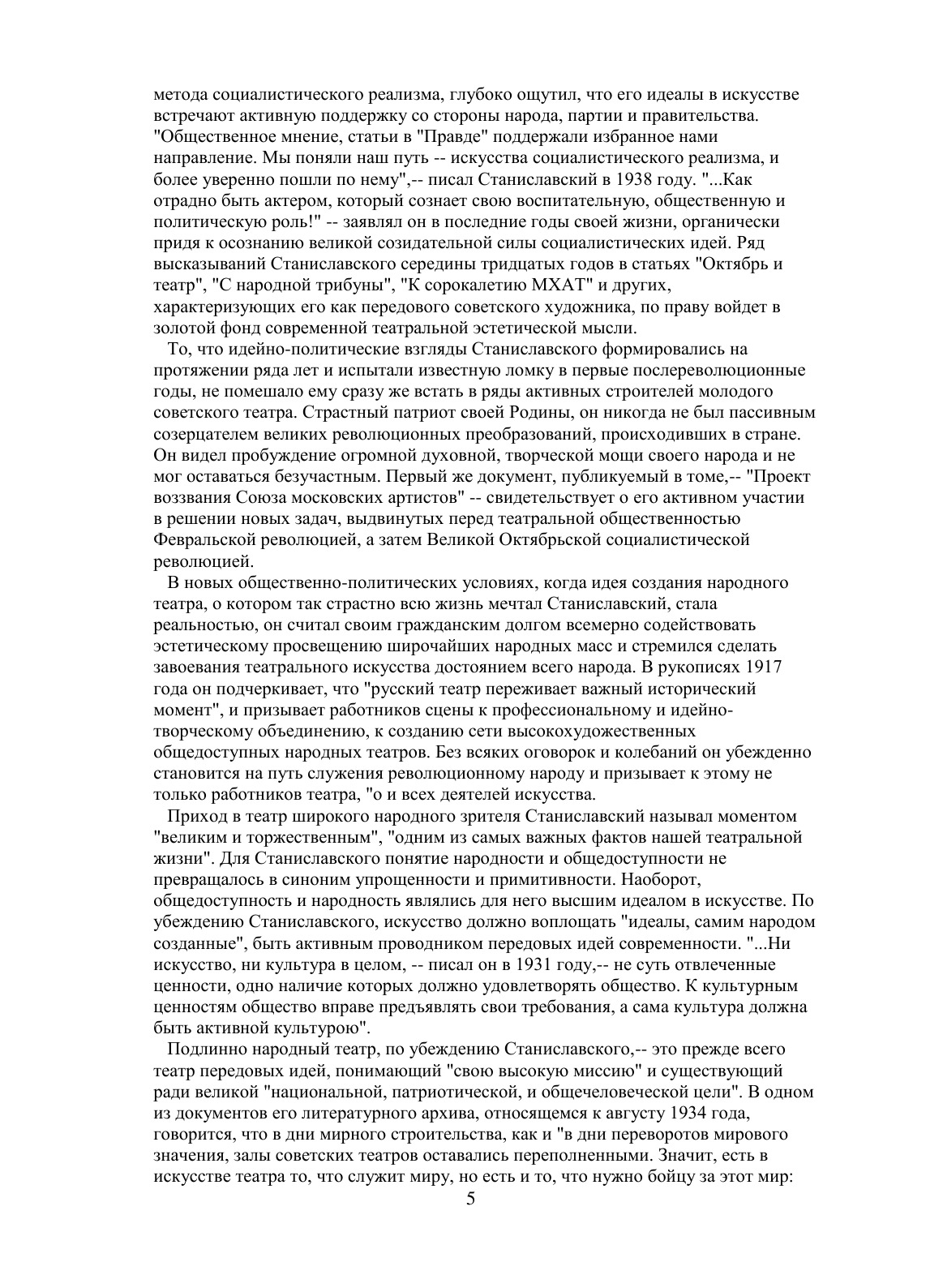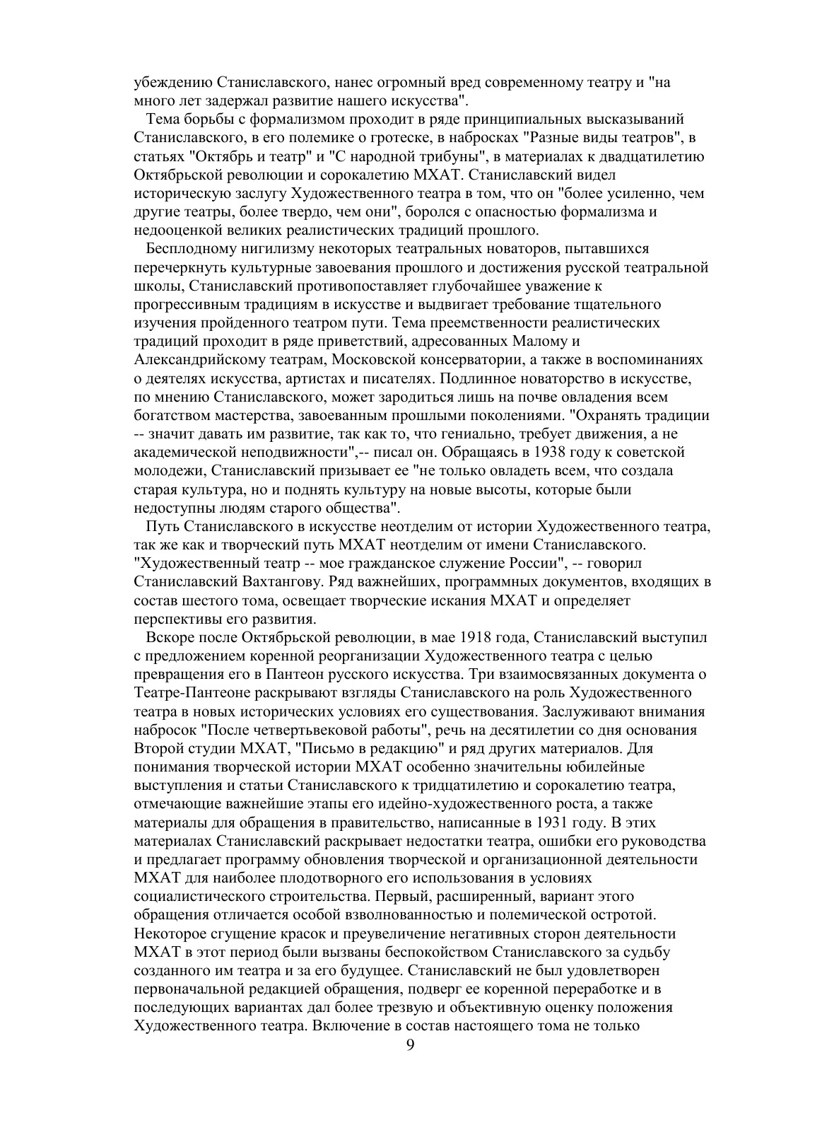 В шестом томе собраны статьи, речи, беседы, дневники, воспоминания. Эти материалы отражают творческий путь Станиславского, характеризуют его как выдающегося общественного и театрального деятеля, раскрывают процесс формирования и эволюции его взглядов на театральное искусство. Материалы этих томов дают представление о том, как "система", созданная Станиславским, применялась им самим в творческой практике театра. Значительная часть документов публикуется впервые. В приложениях к пятому и шестому томам в числе других материалов печатаются записи наиболее значительных высказываний Станиславского на репетициях и уроках, беседы его с деятелями театра и студийной молодежью.