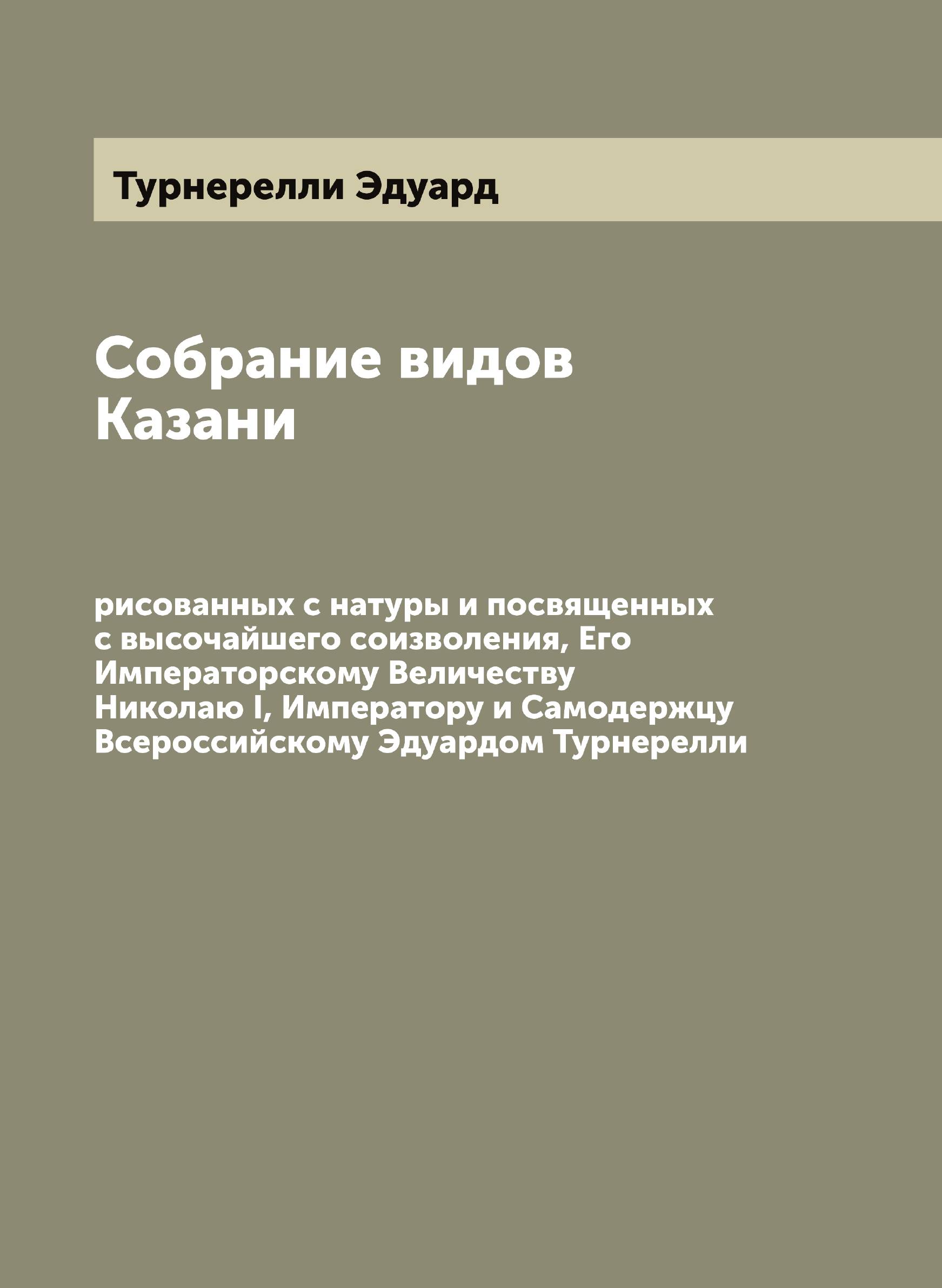 Печатная книга «Собрание видов Казани, рисованных с натуры и посвященных с высочайшего соизволения, Его Императорскому Величеству Николаю I, Императору и Самодержцу Всероссийскому Эдуардом Турнерелли» в мягкой обложке, язык - русский. В книге 60 страниц, она напечатана на белой офсетной бумаге плотностью 80 г/м². Формат издания — 205x280 мм. Все книги аккуратно упаковываем в прочный трёхслойный непрозрачный картонный конверт.