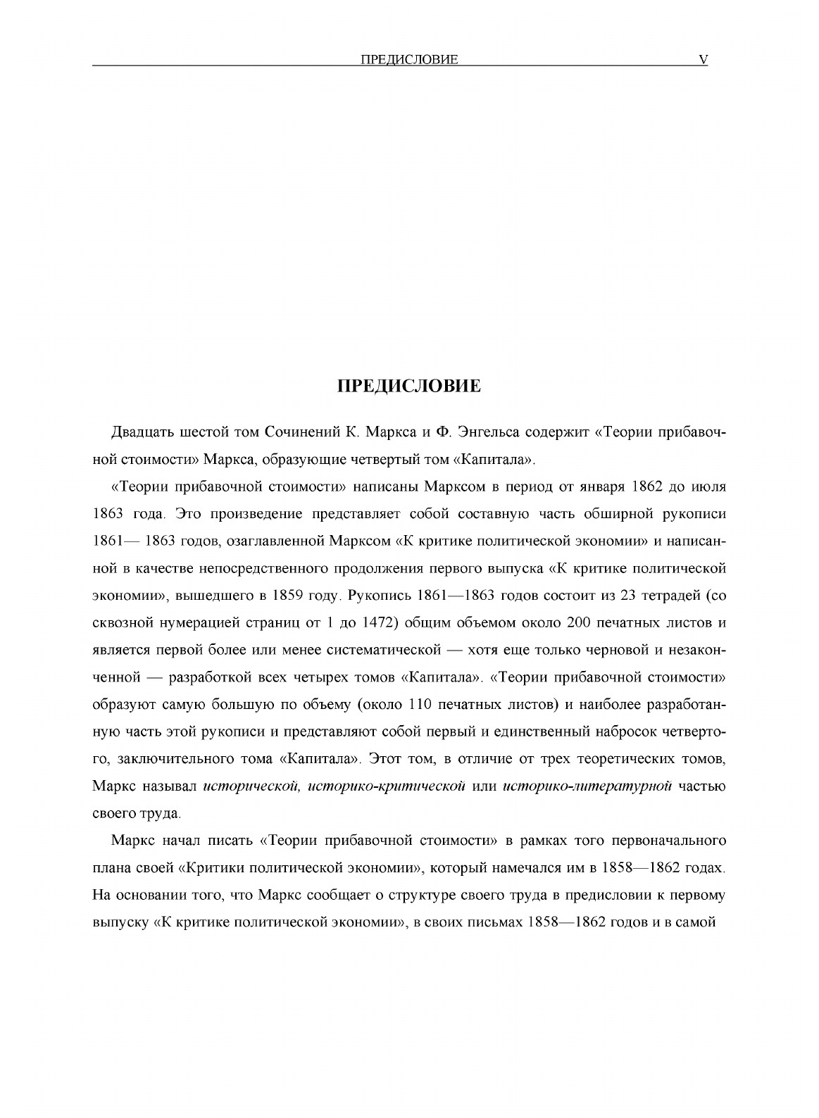 Двадцать шестой том Сочинений К. Маркса и Ф. Энгельса содержит «Теории прибавочной стоимости» Маркса, образующие четвертый том «Капитала».«Теории прибавочной стоимости» написаны Марксом в период от января 1862 до июля1863 года. Это произведение представляет собой составную часть обширной рукописи1861 1863 годов, озаглавленной Марксом «К критике политической экономии» и написанной в качестве непосредственного продолжения первого выпуска «К критике политическойэкономии», вышедшего в 1859 году. Рукопись 1861 1863 годов состоит из 23 тетрадей (сосквозной нумерацией страниц от 1 до 1472) общим объемом около 200 печатных листов иявляется первой более или менее систематической хотя еще только черновой и незаконченной разработкой всех четырех томов «Капитала». «Теории прибавочной стоимости»образуют самую большую по объему (около 110 печатных листов) и наиболее разработанную часть этой рукописи и представляют собой первый и единственный набросок четвертого, заключительного тома «Капитала». Этот том, в отличие от трех теоретических томов,Маркс называл исторической, историко-критической или историко-литературной частьюсвоего труда.