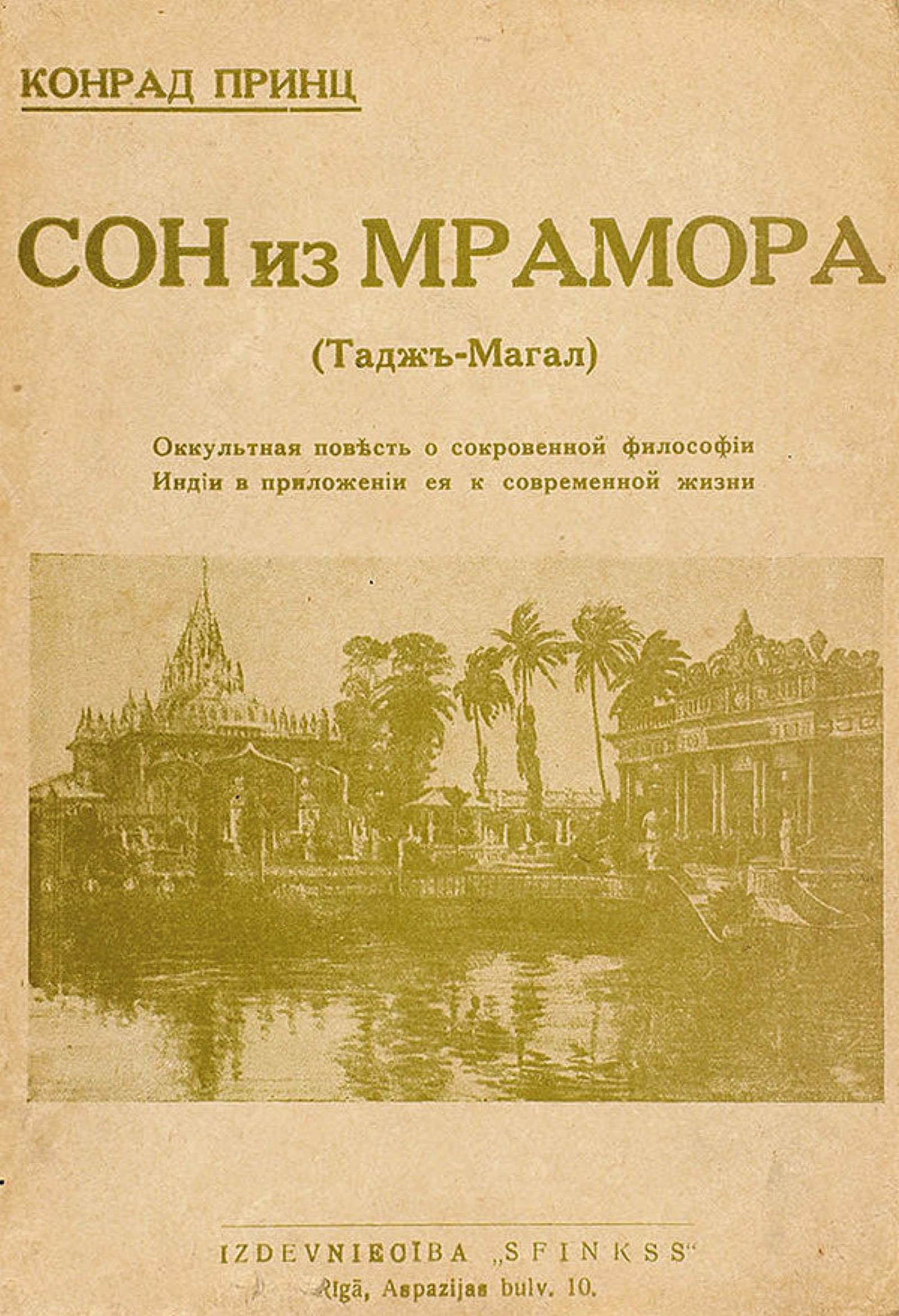 Принц, Конрад. Сон из мрамора [Текст] : [(Тадж-Магал)] : Оккультный роман / Конрад Принц. — Riga : Sfinkss, [1933]. — 167 с.; 20 см.