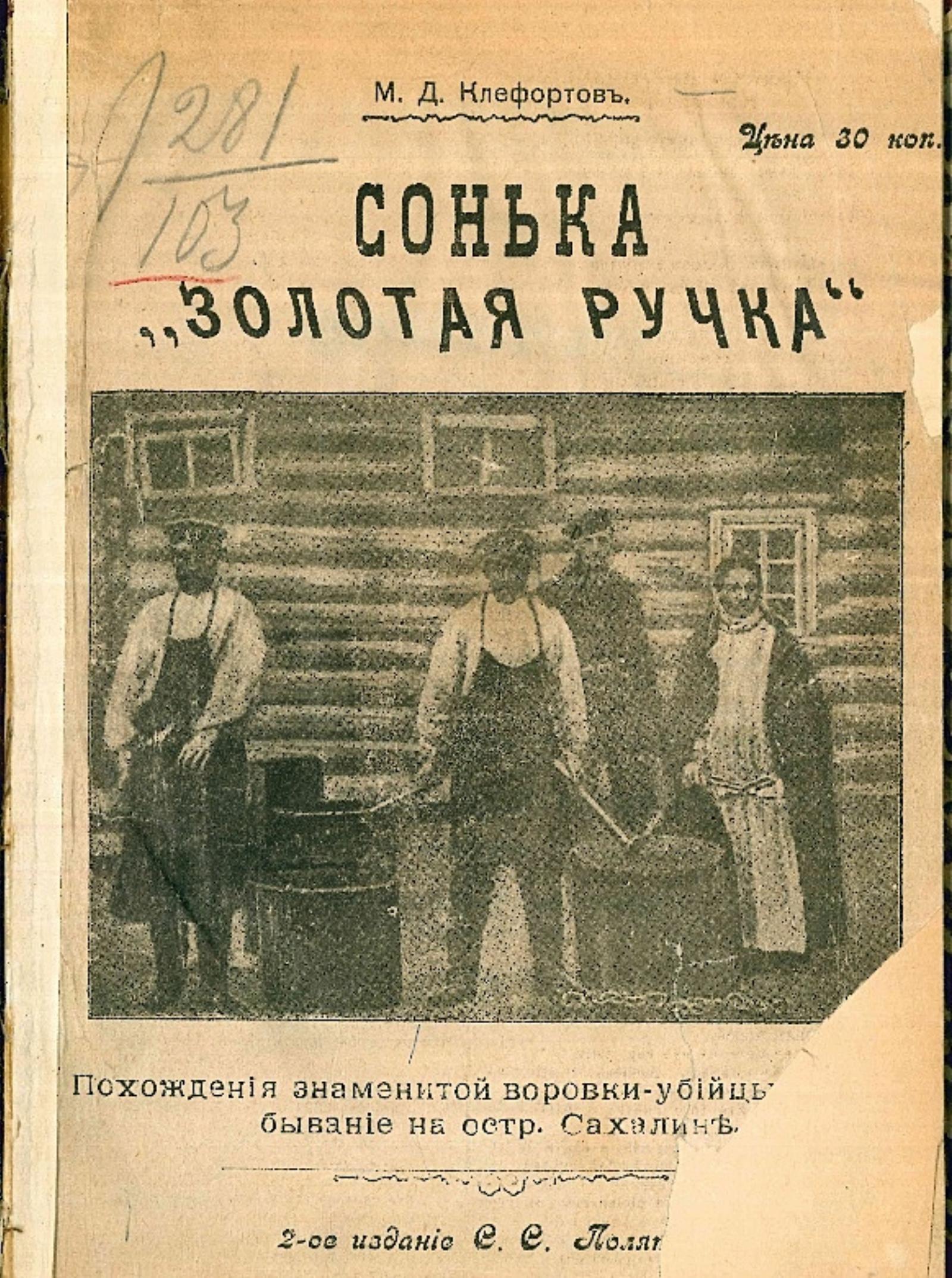 Клефортов, М. Д. Сонька «Золотая ручка» : Похождения знаменитой воровки-убийцы и ее пребывание на Сахалине / М. Д. Клефортов. — 2-е изд. — Одесса : С. С. Полятус, 1905. — 32 с.; 23.