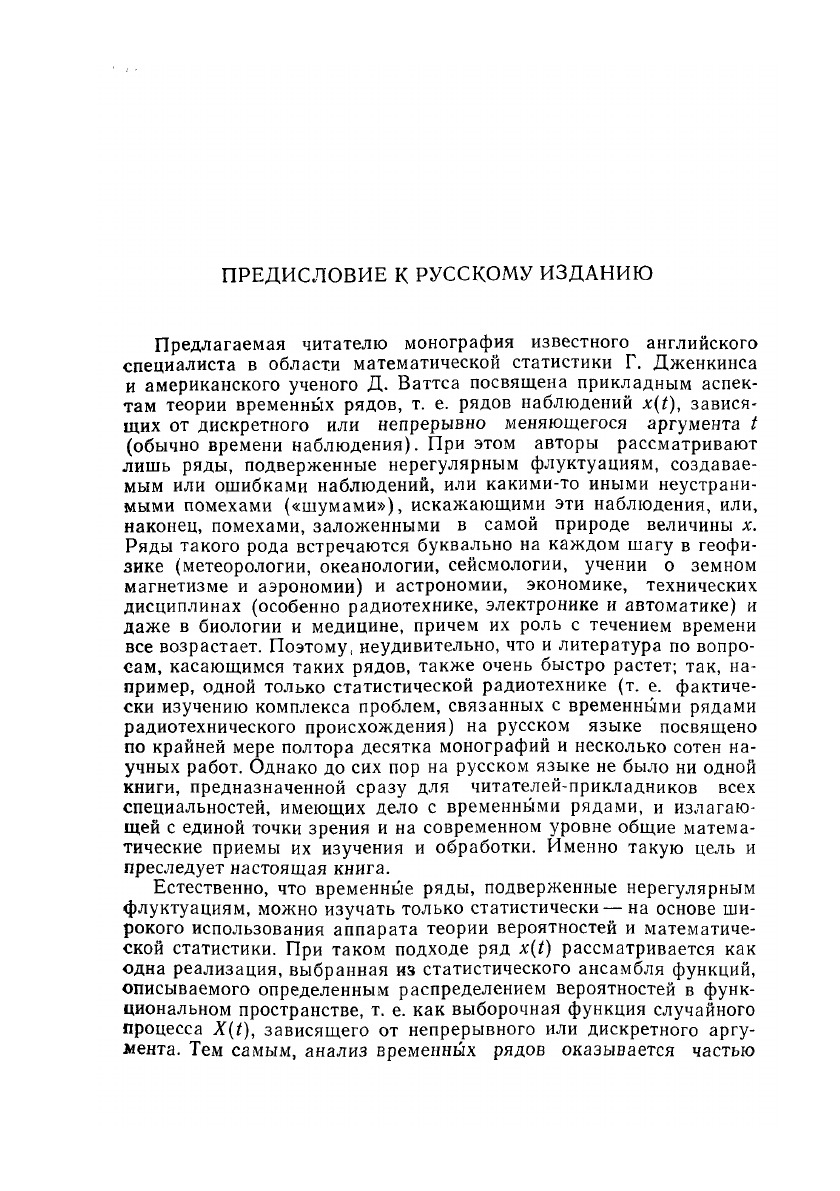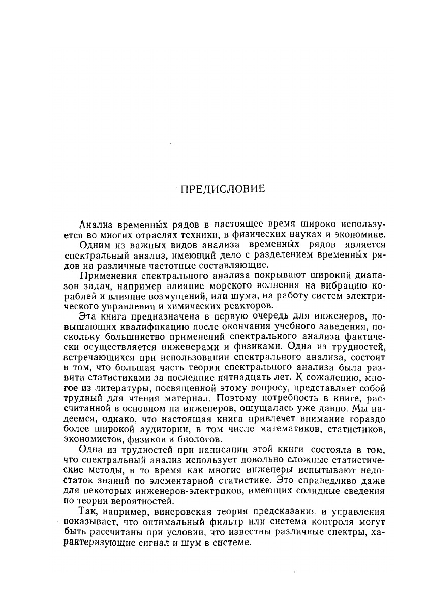 Спектральный анализ - новая и очень важная отрасль прикладной математики, посвященная выделению из наблюдаемых явлений или процессов периодических компонент, т. е. правильно меняющихся со временем составляющих. Подобные процессы очень часто встречаются в инженерном деле, различных отделах физики и геофизики, а также в экономике. Задача данной книги - дать инженеру или физику руководство, позволяющее овладеть приемами и методами спектрального анализа и применить их в своей практической работе. Для удобства читателей русское издание разделено на два выпуска. Выпуск 1 выйдет в 1971 г., выпуск 2-в начале 1972 г. В данный выпуск вошли общие принципы спектрального анализа, анализ Фурье, основы теории вероятностей и математической статистики, оценки корреляционных функций и спектров стационарных процессов. Книга будет полезна инженерно-техническим работникам, физикам, геофизикам, математикам-прикладникам и экономистам, а также студентам старших курсов, для которых она послужит ценным учебным пособием.
