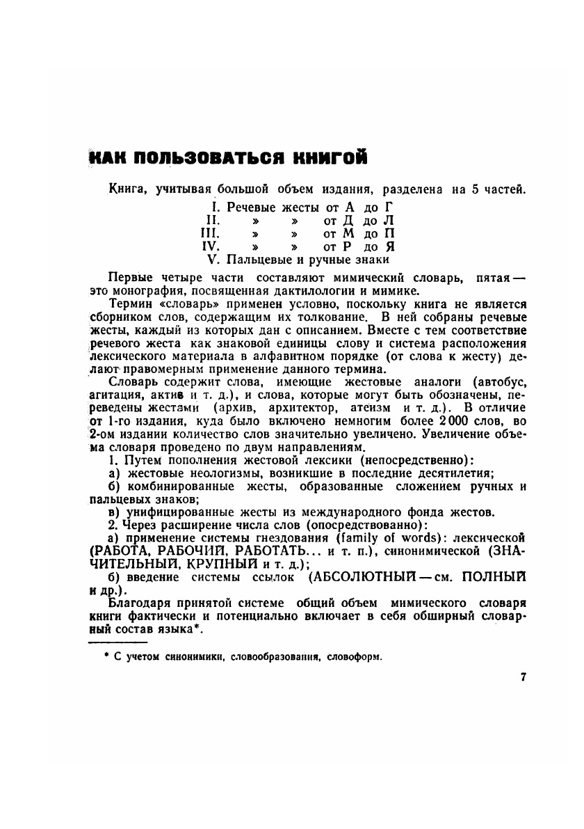 По словам автора, цель книги – дать наиболее полное описание ручной коммуникации как специфического средства общения глухих, зафиксировать современную мимику, общепринятую в «ареале Советского Союза». Включение в книгу практически всех общеупотребительных жестов, их фиксация через фотоиллюстрации и описание дают возможность использовать ее в качестве толкового словаря. Важнейшая задача книги – служить унификации мимики и повышению культуры жестовой речи. В настоящее время книга стала библиографической раритетом.