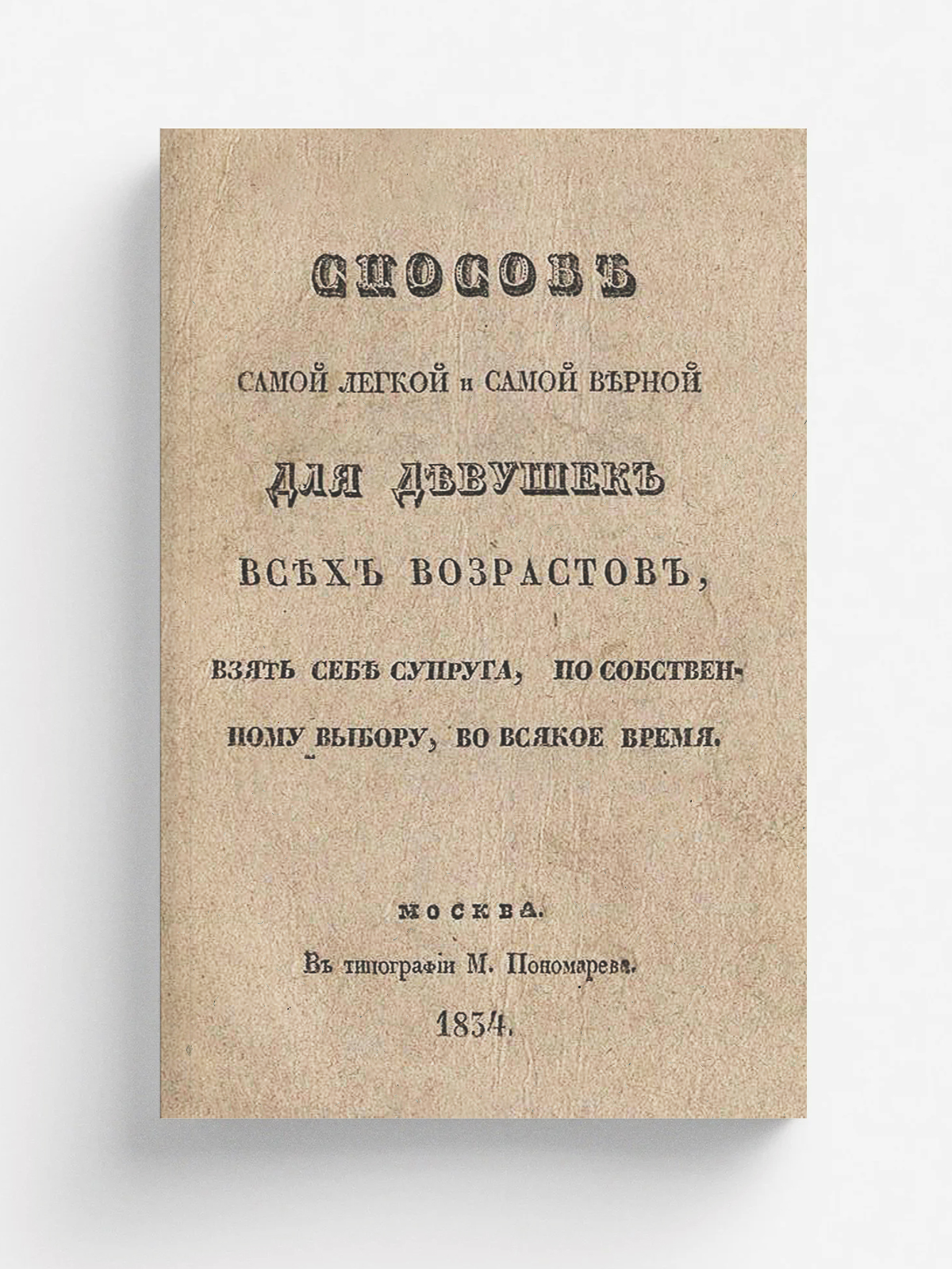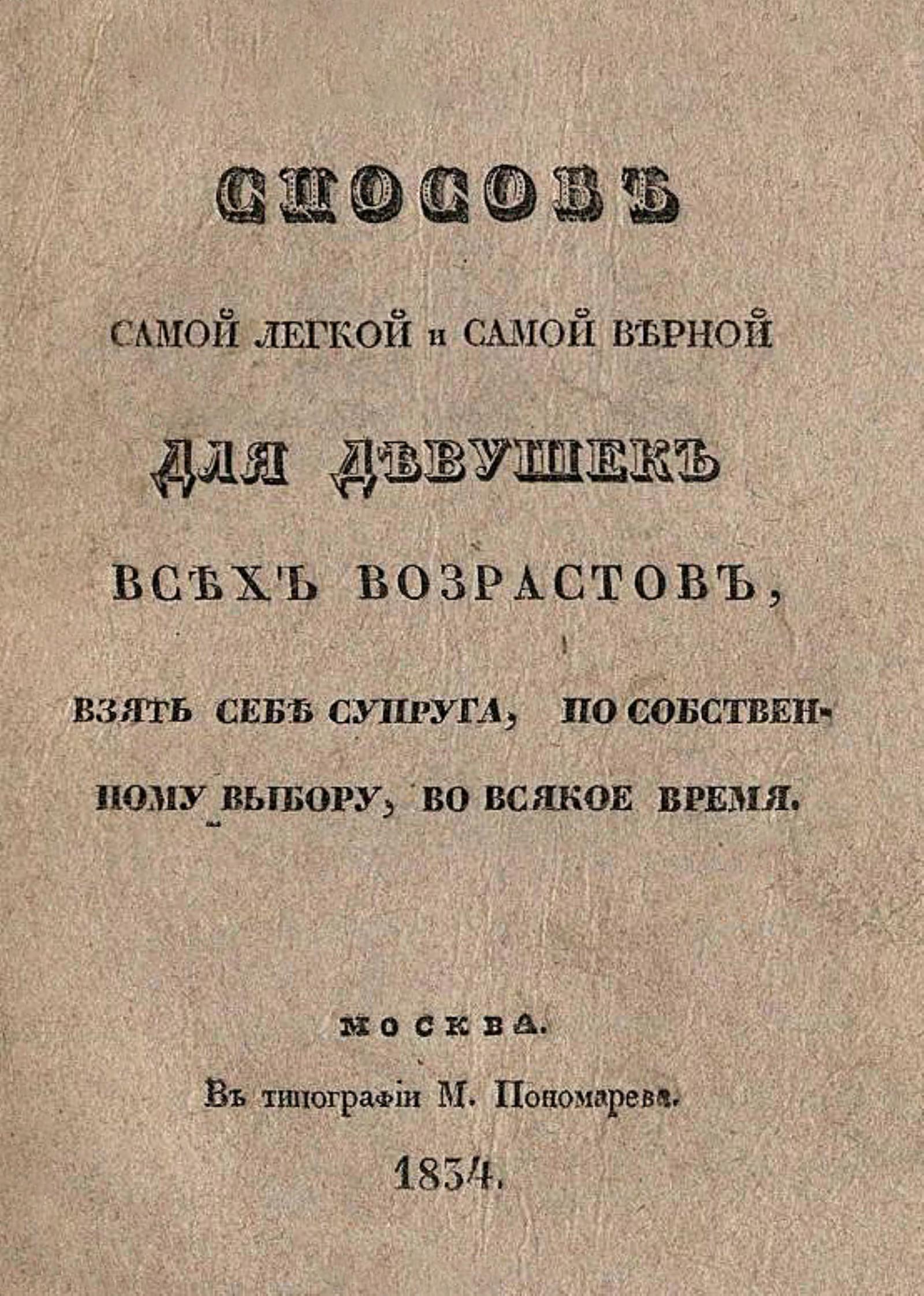 Способ самой легкой и самой верной для девушек всех возрастов, взять себе супруга, по собственному выбору, во всякое время. — Москва : тип. М. Пономарева, 1834. — [12], 24 с.; 20.