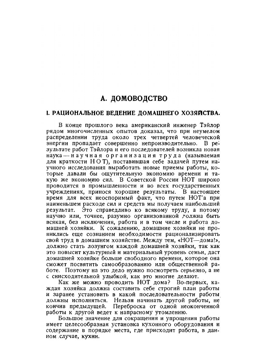 За последнее десятилетие условия нашей жизни резко изменились. В большинстве случаев, женщины, помимо хозяйства, заняты службой и общественной работой. Эти новые условия в корне изменили ведение домашнего хозяйства и в результате явилась потребность в новой книге, рассматривающей вопрос о домашнем хозяйстве под другим углом зрения. Эту задачу мы и поставили себе при составлении настоящей книги. В первую очередь мы обратили внимание на рациональное ведение домашнего хозяйства, ознакомив читательниц с основами научной организации труда и предложив ввести НОТ дома. Такая новая постановка внесет столь необходимый режим экономии в домашнее хозяйство и послужит к укреплению домашнего бюджета. Это даст, прежде всего, экономию времени и сил, а также экономию продуктов, которую мы постарались провести во всех рецептах, чем наша книга отличается от всех прежних поваренных книг...