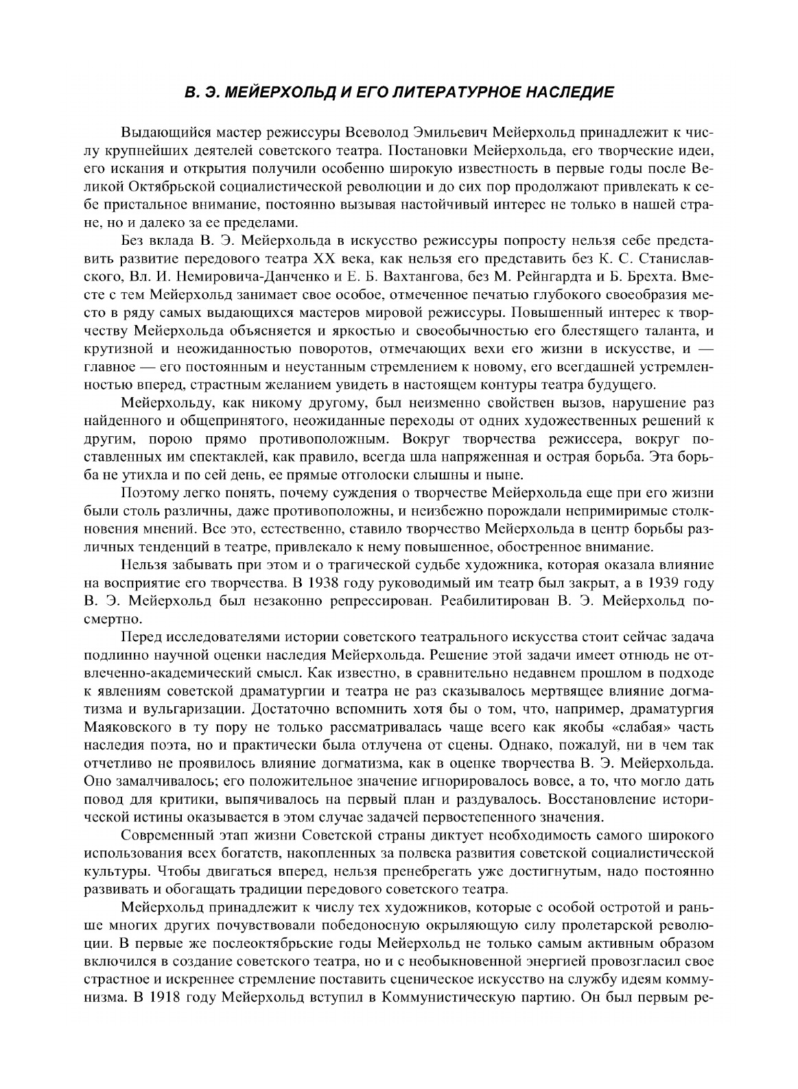 Выдающийся мастер режиссуры Всеволод Эмильевич Мейерхольд принадлежит к числу крупнейших деятелей советского театра. Постановки Мейерхольда, его творческие идеи, его искания и открытия получили особенно широкую известность в первые годы после Великой Октябрьской социалистической революции и до сих пор продолжают привлекать к се-бе пристальное внимание, постоянно вызывая настойчивый интерес не только в нашей стране, но и далеко за ее пределами.