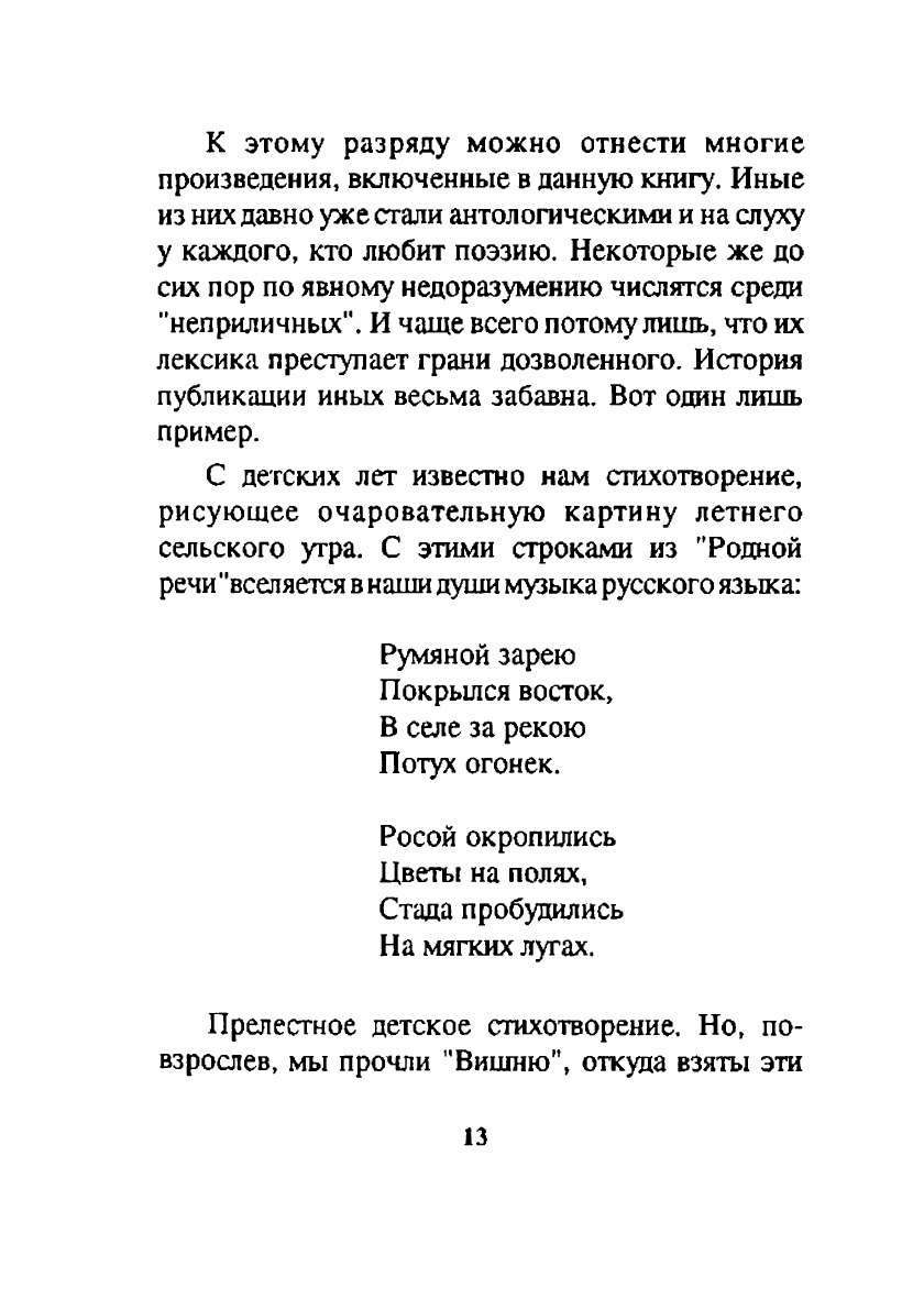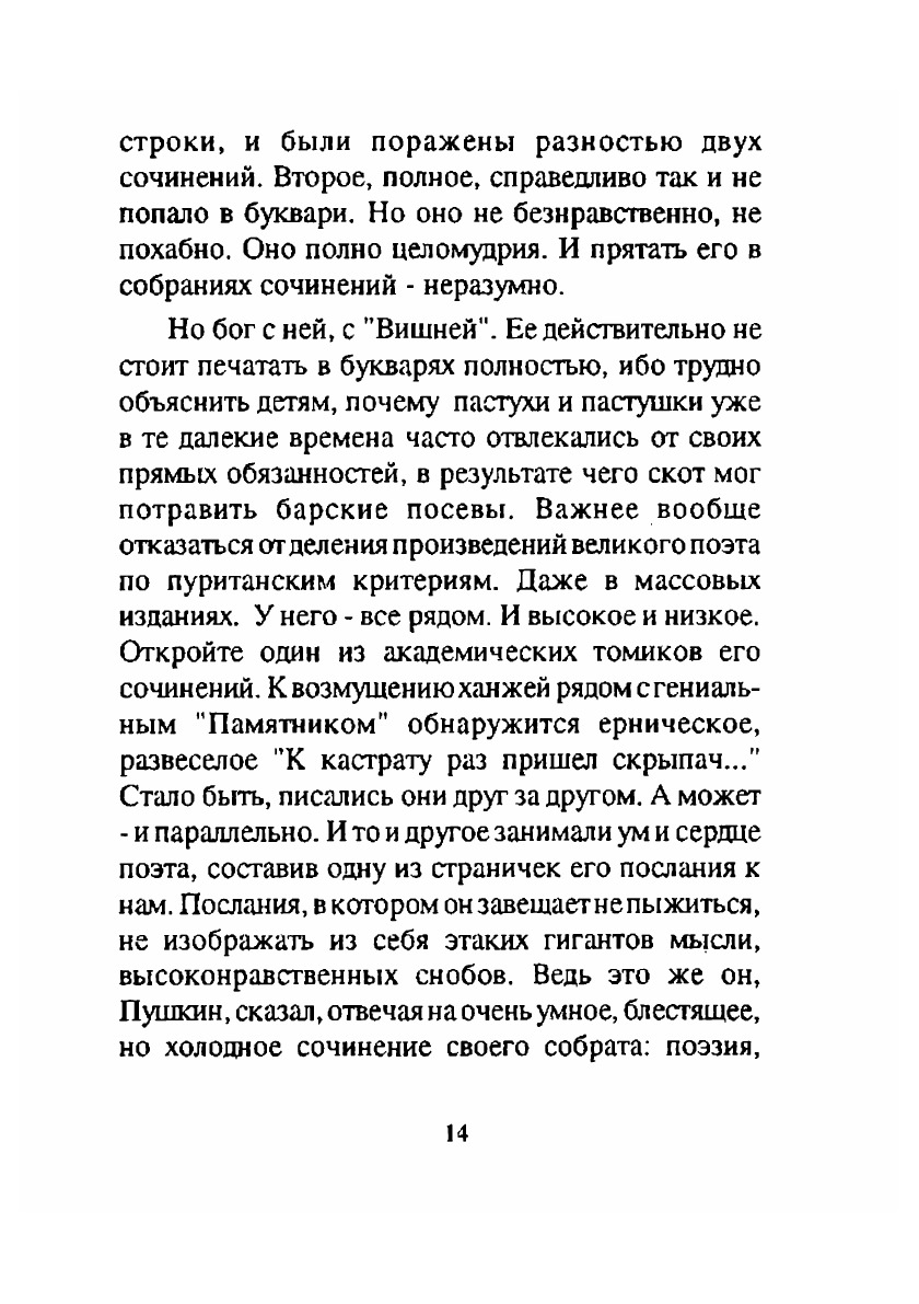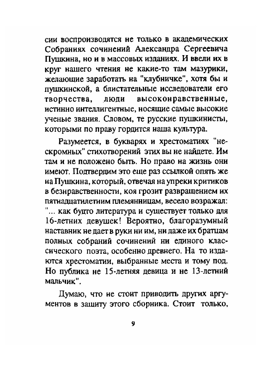 В эту книгу включены произведения, которые сам Пушкин отнес к разряду написанных не для печати. На каком основаниивключены они в сей сборник? Прежде всего на том, что уже более ста лет стихотворения сиивоспроизводятся не только в академических Собраниях сочинений Александра Сергеевича Пушкина,но и в массовых изданиях. И ввели их в круг нашего чтения не какие-то там мазурики, желающиезаработать на "клубничке", хотя бы и пушкинской, а блистательные исследователи его творчества,люди высоконравственные, истинно интеллигентные, носящие самые высокие ученые звания.Словом, те русские пушкинисты, которыми по праву гордится наша культура.Разумеется, в букварях и хрестоматиях "не- скромных" стихотворений этих вы не найдете. Имтам и не положено быть. Но право на жизнь они имеют. Подтвердим это еще раз ссылкой опять жена Пушкина, который, отвечая на упреки критиков в безнравственности, коя грозит развращением ихпятнадцатилетним племянницам, весело возражал: "... как будто литература и существует только для16-летних девушек! Вероятно, благоразумный наставник не дает в руки ни им, ни даже их братцамполных собраний сочинений ни единого классического поэта, особенно древнего. На то издаютсяхрестоматии, выбранные места и тому под. Но публика не 15-летняя девица и не 13-летний мальчик".Думаю, что не стоит приводить других аргументов в защиту этого сборника. Стоит только,пожалуй, сослаться на еще одно авторитетное имя и процитировать несколько строк из Белинского."Для Пушкина не было так называемой низкой природы; поэтому он не затруднялся никакимсравнением, никаким предметом, брал первый попавшийся под руку, и все у него являлосьпоэтическим, а потому прекрасным и благо- родным".