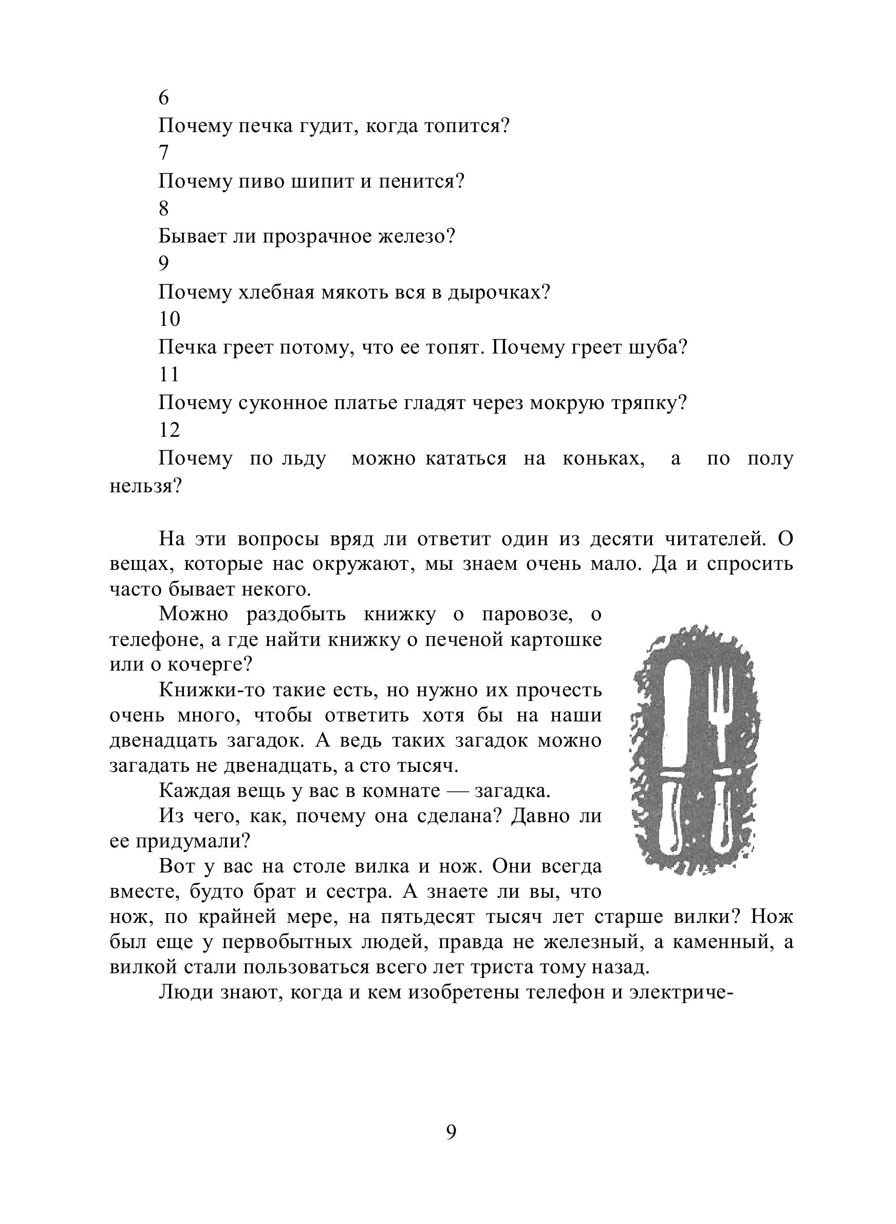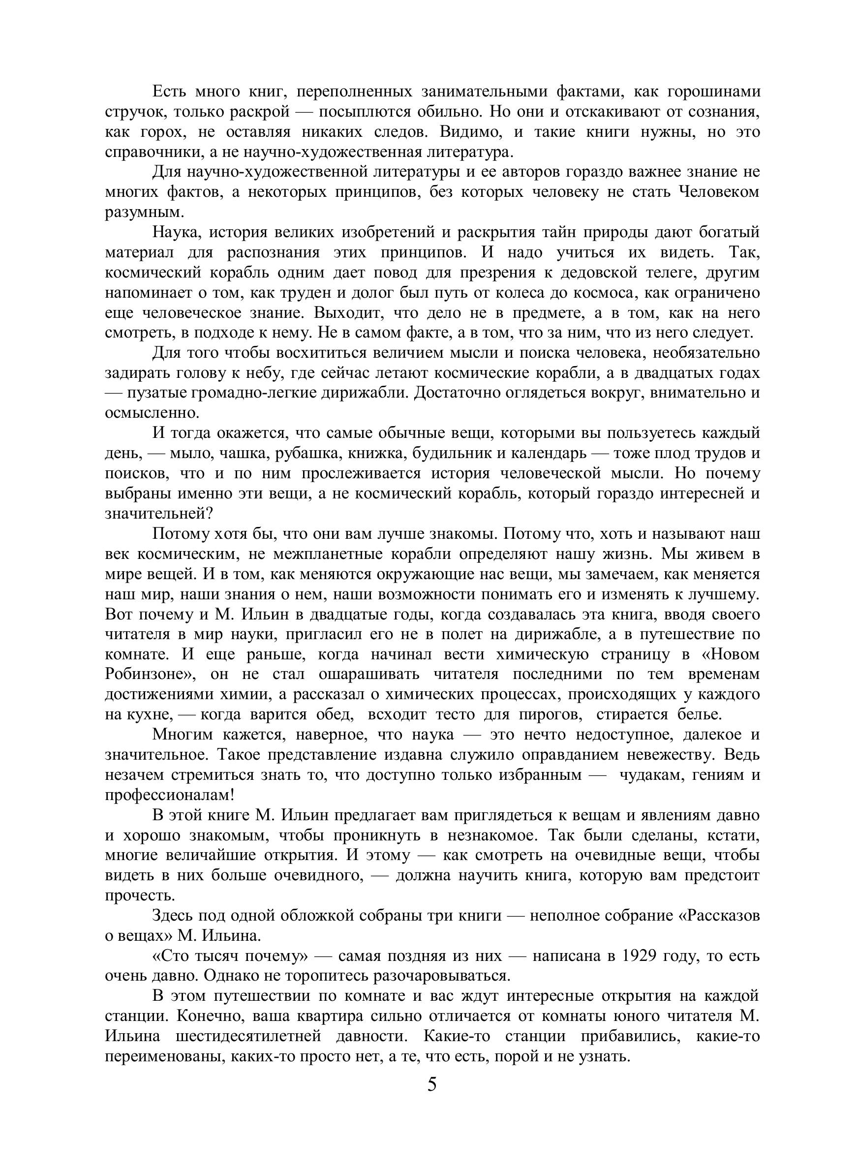 Эта книга "Сто тысяч почему" была написана в 1929 году. Написана замечательным автором, писавшим под псевдонимом М. Ильин.Настоящее имя автора - Маршак Илья Яковлевич – младший брат более известного Самуила Яковлевича.Эта книга "простых загадок со сложными отгадками". Загадок на первый взгляд таких простых, что и говорить-то не о чем. Загадки – окружающие нас вещи и явления.Что теплее: три рубашки или рубашка тройной толщины? Бывают ли стены из воздуха? Бывает ли у огня тень? Почему вода не горит? Может ли вода взорвать дом? Почему печка гудит, когда топится? Почему пиво шипит и пенится? Бывает ли прозрачное железо? Почему хлебная мякоть вся в дырочках? Печка греет потому, что ее топят. Почему греет шуба? Почему суконное платье гладят через мокрую тряпку? Почему по льду можно кататься на коньках, а по полу нельзя?Но подробно ответить на эти загадки и объяснить явления может не каждый. Ильин берет простые, обыденные вещи и явления и показывает все сложное, что их обуславливает, что стоит за ними. Переходя от простого к сложному.И пусть без мало век прошел от создания этой книги… И пусть печку современный человек уже и в деревне может редко увидеть… Тем не менее и в век нанотехнологий, отправиться с автором в экспедицию по комнате, для исследования простых и знакомых вещей и явлений, маленьким и взрослым будет не менее интересно, чем почти сто лет назад.Многим кажется, наверное, что наука — это нечто недоступное, далекое и значительное. Такое представление издавна служило оправданием невежеству. Ведь незачем стремиться знать то, что доступно только избранным — чудакам, гениям и профессионалам!В этой книге М. Ильин предлагает вам приглядеться к вещам и явлениям давно и хорошо знакомым, чтобы проникнуть в незнакомое. Так были сделаны, кстати, многие величайшие открытия. И этому — как смотреть на очевидные вещи, чтобы видеть в них больше очевидного, — должна научить книга, которую вам предстоит прочесть.Здесь под одной обложкой собраны три книги — неполное собрание «Рассказов о вещах» М. Ильина.«Сто тысяч почему» — самая поздняя из них — написана в 1929 году, то есть очень давно. Однако не торопитесь разочаровываться.В этом путешествии по комнате и вас ждут интересные открытия на каждой станции. Конечно, ваша квартира сильно отличается от комнаты юного читателя М. Ильина восьмидесятилетней давности. Какие-то станции прибавились, какие-то переименованы, каких-то просто нет, а те, что есть, порой и не узнать.