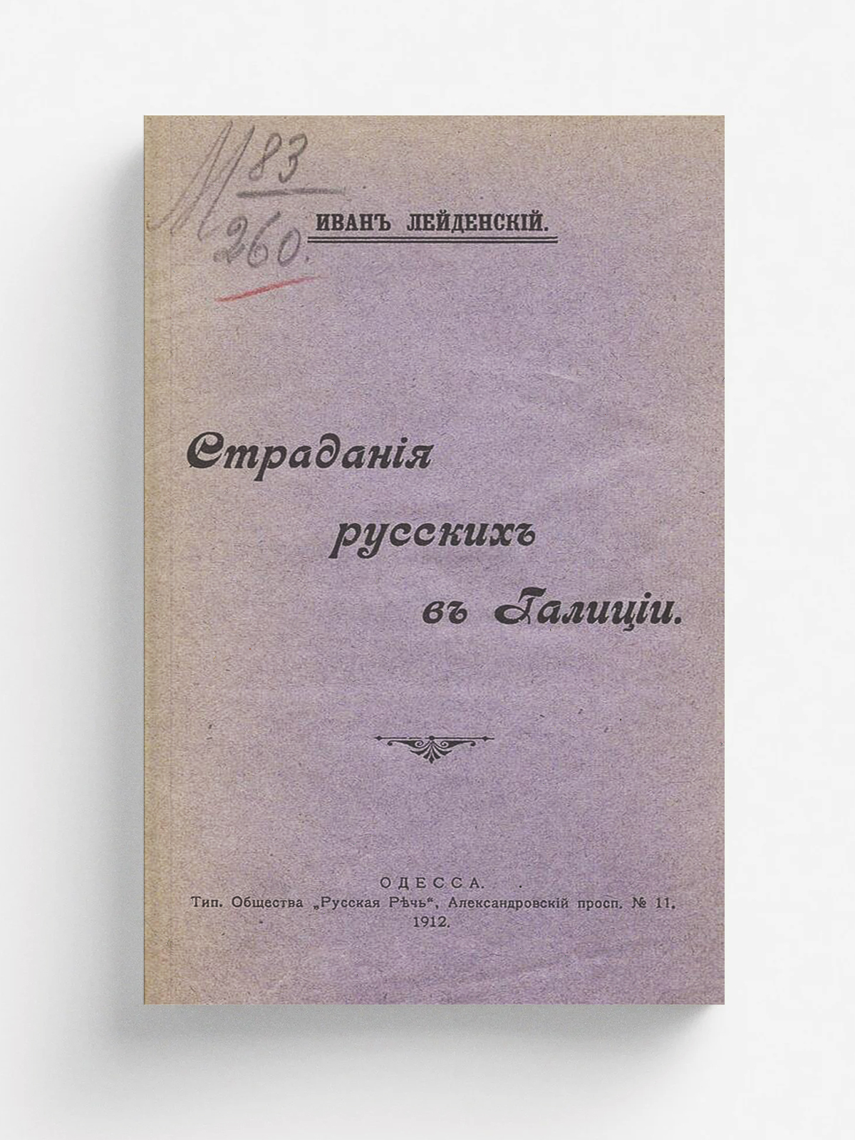 Курдиновский, Виктор Ильич (1867–?). Страдания русских в Галиции / Иван Лейденский [псевд.]. — Одесса : Типография о-ва «Русская речь», 1912. — 14 с.; 19 см.