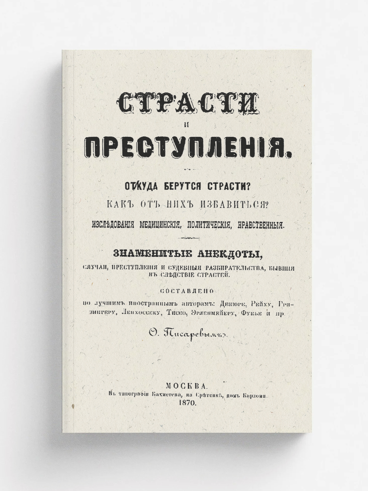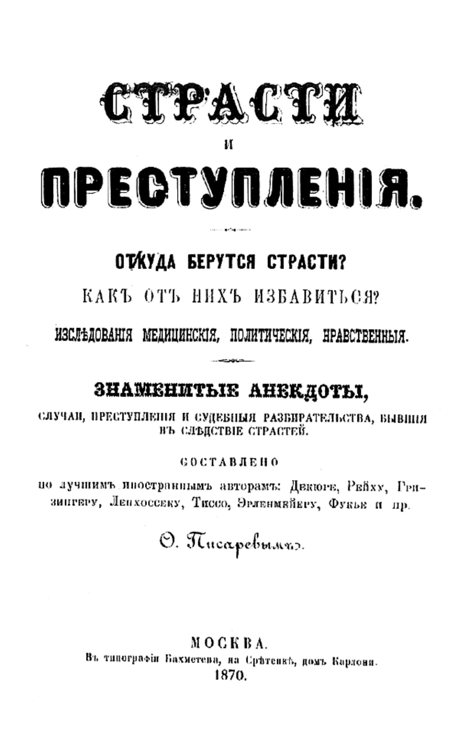 Писарев, О. Страсти и преступления : Откуда берутся страсти? Как от них избавиться? : Исследования медицинские, политические, нравственные. Знаменитые анекдоты, случаи, преступления и судебные разбирательства, бывшие вследствие страстей : Сост. по лучшим иностр. авт.: Декюре, Рейху, Гризингеру... и пр. О. Писаревым. — Москва : тип. Бахметева, 1870. — [2], L, 508, X с.; 22.