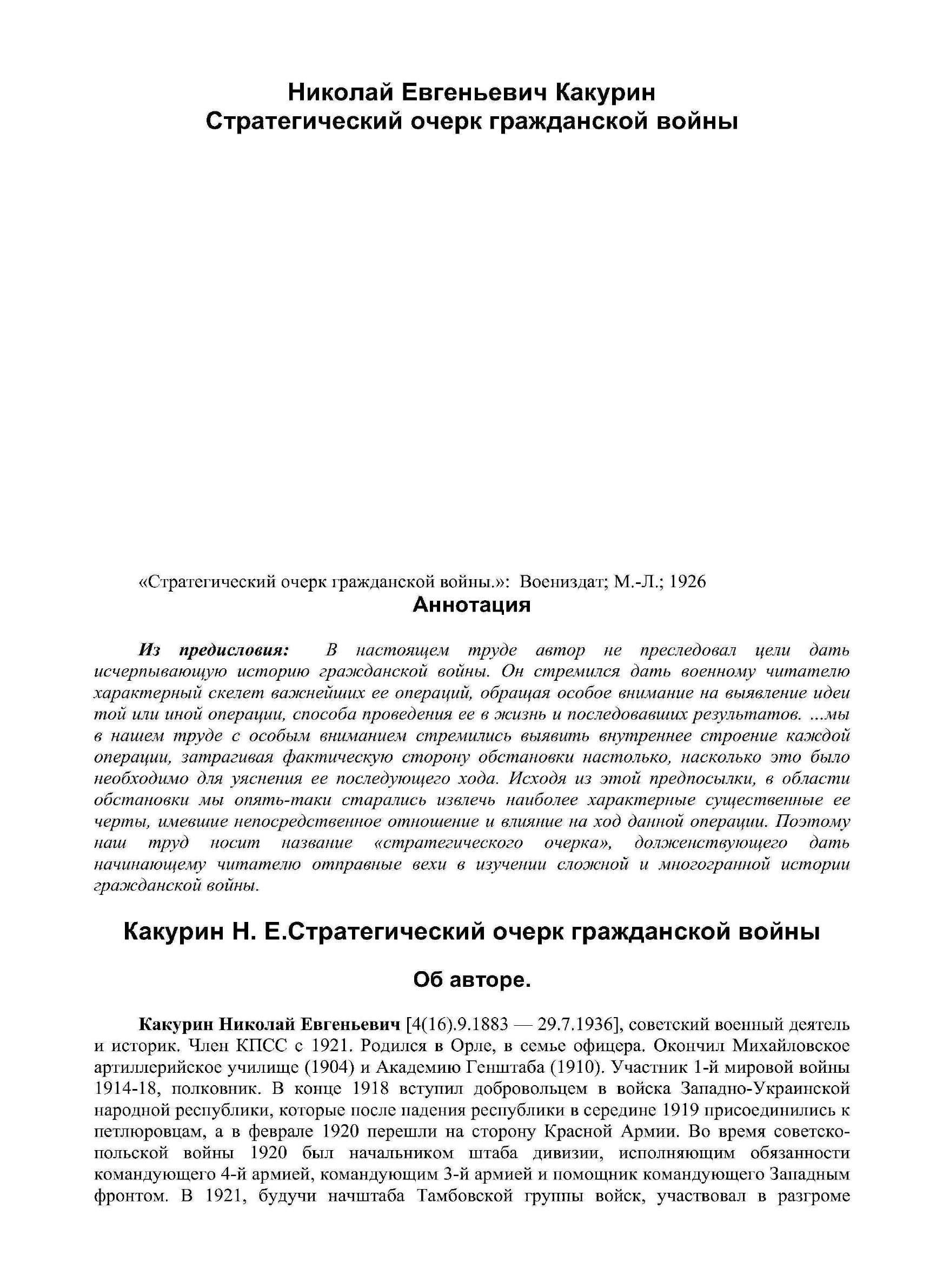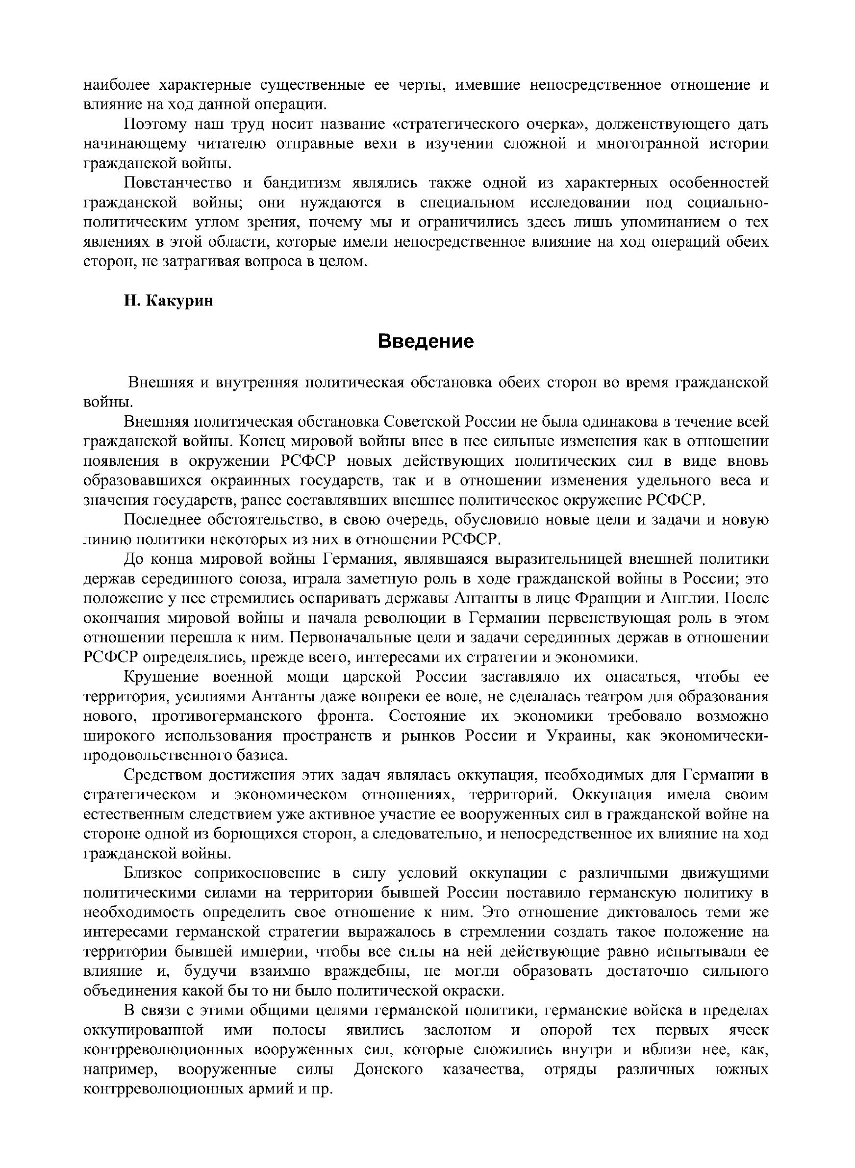 В настоящем труде автор не преследовал цели дать исчерпывающую историю гражданской войны. Он стремился дать военному читателю характерный скелет важнейших ее операций, обращая особое внимание на выявление идеи той или иной операции, способа проведения ее в жизнь и последовавших результатов. мы в нашем труде с особым вниманием стремились выявить внутреннее строение каждой операции, затрагивая фактическую сторону обстановки настолько, насколько это было необходимо для уяснения ее последующего хода. Исходя из этой предпосылки, в области обстановки мы опять-таки старались извлечь наиболее характерные существенные ее черты, имевшие непосредственное отношение и влияние на ход данной операции. Поэтому наш труд носит название «стратегического очерка», долженствующего дать начинающему читателю отправные вехи в изучении сложной и многогранной истории гражданской войны.