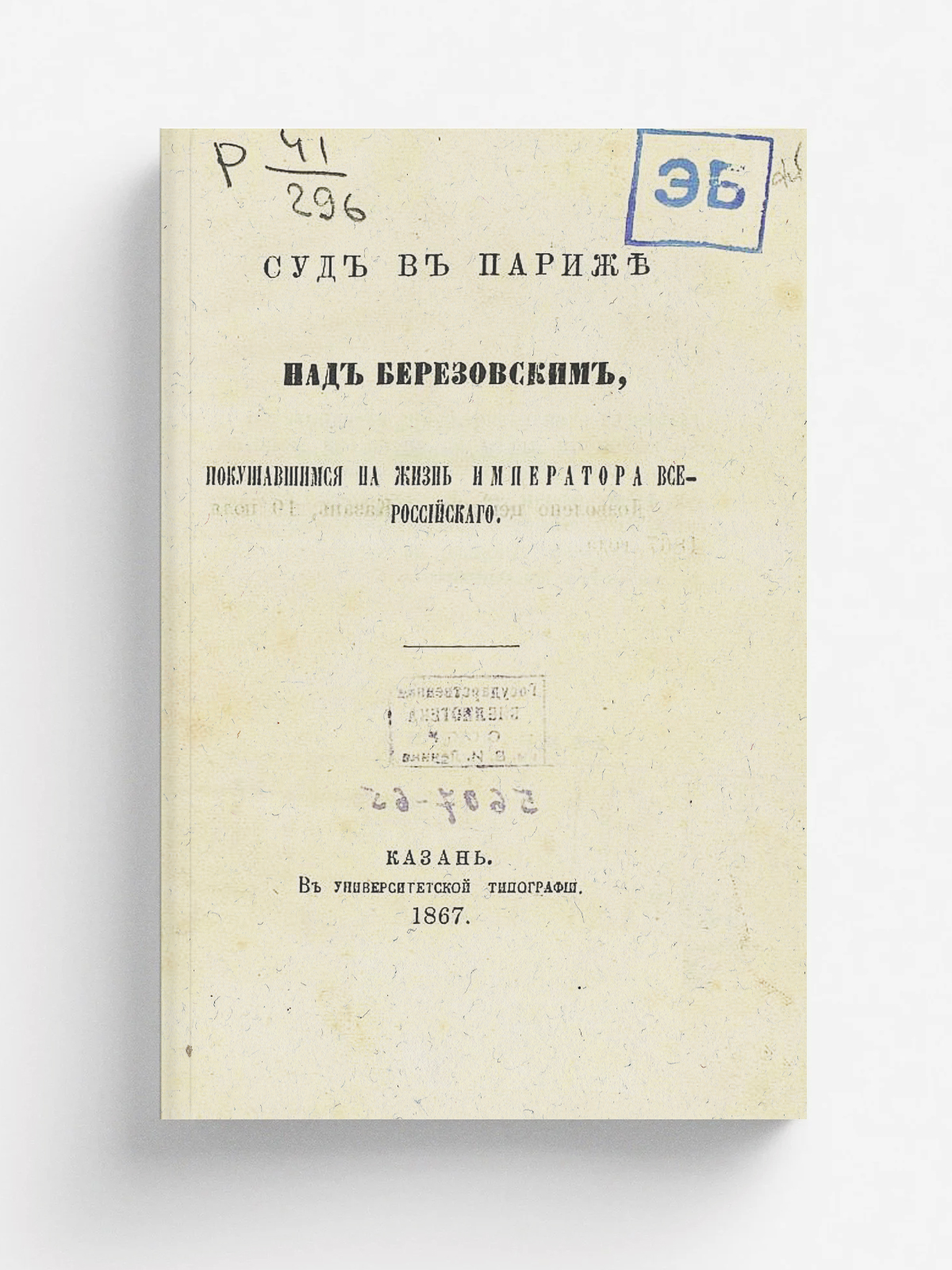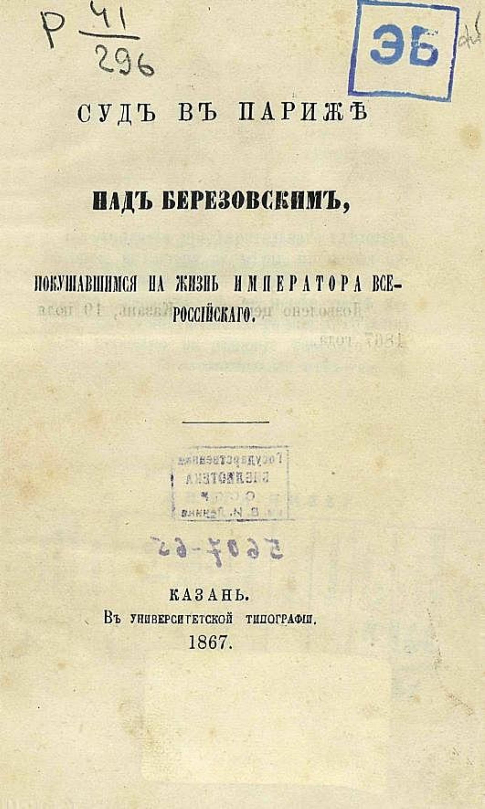 Суд в Париже над Березовским, покушавшимся на жизнь императора всероссийского. — Казань : Унив. тип., 1867. — 33 с.; 16.