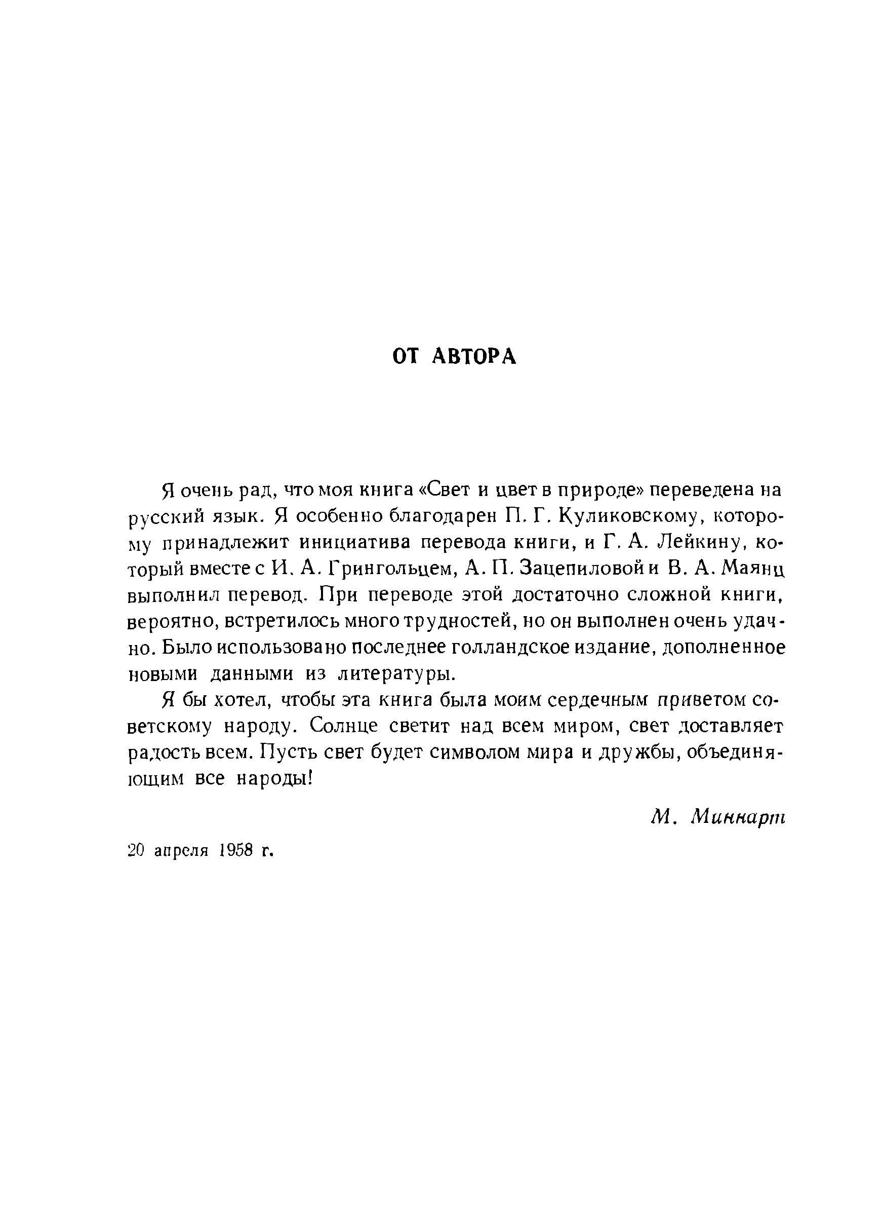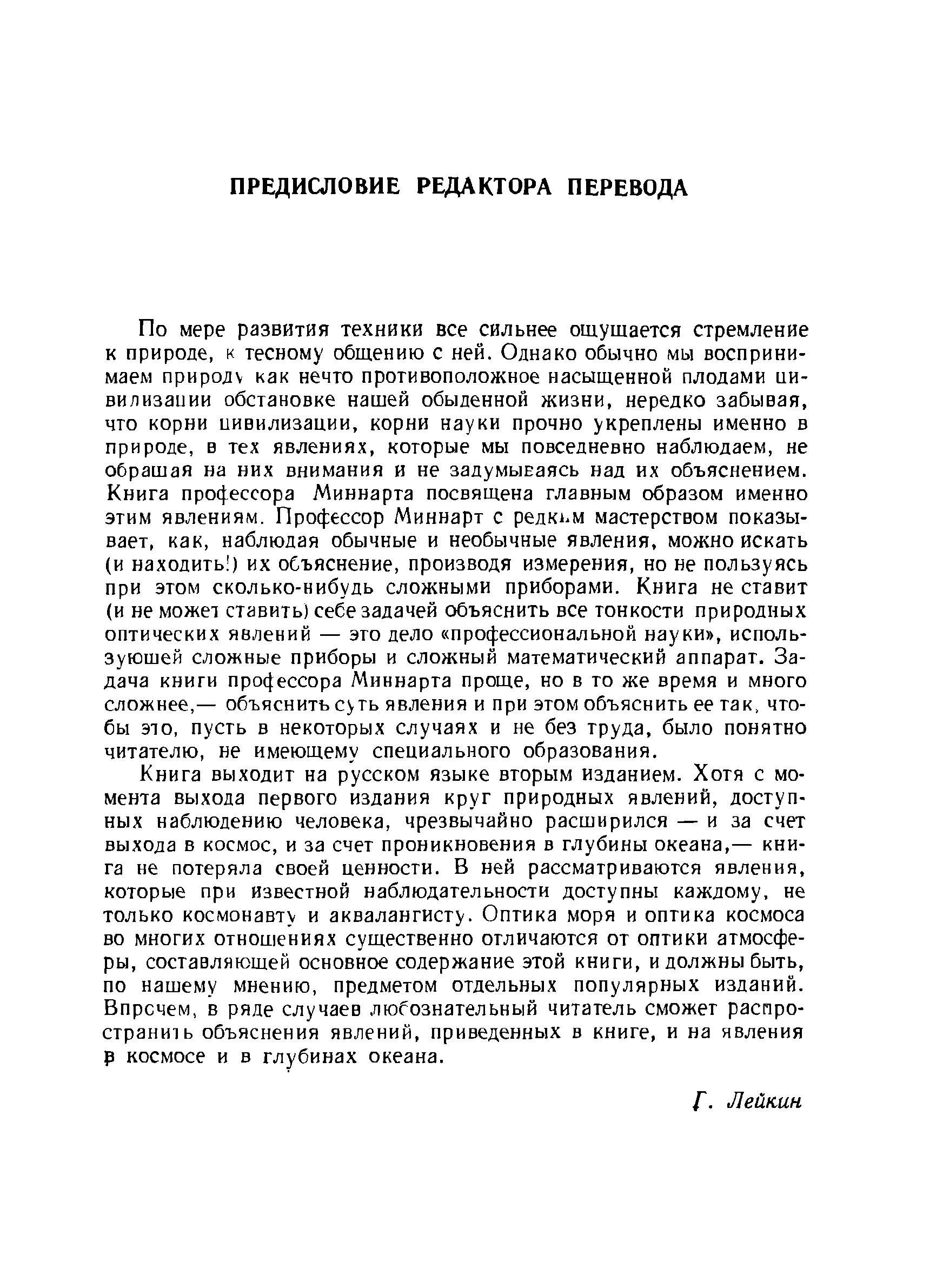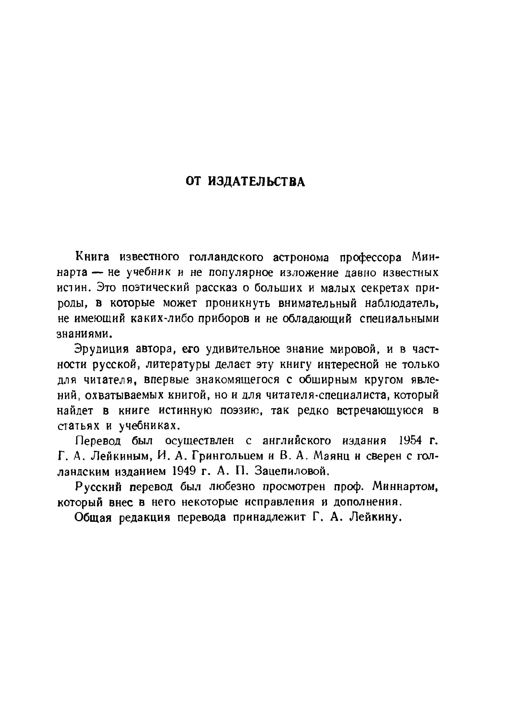 Книга известного голландского астронома профессора Миннарта - не учебник и не популярное изложение давно известных истин. Это поэтический рассказ о больших и малых секретах природы, в которые может проникнуть внимательный наблюдатель, не имеющий каких-либо приборов и не обладающий специальными знаниями. Эрудиция автора, его удивительное знание мировой, и в частности русской, литературы делает эту книгу интересной не только для читателя, впервые знакомящегося с обширным кругом явлений, охватываемых книгой, но и для читателя-специалиста, который найдет в книге истинную поэзию, так редко встречающуюся в статьях и учебниках. Перевод был осуществлен с английского издания 1954 г. Г.А. Лейкиным, И.А. Грингольцем и В.А. Маянц и сверен с голландским изданием 1949 г. А.П. Зацепиловой. Русский перевод был любезно просмотрен проф. Миннартом, который внес в него некоторые исправления и дополнения. Общая редакция перевода принадлежит Г.А. Лейкину.