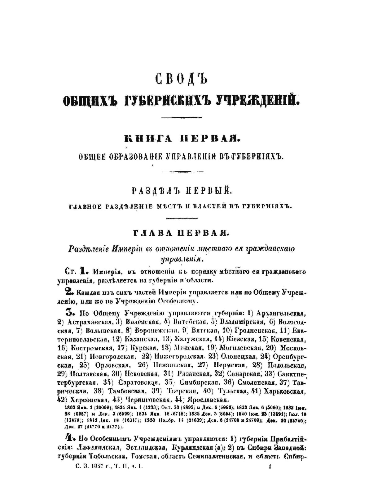 Оригинальное название: Сводъ законовъ Россiйской имперiи. Томъ второй. Часть I. Общее губернское учрежденiеСвод законов Российской империи— официальное собрание расположенных в тематическом порядке действующих законодательных актов Российской империи, созданное при Николае I. Впервые он был напечатан в 1832 году. Манифестом 31 января 1833 года Свод законов был объявлен действующим источником права с 1 января 1835 года. Первое издание 1832 года и последующие 1842-го и 1857 года состояли из пятнадцати томов. После 1857 года Свод законов полностью не переиздавался, а выходили лишь отдельные тома. В качестве отдельного – 16-го тома в 1885 году вышли Судебные уставы. Между изданиями Свода законов выходили ежегодные и сводные (за несколько лет) «Продолжения» Свода законов с указанием на упраздненные и измененные статьи. В своде законов собраны все реально действовавшие в определенный момент времени законы по тем или иным проблемам права, это справочник для юристов. Отбор законодательного материала для включения в Свод производился на основе Полного собрания законов (первое Полное собрание законов, появившееся в 1830 году, состояло из 45 томов, содержащих 30 920 актов и 6 томов приложений). Собрание законов – это в большой степени историческое издание. По нему можно изучать развитие, направление правительственной мысли в стране. Это летопись отечественного законотворчества. Изучая страницу за страницей эту летопись, мы можем узнать, что в тот или иной момент истории являлось злобой дня.