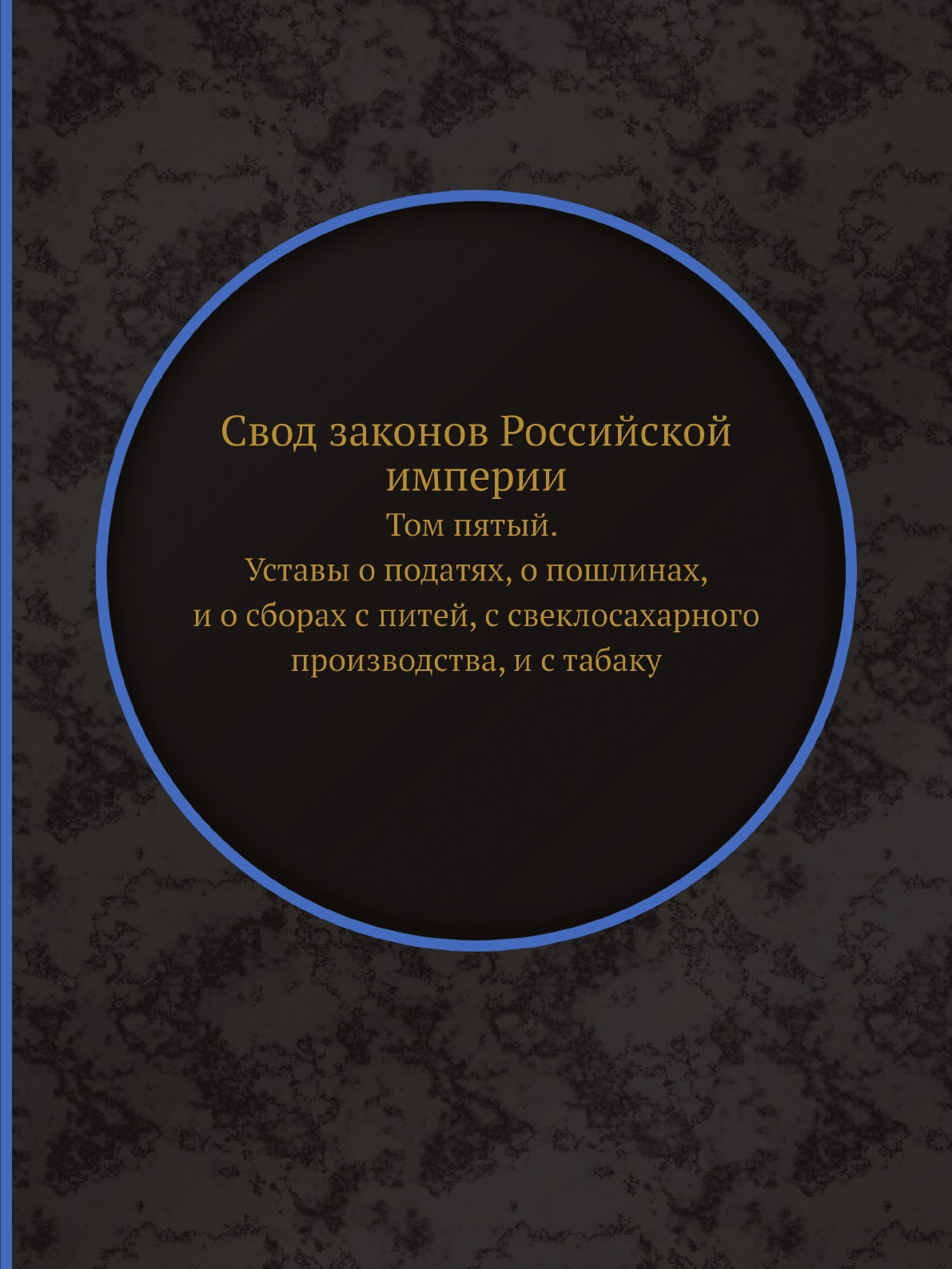 Оригинальное название: Сводъ законовъ Россiйской имперiи. Томъ пятый. Уставы о податяхъ, о пошлинахъ, и о сборахъ съ питей, с свеклосахарнаго производства, и съ табакуСвод законов Российской империи— официальное собрание расположенных в тематическом порядке действующих законодательных актов Российской империи, созданное при Николае I. Впервые он был напечатан в 1832 году. Манифестом 31 января 1833 года Свод законов был объявлен действующим источником права с 1 января 1835 года. Первое издание 1832 года и последующие 1842-го и 1857 года состояли из пятнадцати томов. После 1857 года Свод законов полностью не переиздавался, а выходили лишь отдельные тома. В качестве отдельного – 16-го тома в 1885 году вышли Судебные уставы. Между изданиями Свода законов выходили ежегодные и сводные (за несколько лет) «Продолжения» Свода законов с указанием на упраздненные и измененные статьи. В своде законов собраны все реально действовавшие в определенный момент времени законы по тем или иным проблемам права, это справочник для юристов. Отбор законодательного материала для включения в Свод производился на основе Полного собрания законов (первое Полное собрание законов, появившееся в 1830 году, состояло из 45 томов, содержащих 30 920 актов и 6 томов приложений). Собрание законов – это в большой степени историческое издание. По нему можно изучать развитие, направление правительственной мысли в стране. Это летопись отечественного законотворчества. Изучая страницу за страницей эту летопись, мы можем узнать, что в тот или иной момент истории являлось злобой дня.