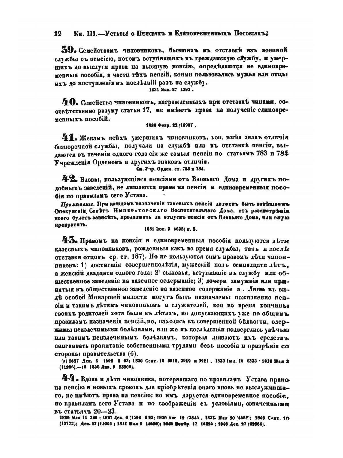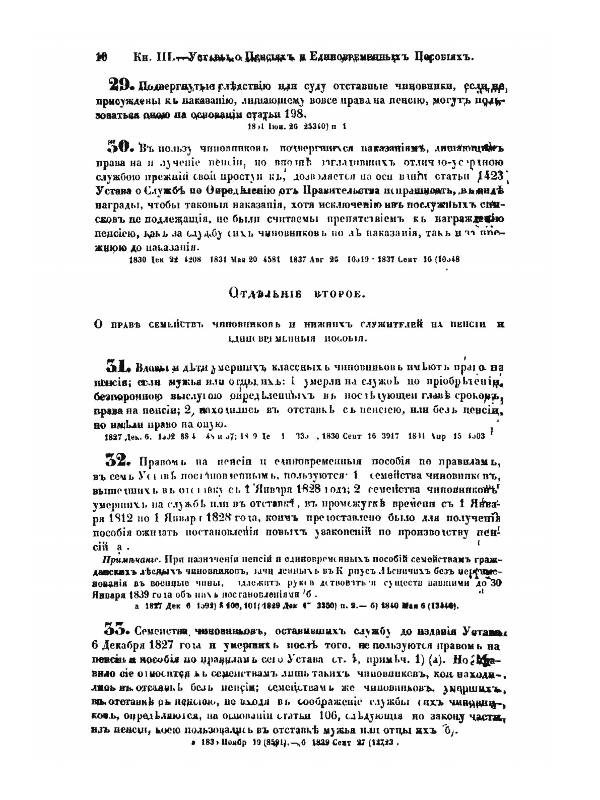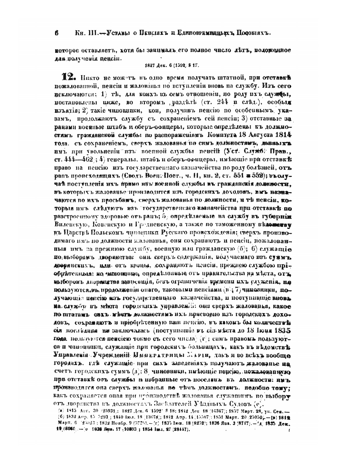 Оригинальное название: Сводъ законовъ Россiйской имперiи. Томъ третiй. Уставы о службѣ гражданскойСвод законов Российской империи— официальное собрание расположенных в тематическом порядке действующих законодательных актов Российской империи, созданное при Николае I. Впервые он был напечатан в 1832 году. Манифестом 31 января 1833 года Свод законов был объявлен действующим источником права с 1 января 1835 года. Первое издание 1832 года и последующие 1842-го и 1857 года состояли из пятнадцати томов. После 1857 года Свод законов полностью не переиздавался, а выходили лишь отдельные тома. В качестве отдельного – 16-го тома в 1885 году вышли Судебные уставы. Между изданиями Свода законов выходили ежегодные и сводные (за несколько лет) «Продолжения» Свода законов с указанием на упраздненные и измененные статьи. В своде законов собраны все реально действовавшие в определенный момент времени законы по тем или иным проблемам права, это справочник для юристов. Отбор законодательного материала для включения в Свод производился на основе Полного собрания законов (первое Полное собрание законов, появившееся в 1830 году, состояло из 45 томов, содержащих 30 920 актов и 6 томов приложений). Собрание законов – это в большой степени историческое издание. По нему можно изучать развитие, направление правительственной мысли в стране. Это летопись отечественного законотворчества. Изучая страницу за страницей эту летопись, мы можем узнать, что в тот или иной момент истории являлось злобой дня.