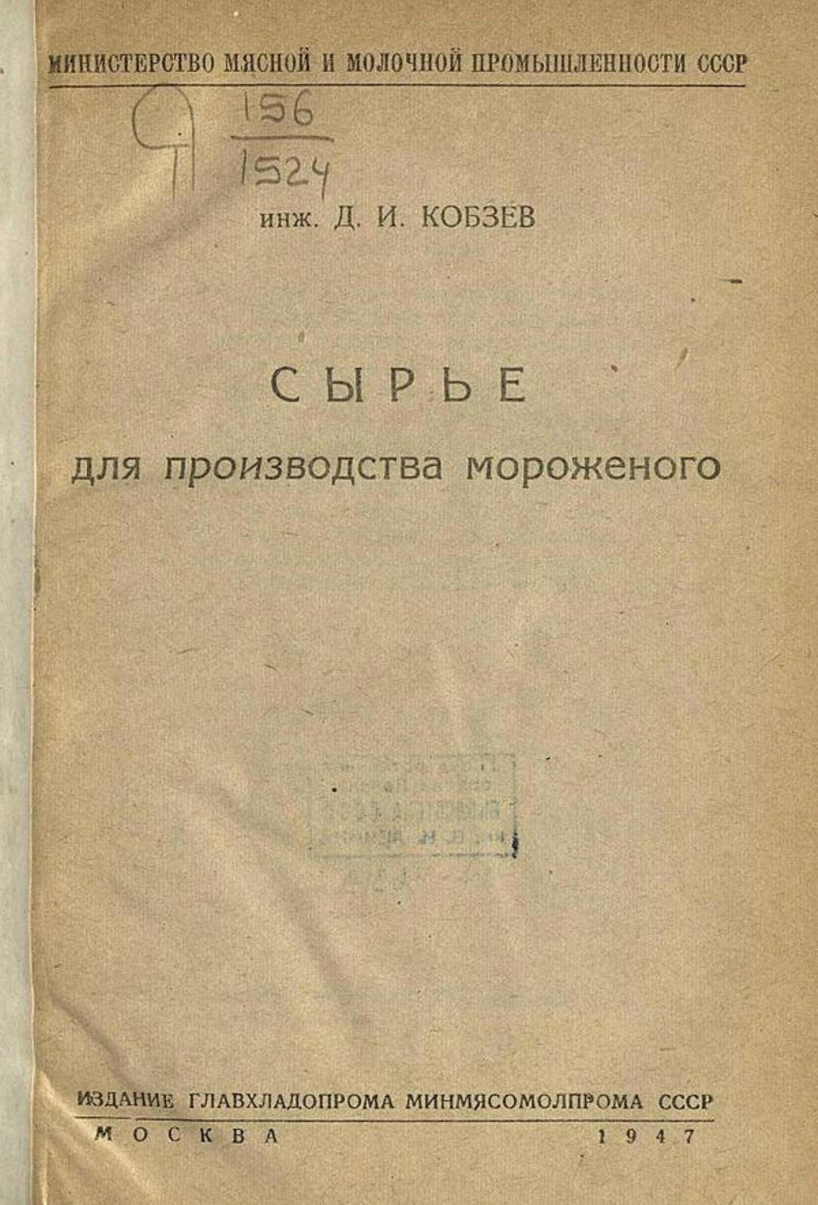 Кобзев, Дмитрий Иванович. Сырье для производства мороженого [Текст] / инж. Д. И. Кобзев ; М-во мясной и молочной пром-сти СССР. — Москва : Главхладопром Минмясомолпрома СССР, 1947 (типолитогр. М-ва мясной и молочной пром-сти СССР). — 138 с. : ил.; 19 см.