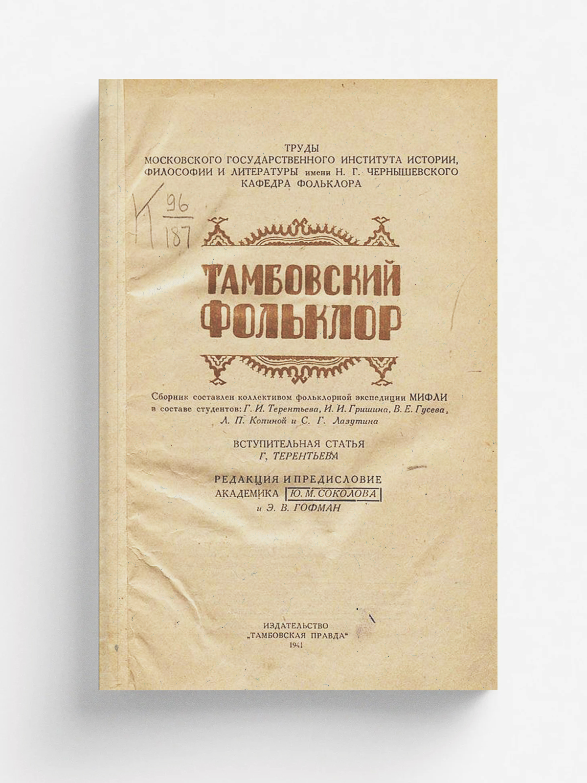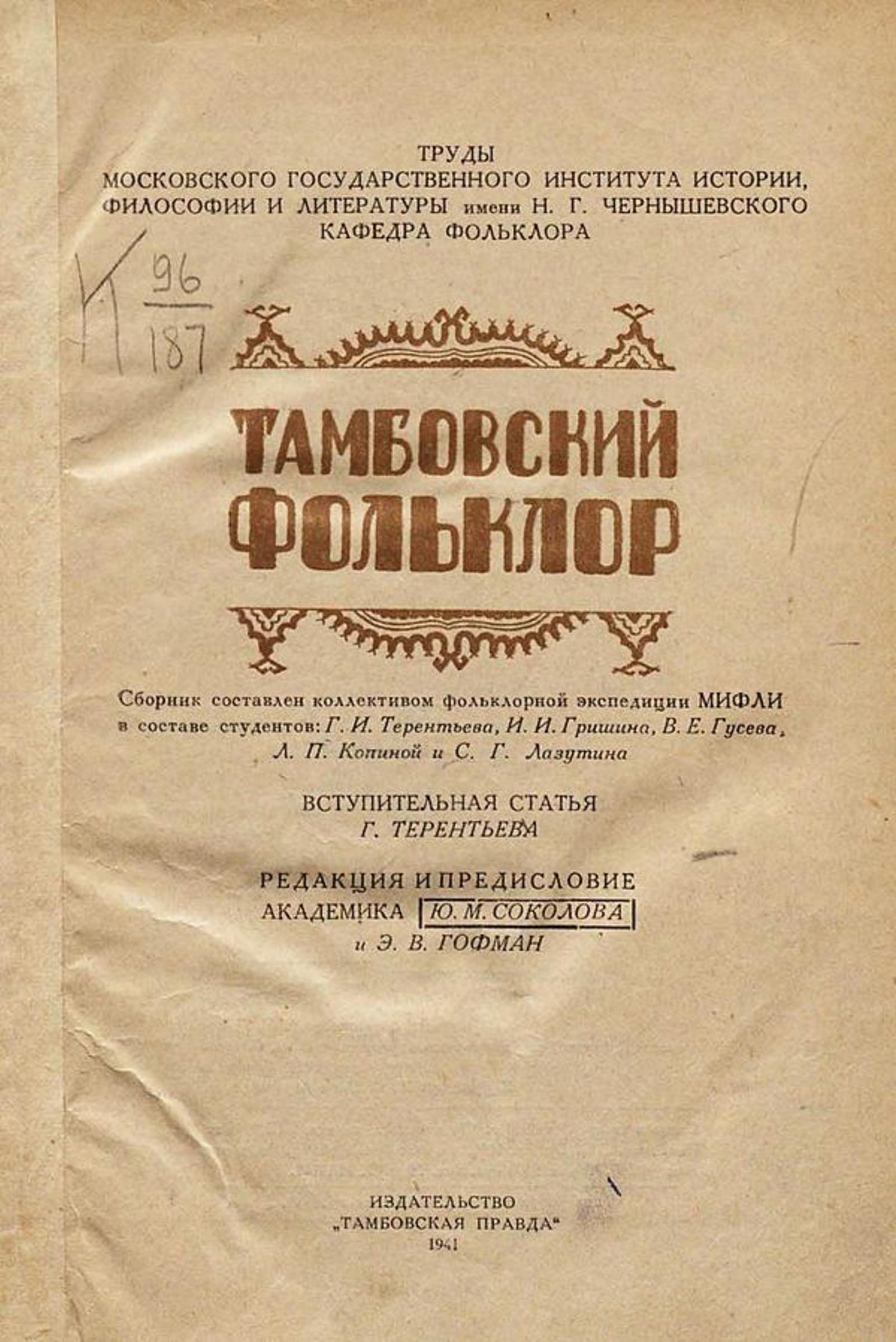 Тамбовский фольклор / Сборник сост. коллективом фольклор. экспедиции МИФЛИ в составе студентов: Г. И. Терентьева, И. И. Гришина, В. Е. Гусева [и др.]; Вступ. статья Г. Терентьева; Ред. и предисл. акад. Ю. М. Соколова и Э. В. Гофман. — [Тамбов] : Тамб. правда, 1941. — 324 с. с заставками; 21 см. — (Труды Московского института истории, философии и литературы им. Н. Г. Чернышевского, Кафедра фольклора).