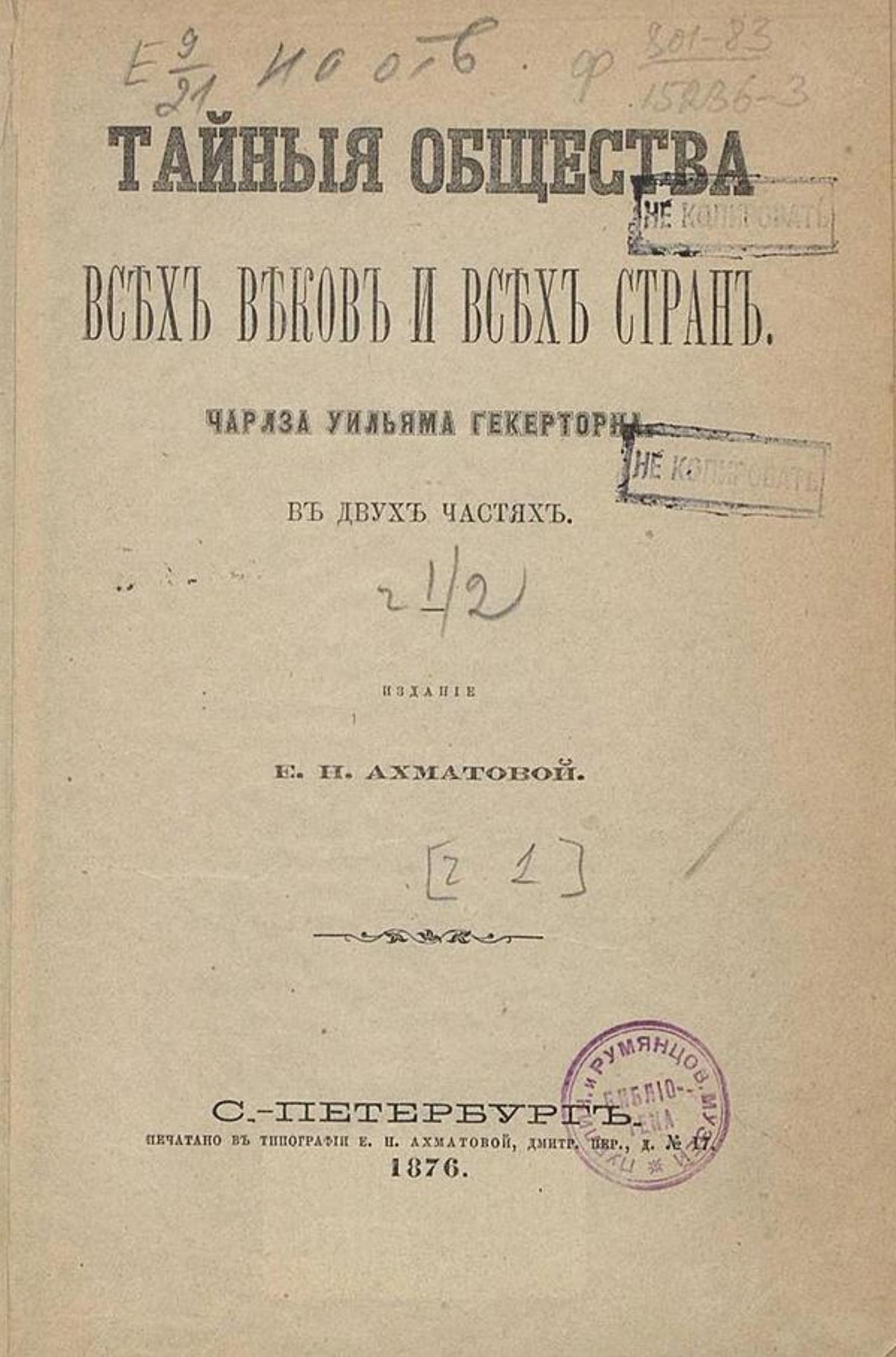 Гекеторн, Чарлз Уильям (1826–1902). Тайные общества всех веков и всех стран [Текст] : в двух частях / [соч.] Чарлза Уильяма Гекерторна. — С.-Петербург : издание Е. Н. Ахматовой : печатано в тип. Е. Н. Ахматовой, 1876. — 22 см. Ч. 1. — 1876. — XVI, 304 с.