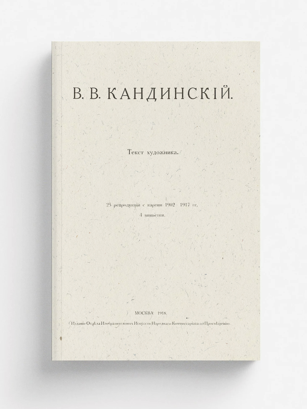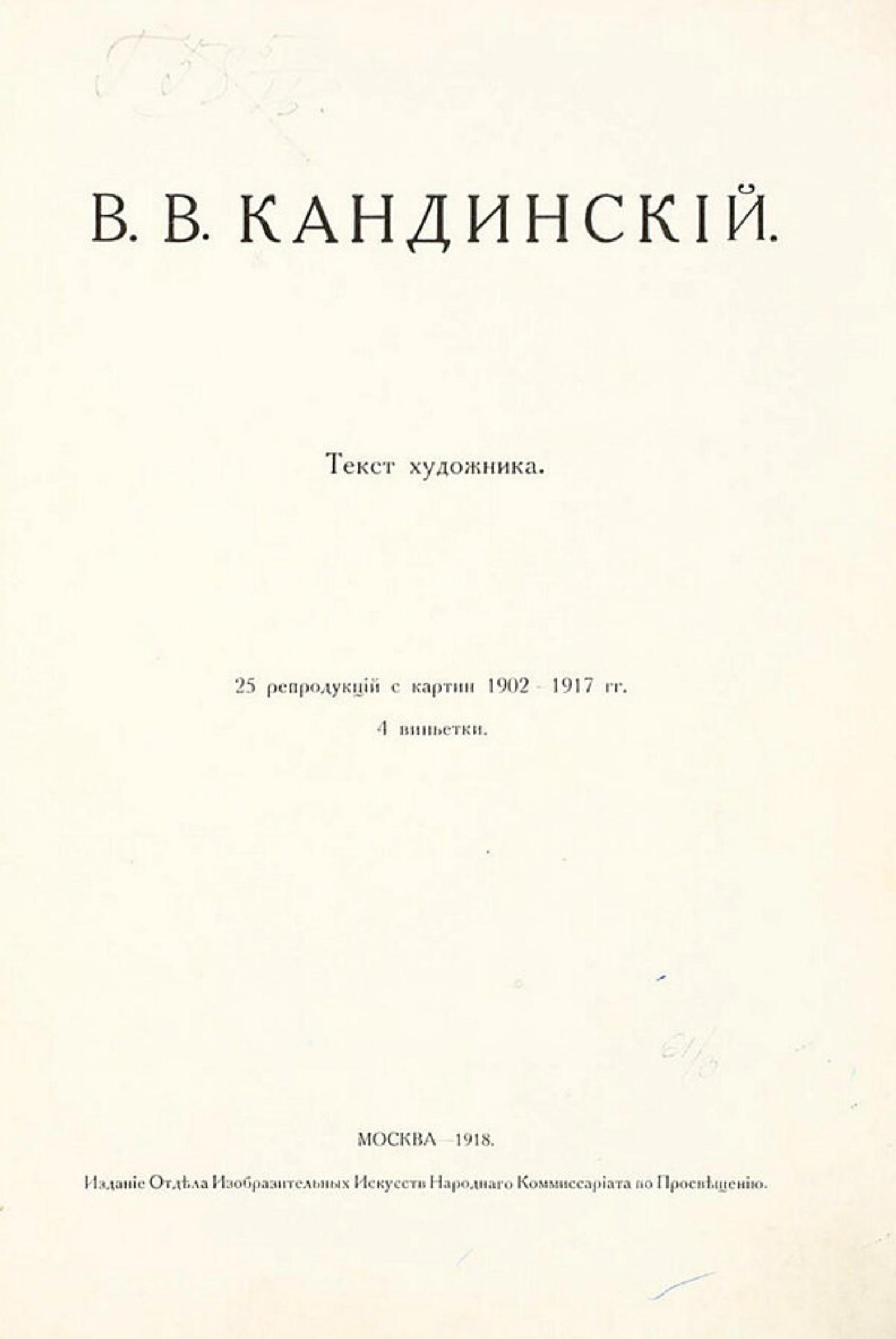 В. В. Кандинский : Текст художника : 25 репродукций с картин 1902–1917 г.г. 4 виньетки. — М. : Отд. изобраз. искусств Нар. ком. по прос., 1918. — 56, [2] с. : ил., портр. ; 30 см.